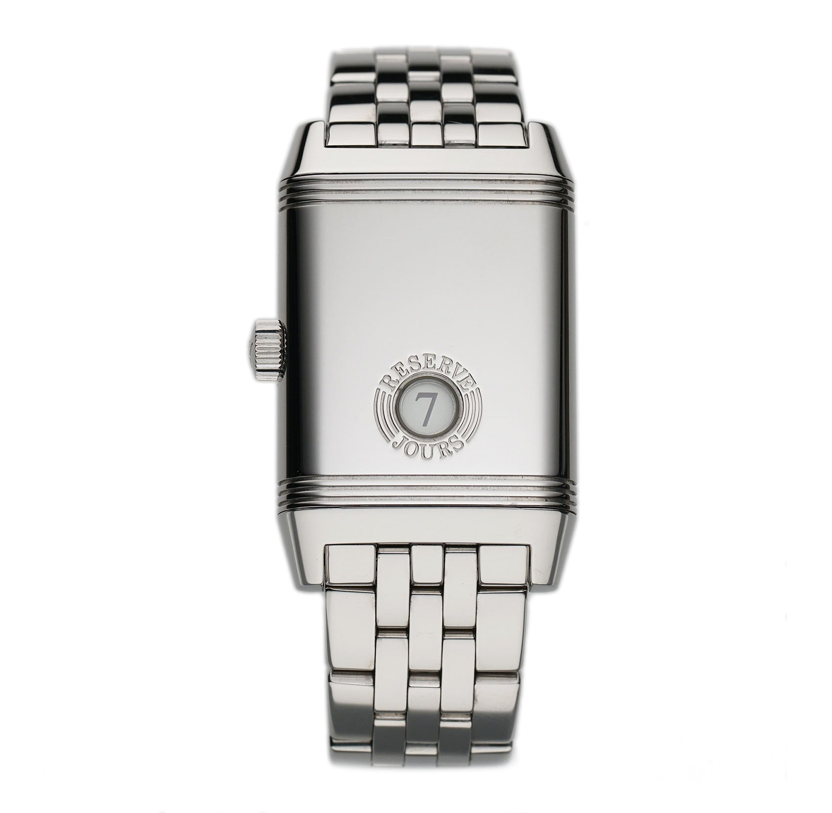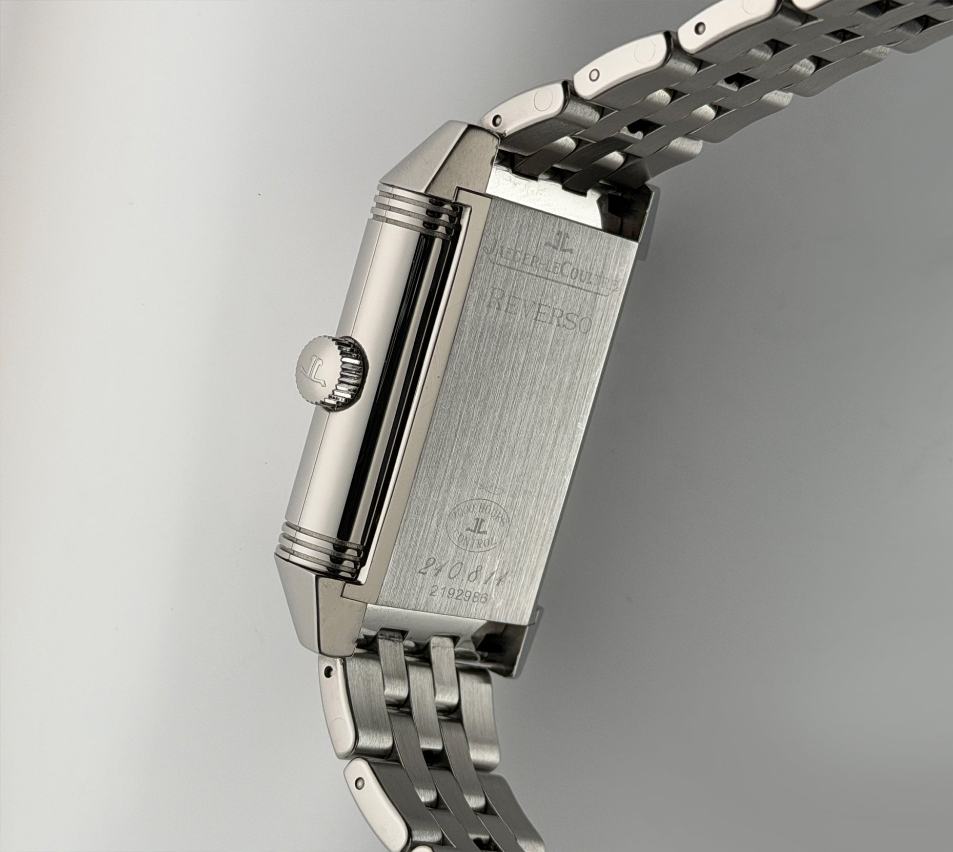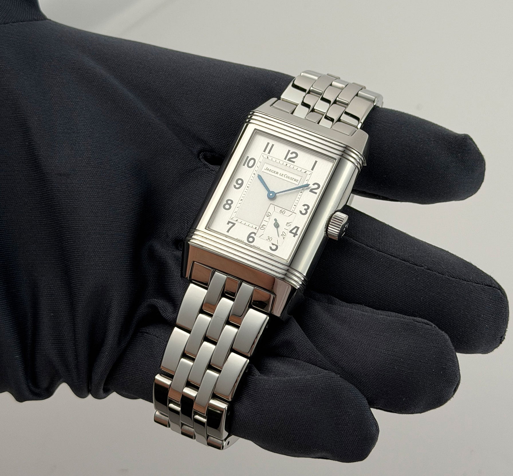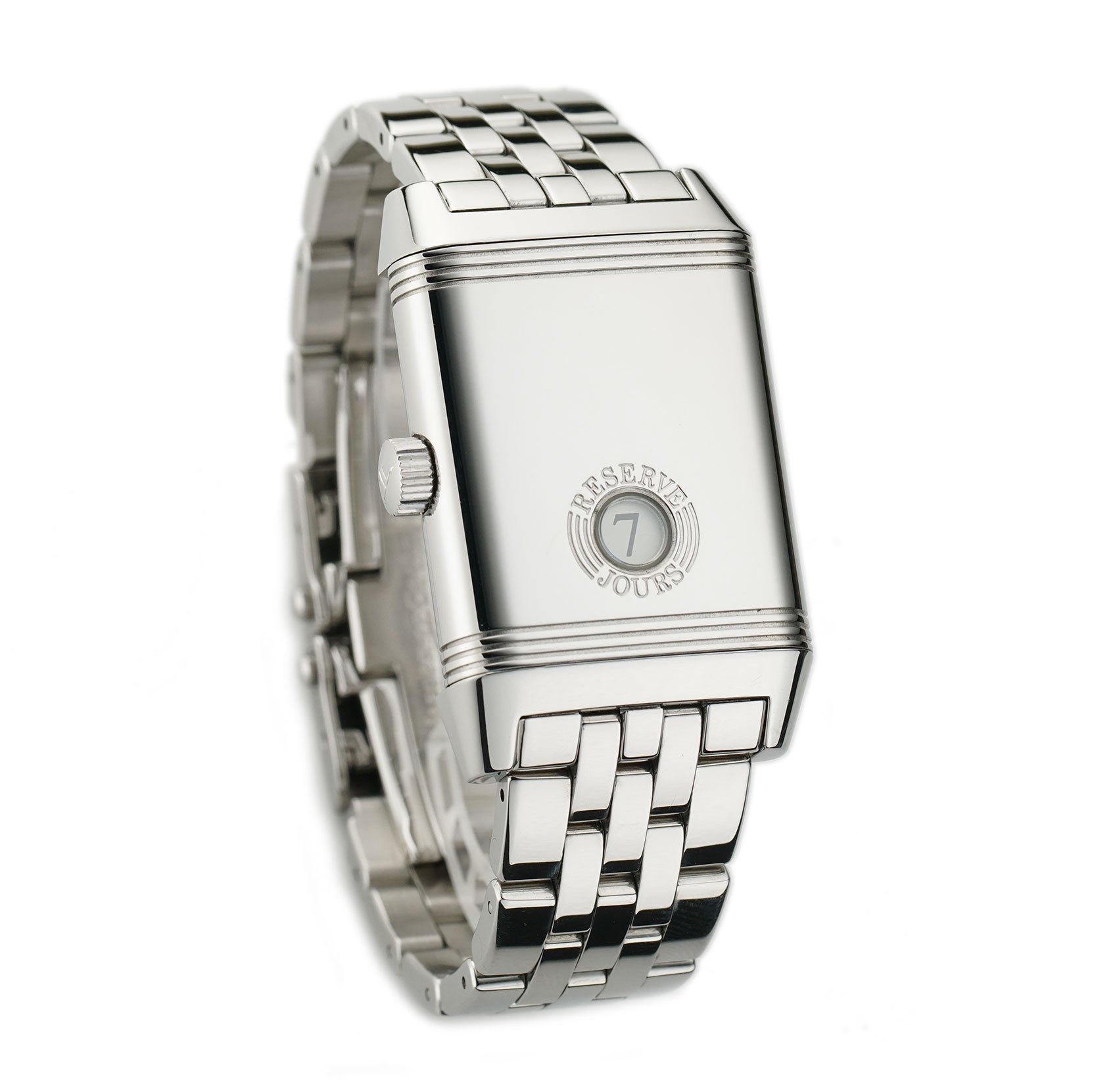 The main face features the traditional Reverso dial with a silver dial accompanied by blued steel hands and black Arabic numeral hour markers. A small seconds sub-dial is located on the bottom right corner. As for the reverse face, it is mostly solid stainless steel with a mirror finish but does have a window at 6 o'clock indicating the days of power reserve remaining.