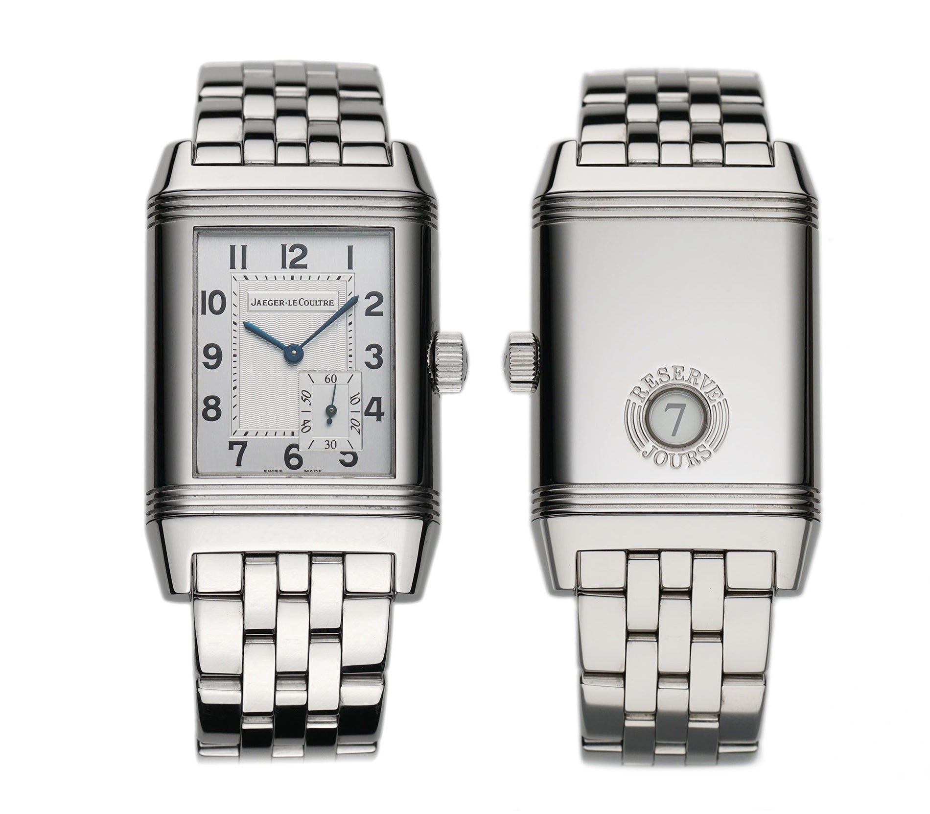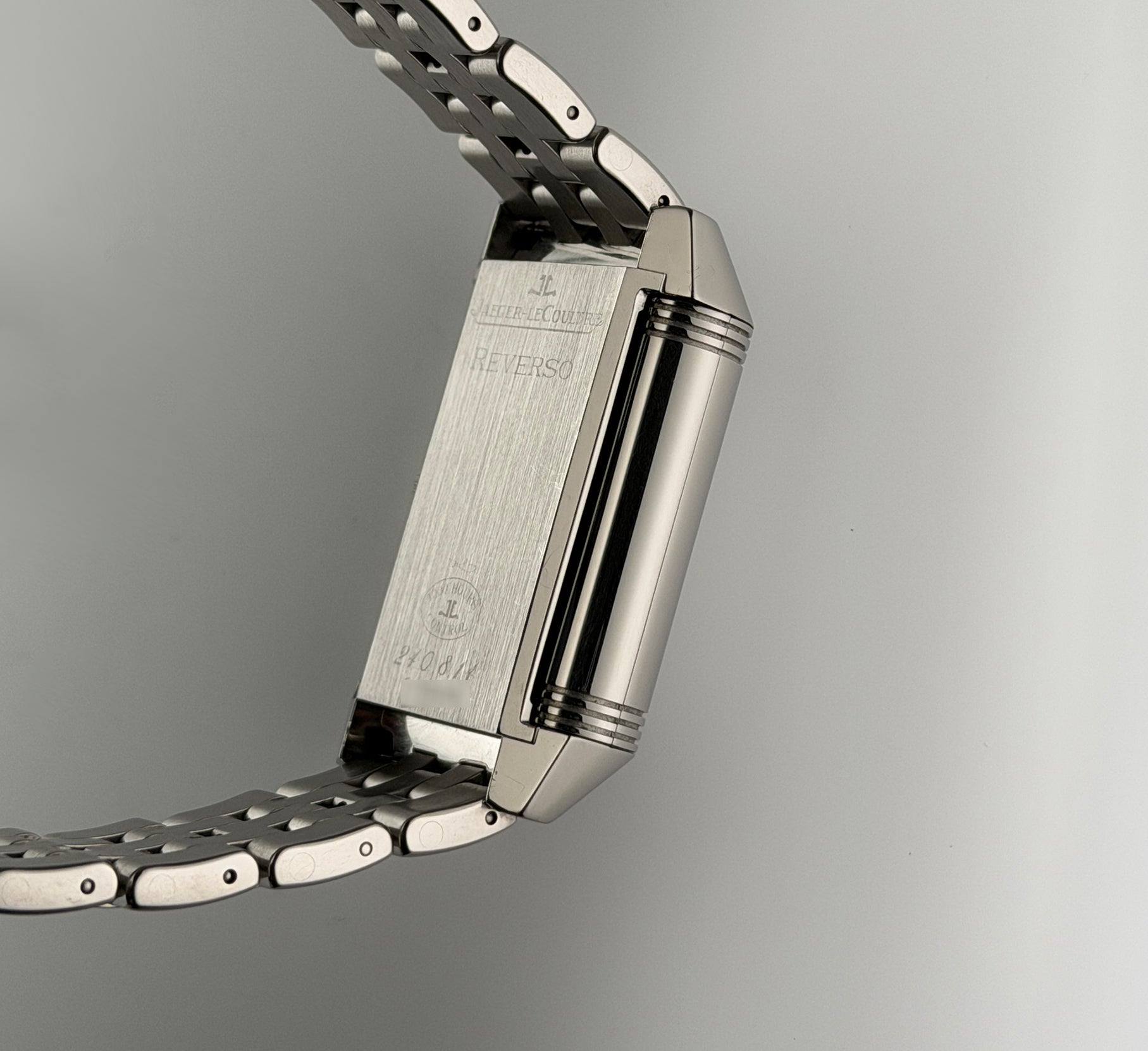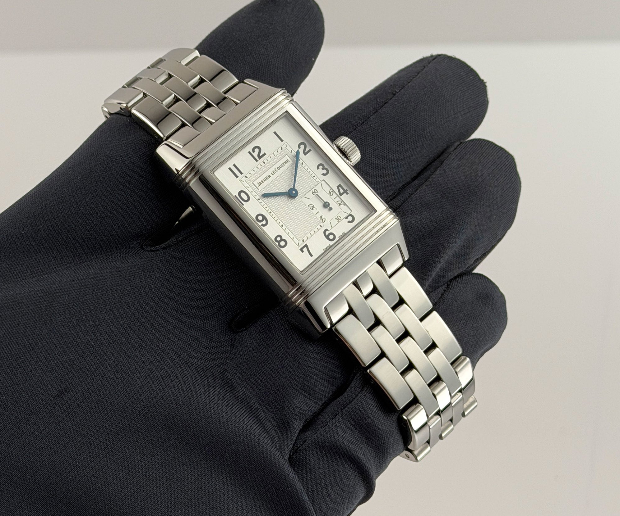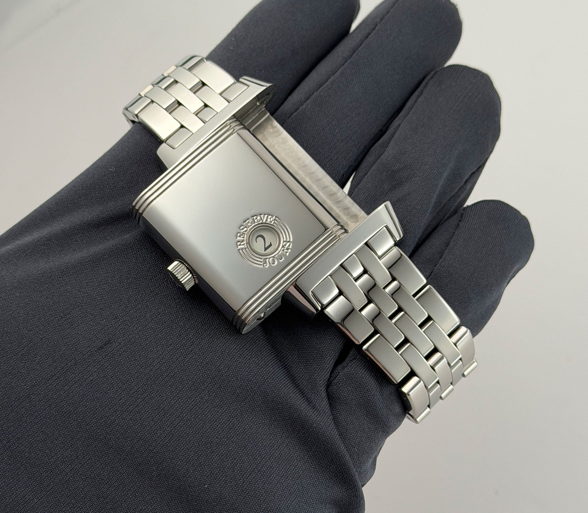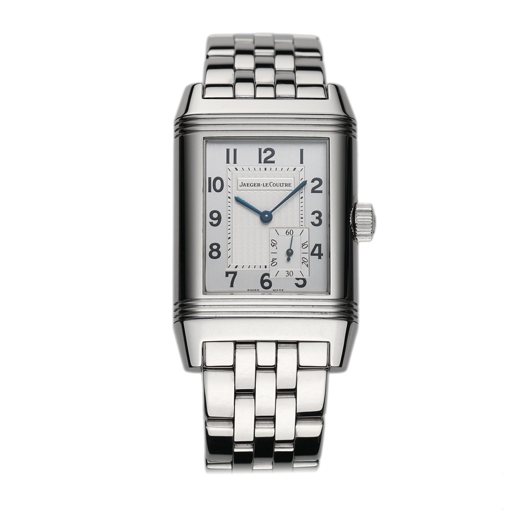 The main face features the traditional Reverso dial with a silver dial accompanied by blued steel hands and black Arabic numeral hour markers. A small seconds sub-dial is located on the bottom right corner. As for the reverse face, it is mostly solid stainless steel with a mirror finish but does have a window at 6 o'clock indicating the days of power reserve remaining.