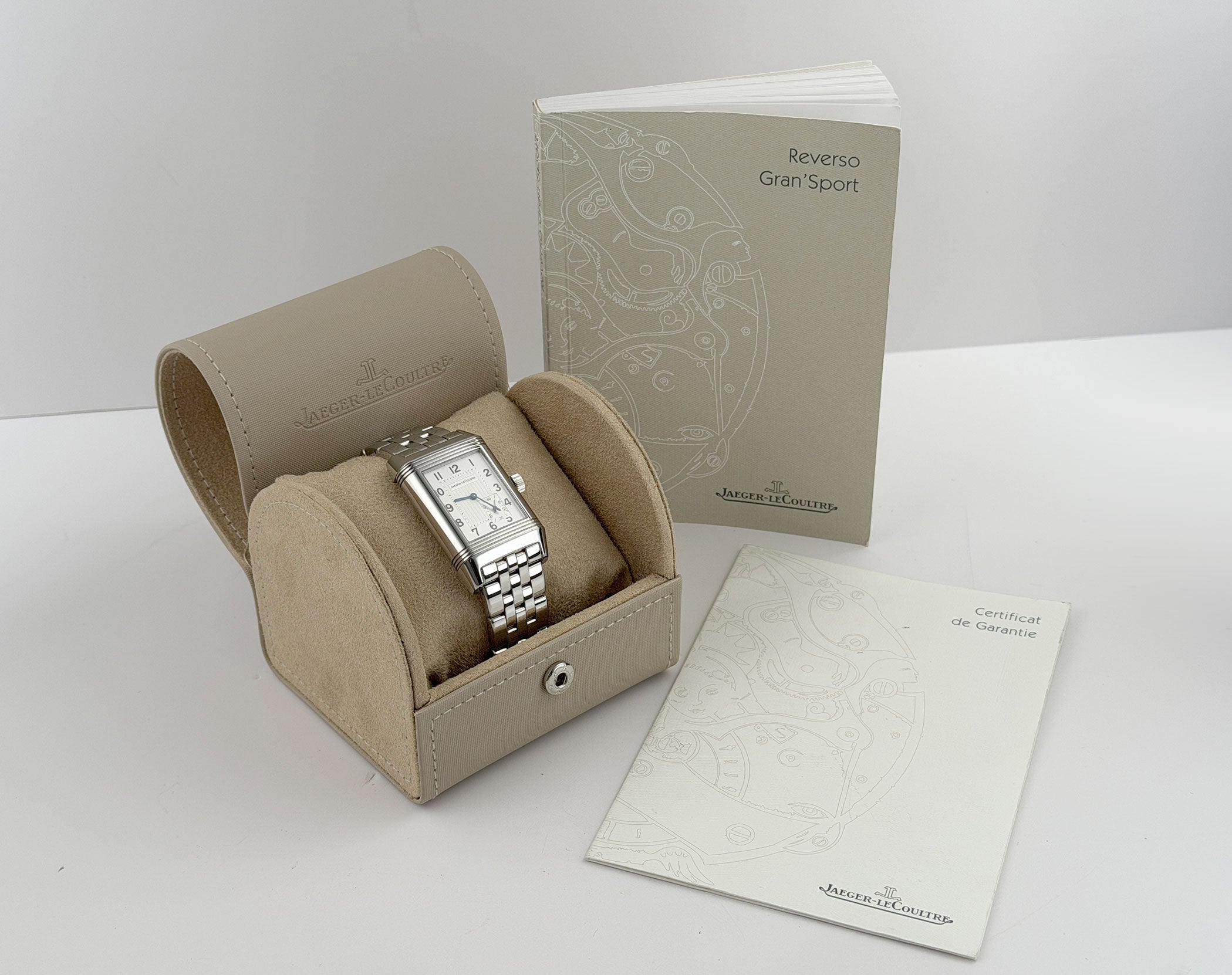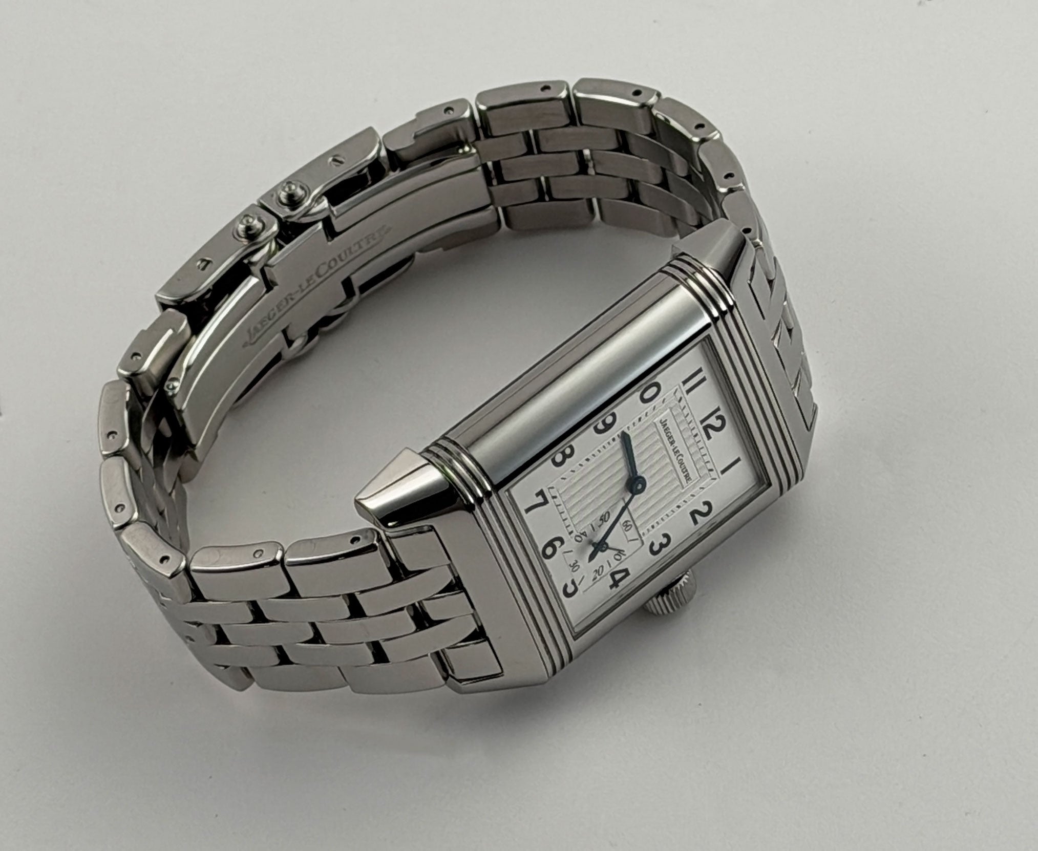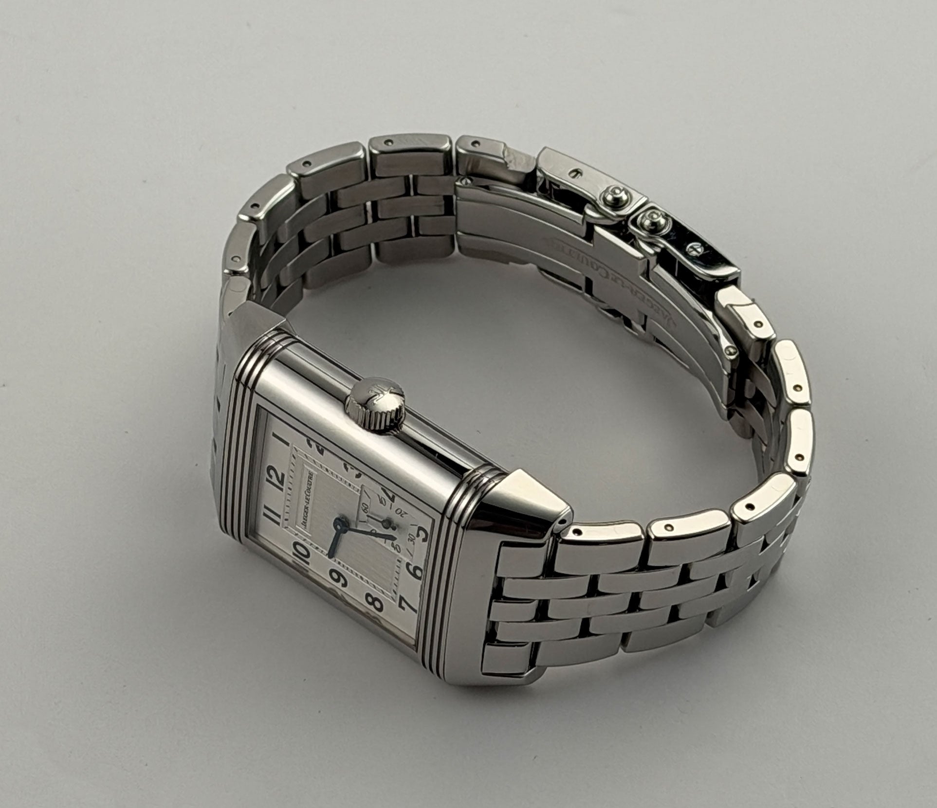This Reverso Grande Reserve 240.8.14 is in excellent condition for a previously enjoyed watch, carefully worn throughout the years. The case does have areas of mirror-like finish which are prone to hairlines (marks visible when with high resolution cameras or if angled at certain lighting). Pictures are part of the description so please refer to the pictures in determining the condition, pictures are of the exact watch being offered.
