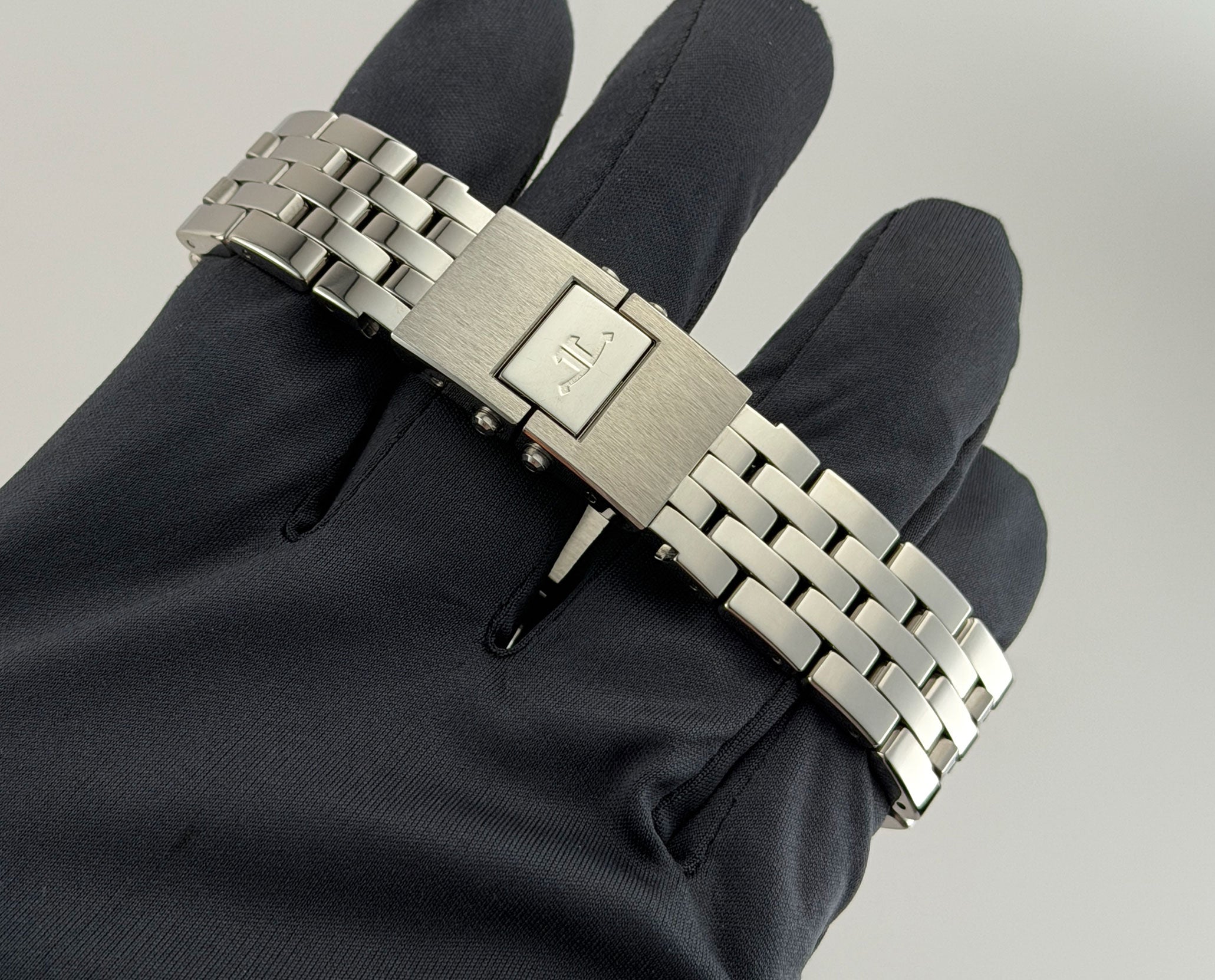 The case is made of stainless steel, mostly displaying a mirror finish with the exception of the case back which has a satin finish and the inner carriage that has a perlage finish. It is mounted on a stainless steel JLC bracelet also of a mirror finish (fits up to an approximate 7 inch wrist) and that is paired with a stainless steel JLC double-folding deployment clasp.