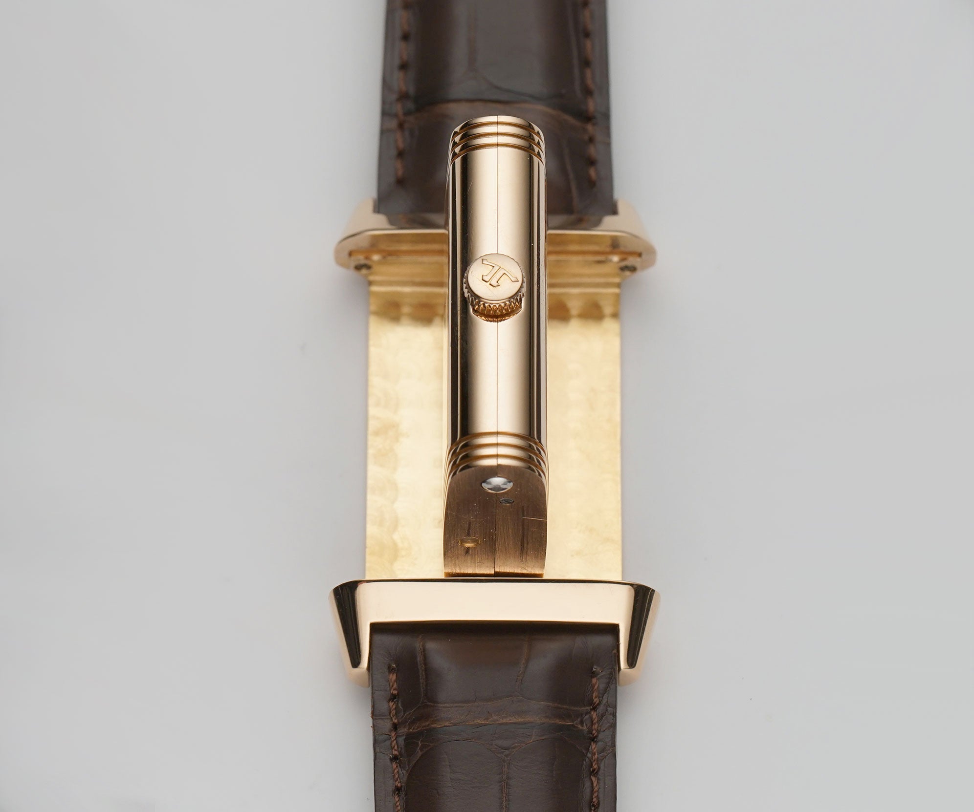 The case is made of 18k rose gold, most of which has a mirror-like finish with the exception of the case back which features a satin finish and the inner carriage which displays a spun finish. The watch is currently mounted on an unworn brown leather Jean Rousseau (Paris-made) strap that is paired with an 18k rose gold JLC deployment buckle.