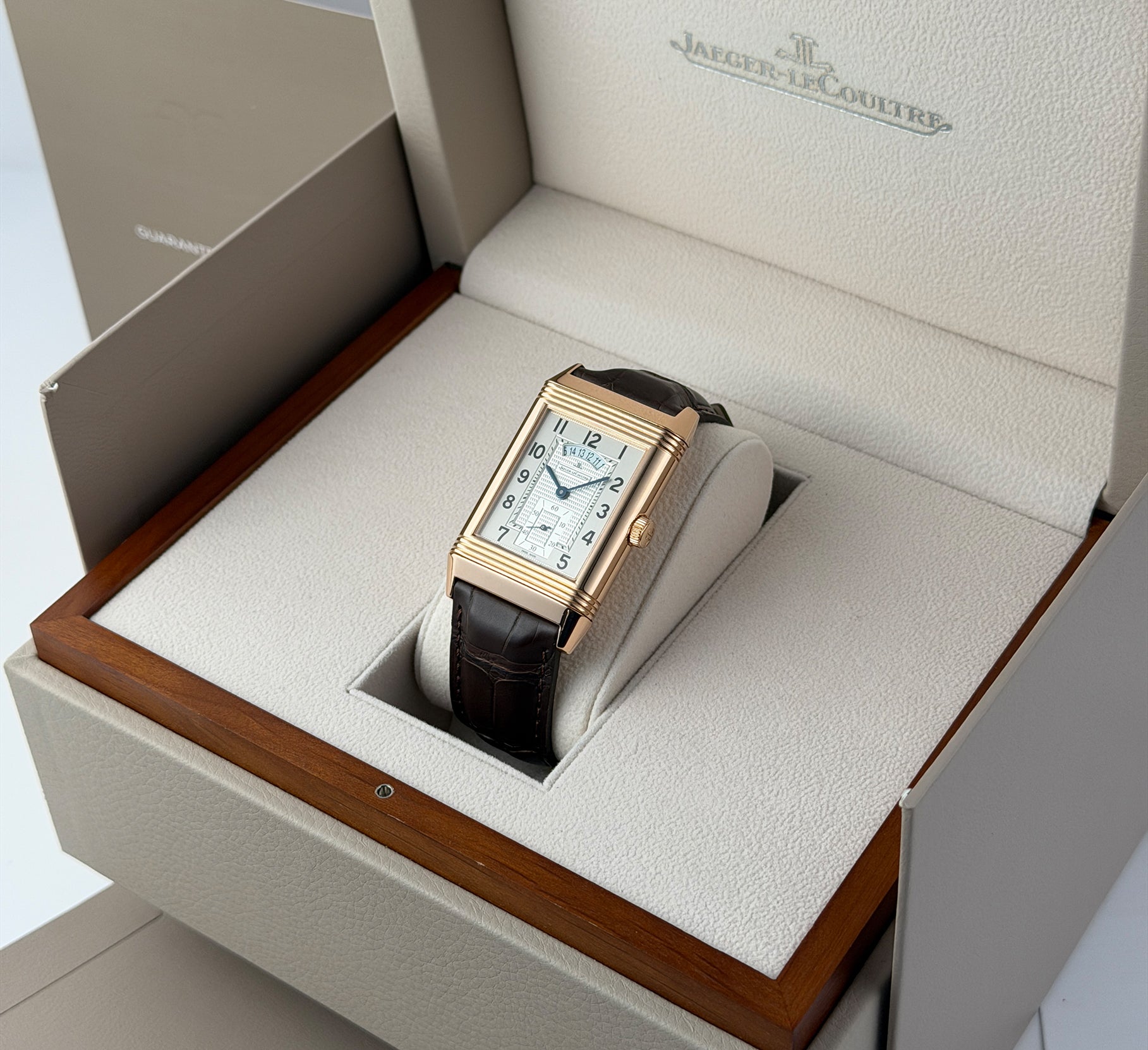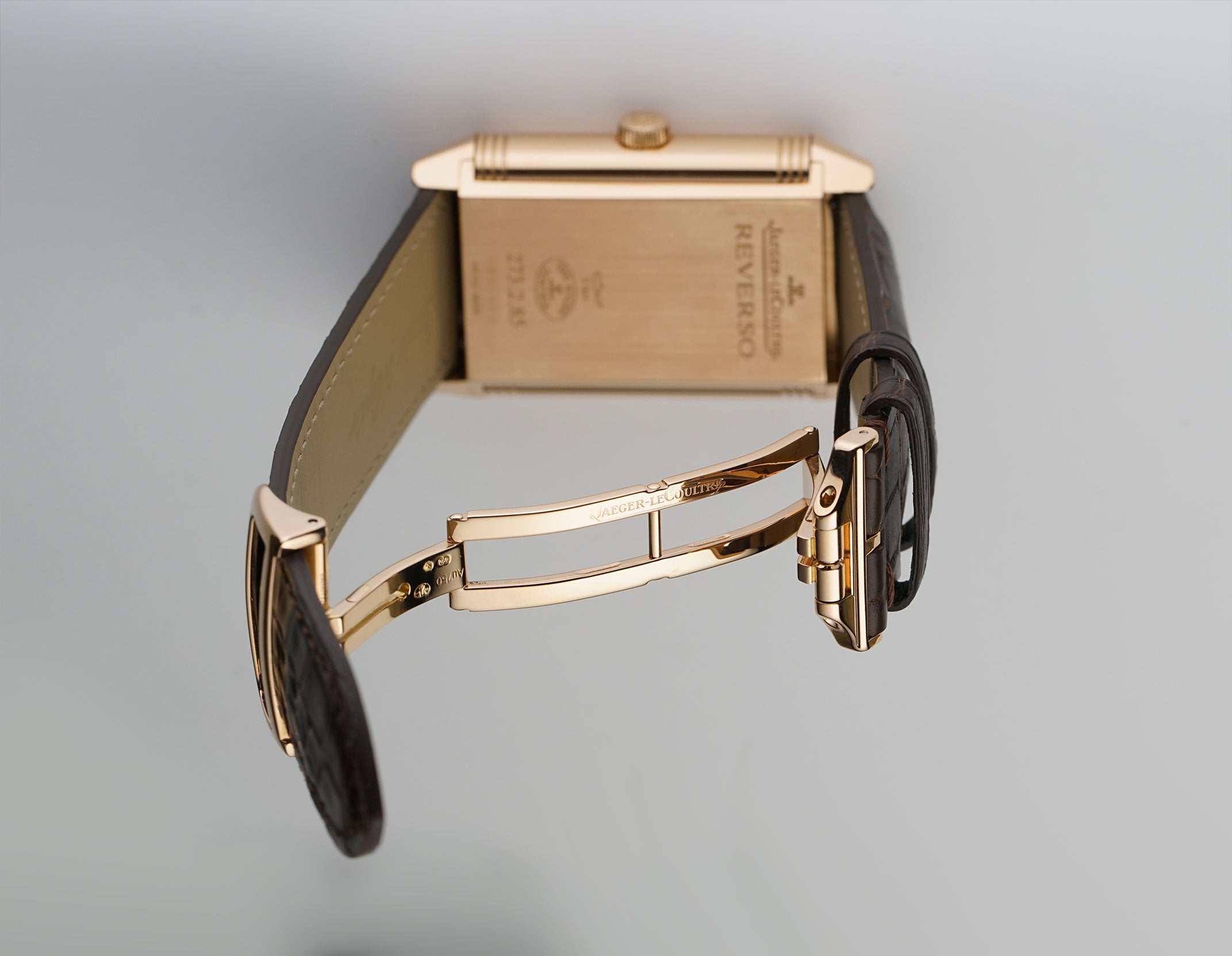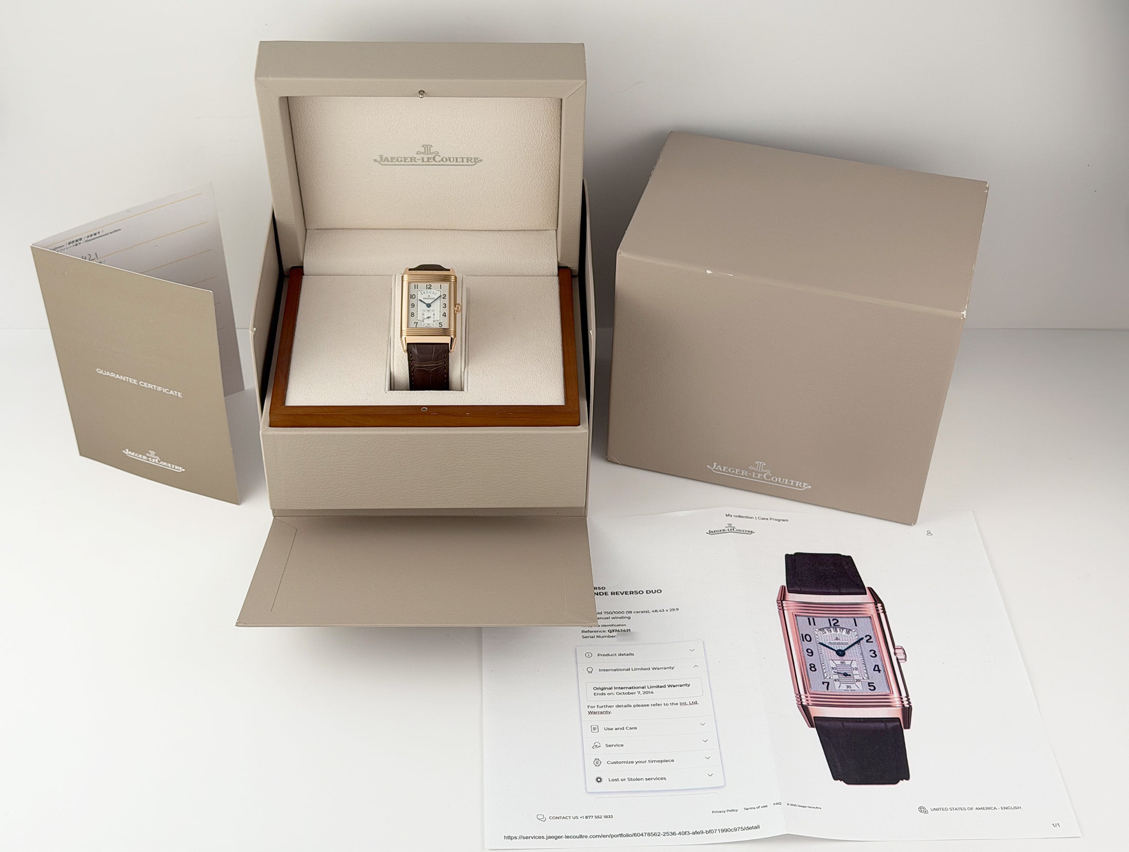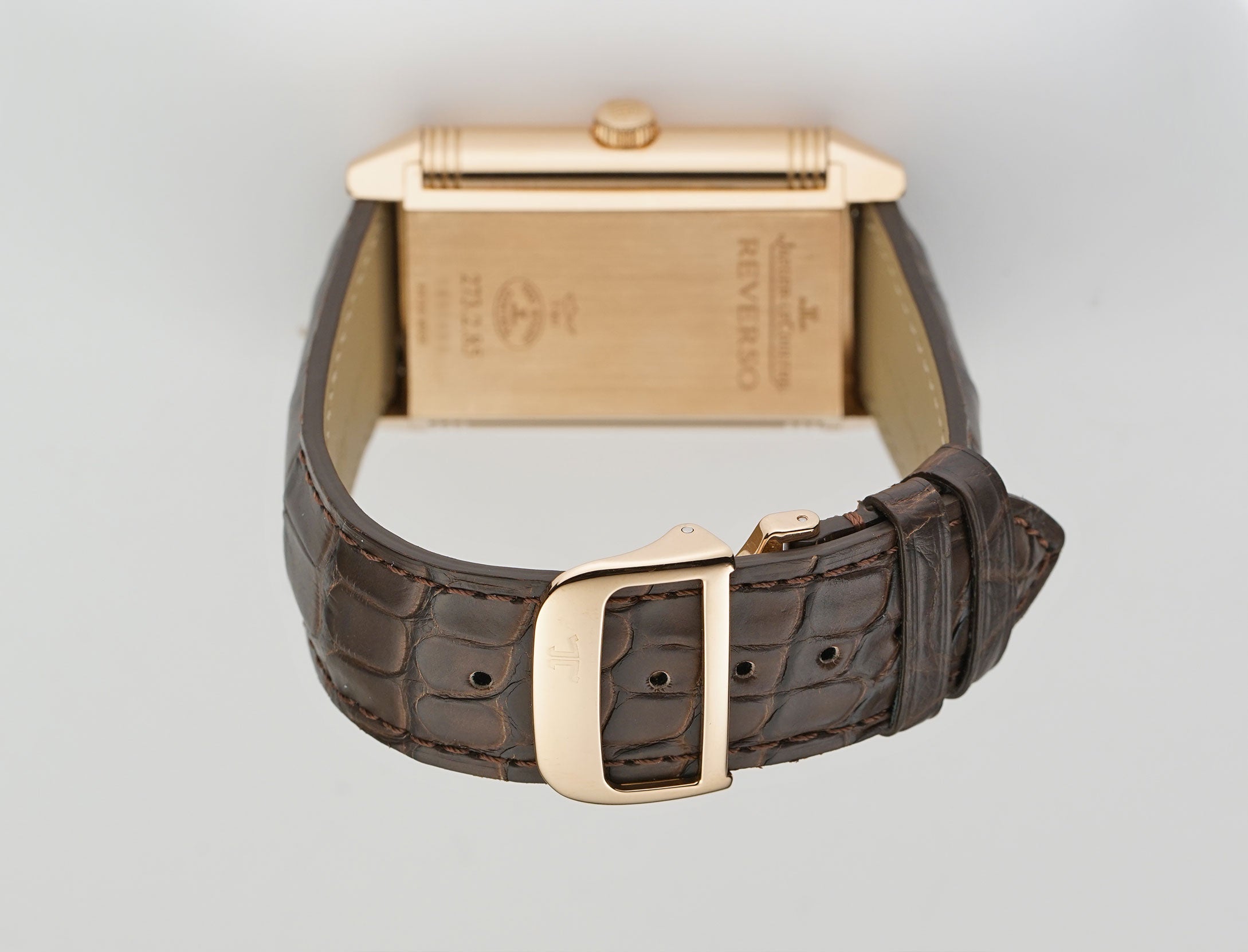 The condition of this Grande Reverso Duo 273.2.85 is outstanding. The case does have areas of mirror-like finish which are prone to hairlines (marks visible when with high resolution cameras or if angled at certain lighting). Pictures are part of the description so please refer to the pictures in determining the condition, pictures are of the exact watch being offered.