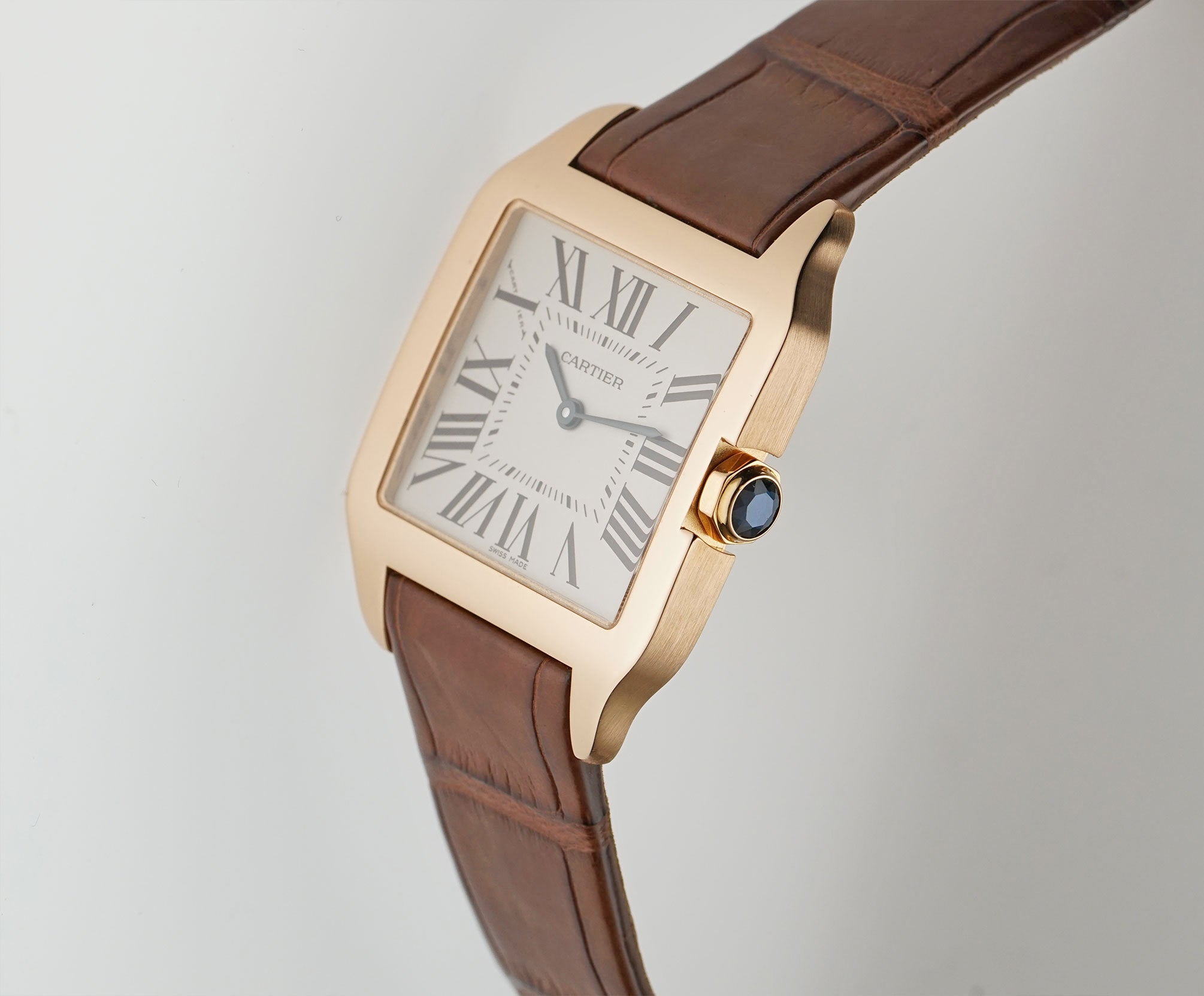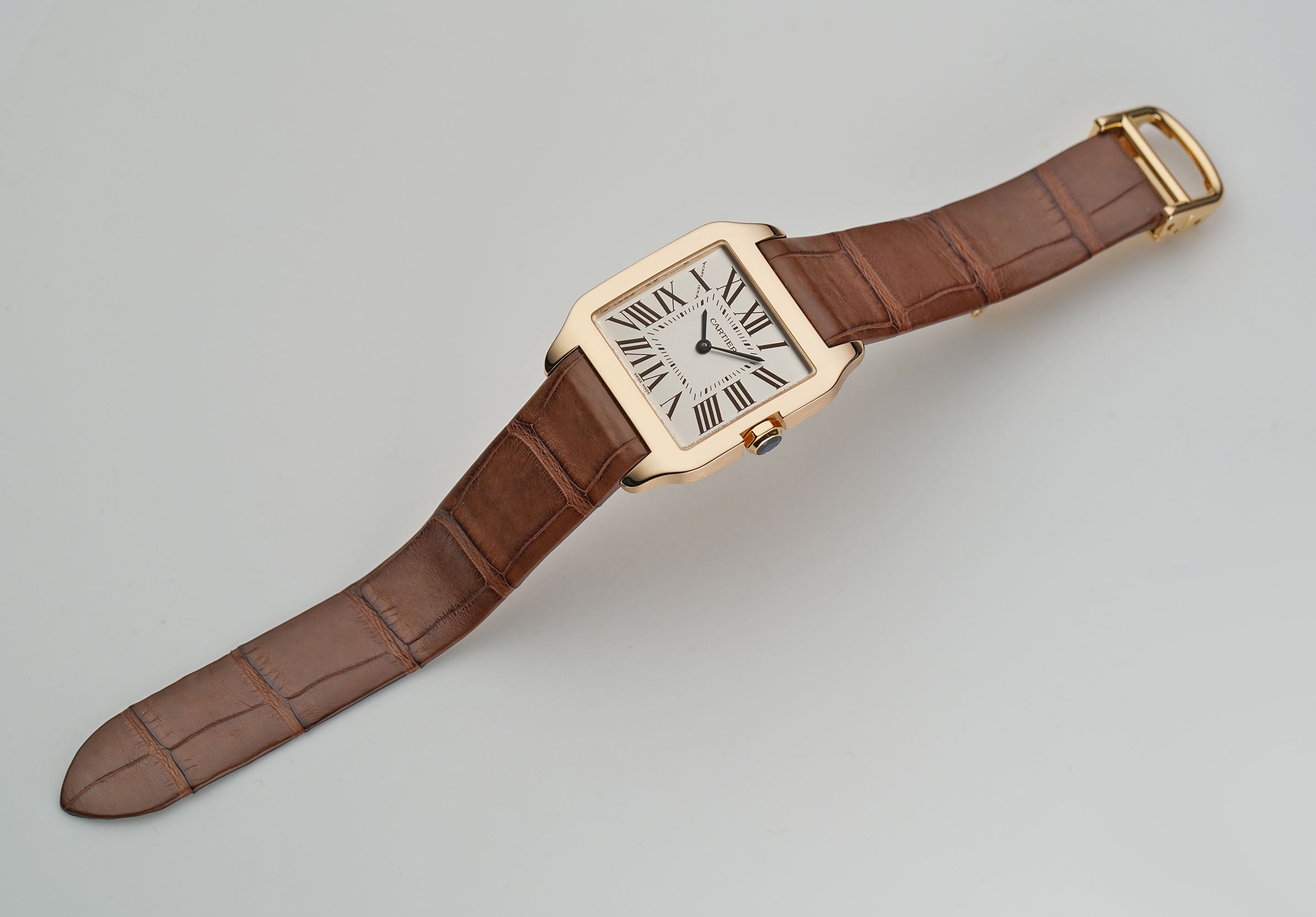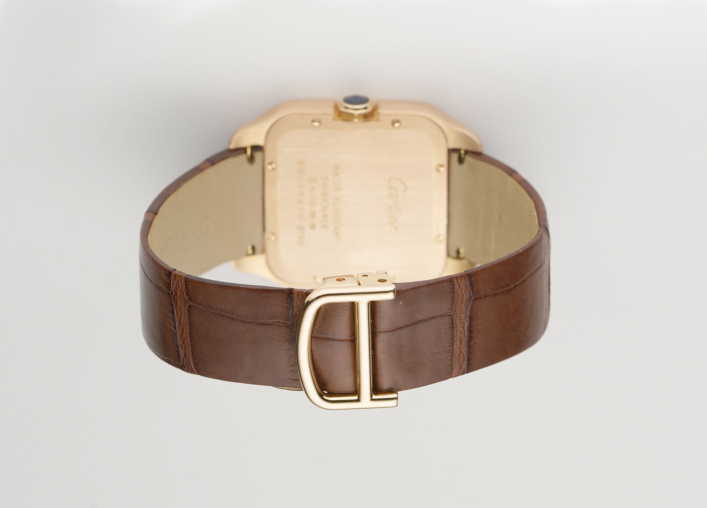 The case is made of 18k rose gold with the bezel and lugs displaying a mirror finish while the sides and case back are of a satin finish. It is presented on an unworn brown leather Cartier strap that is paired with a Cartier 18k rose gold deployment buckle.
