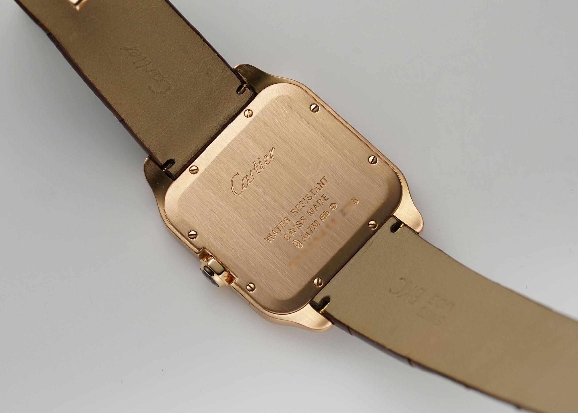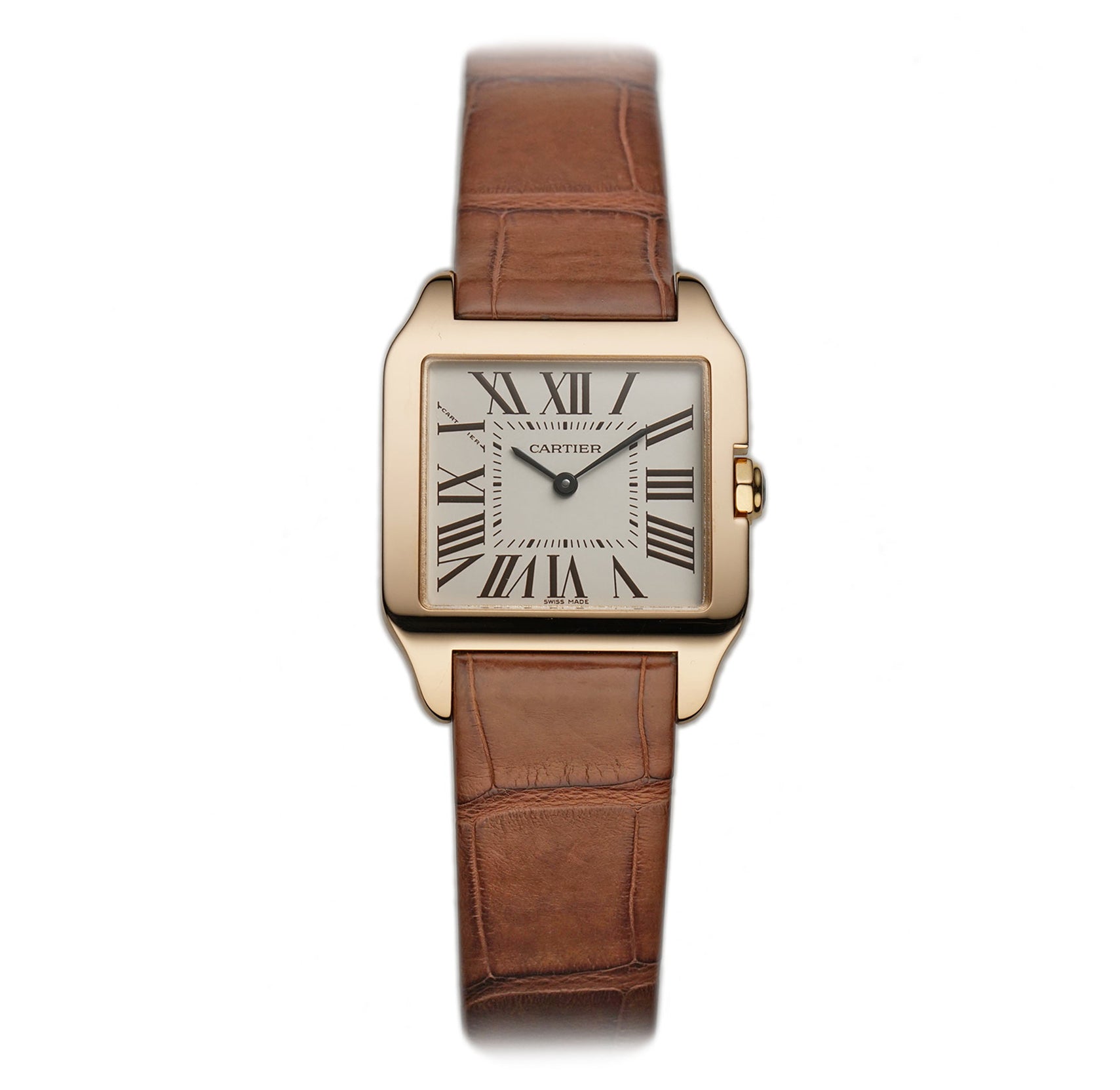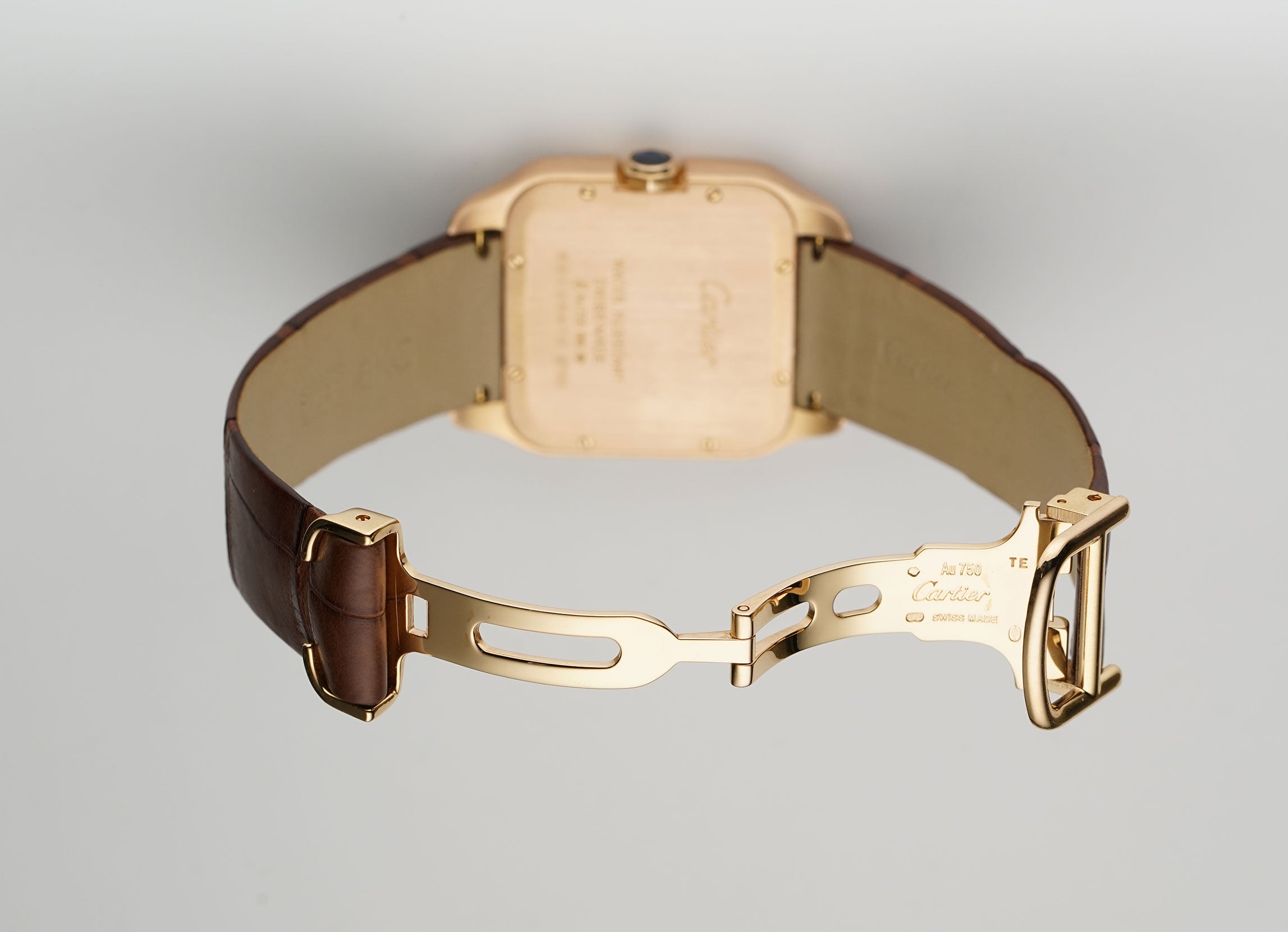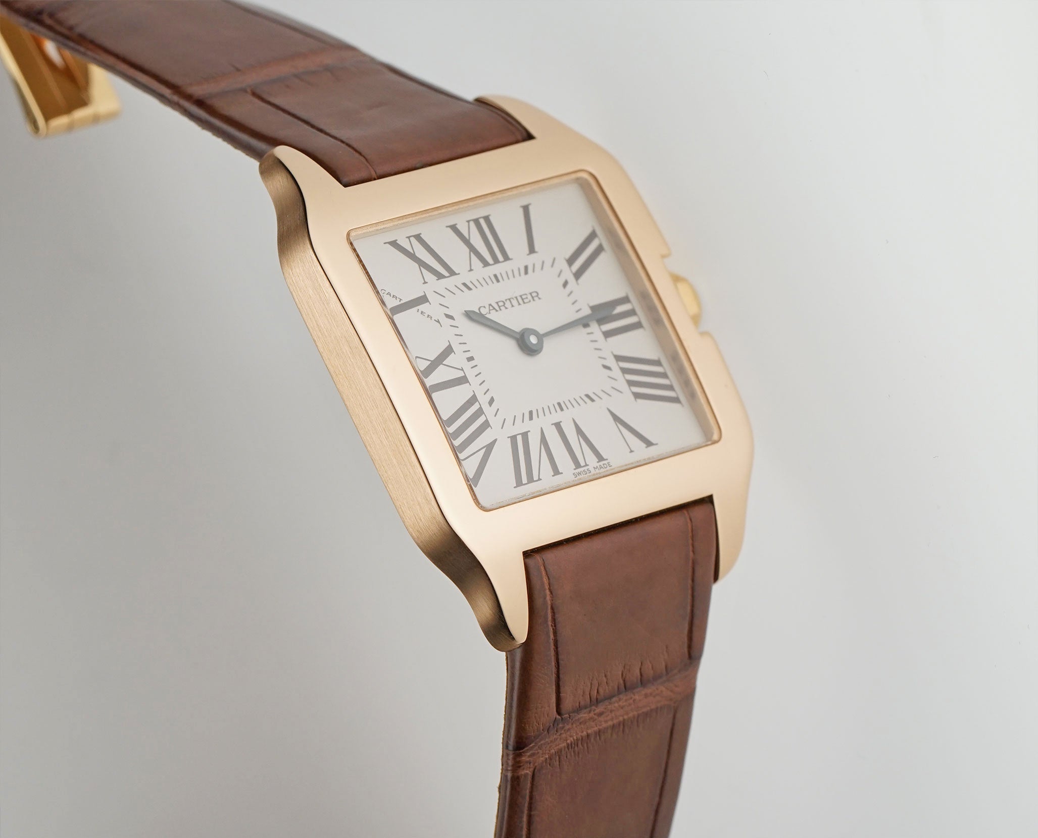 The case is made of 18k rose gold with the bezel and lugs displaying a mirror finish while the sides and case back are of a satin finish. It is presented on an unworn brown leather Cartier strap that is paired with a Cartier 18k rose gold deployment buckle.
