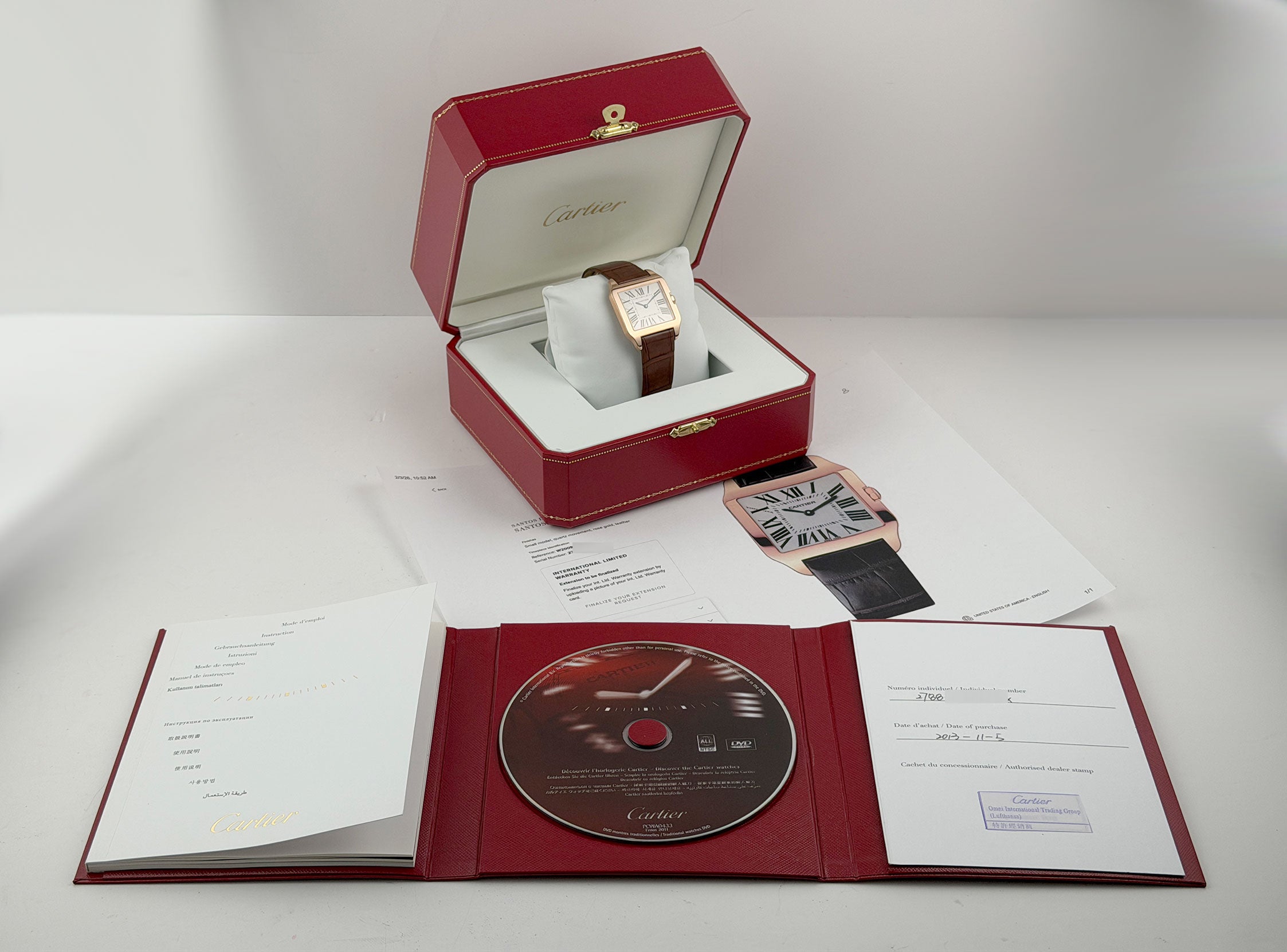 Included with the watch are Cartier box and papers, dated 2013.