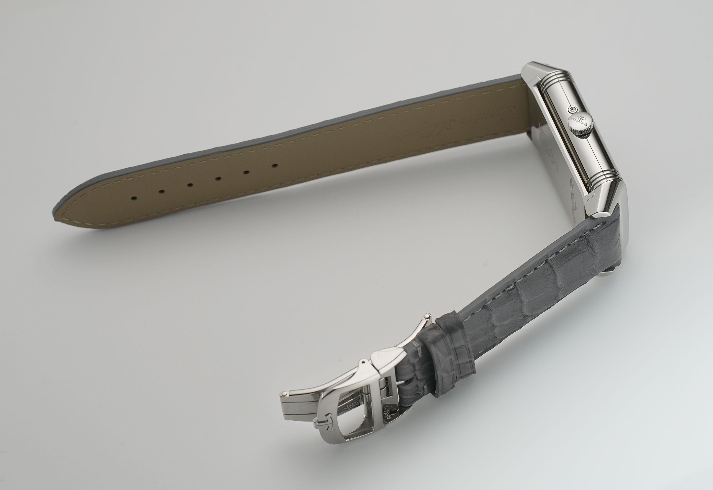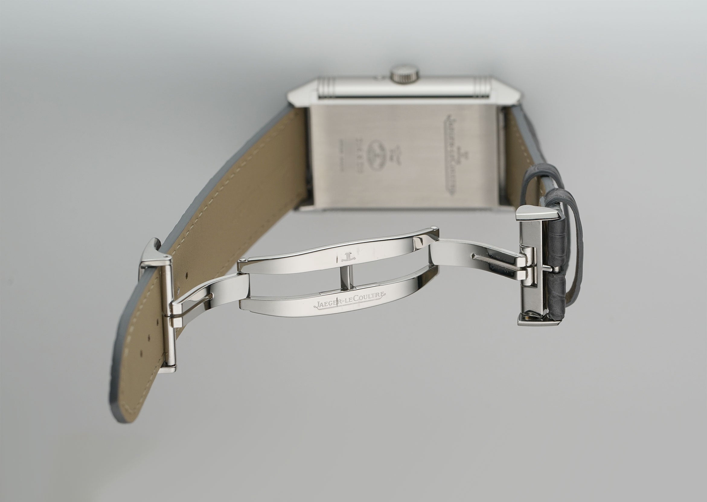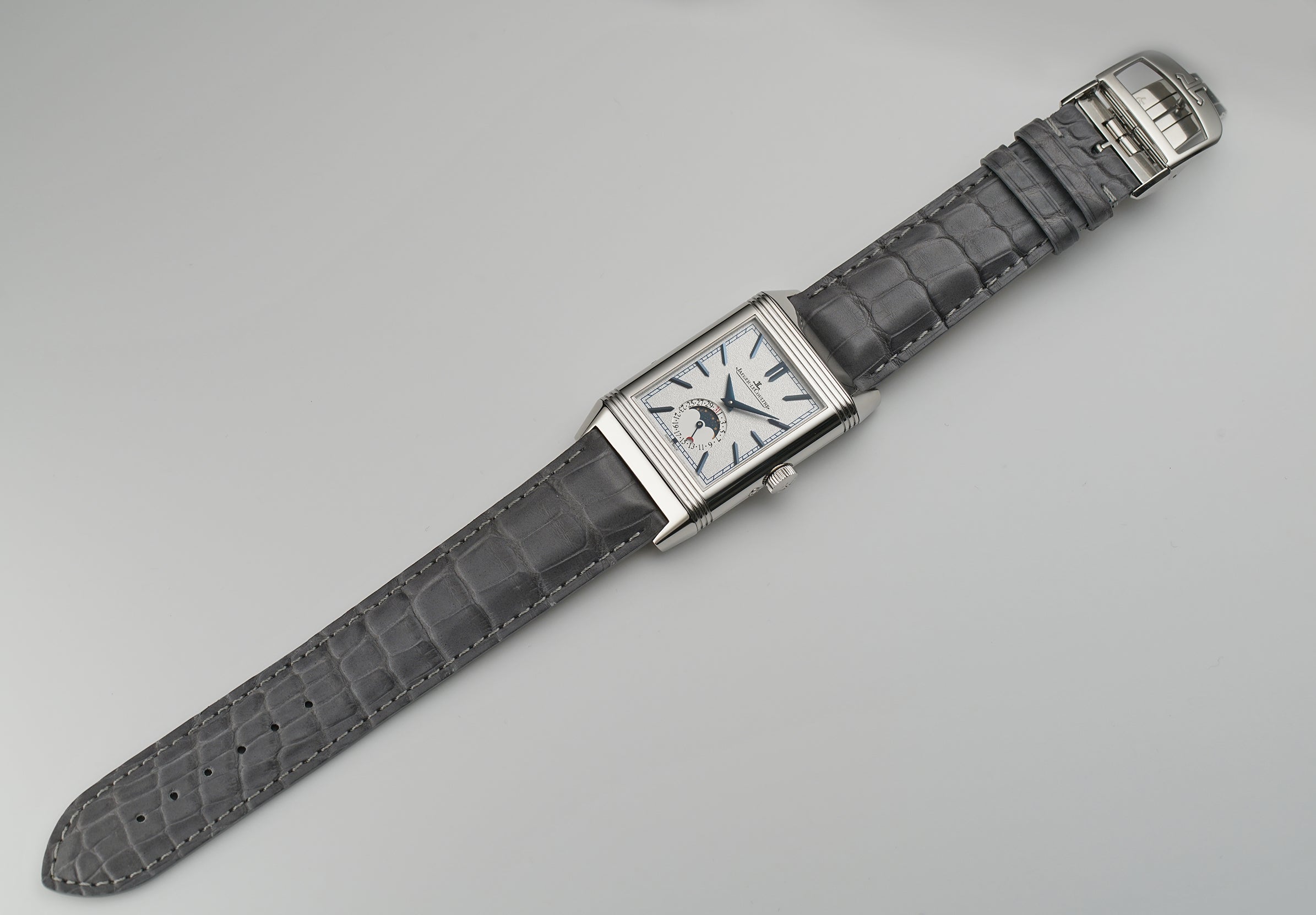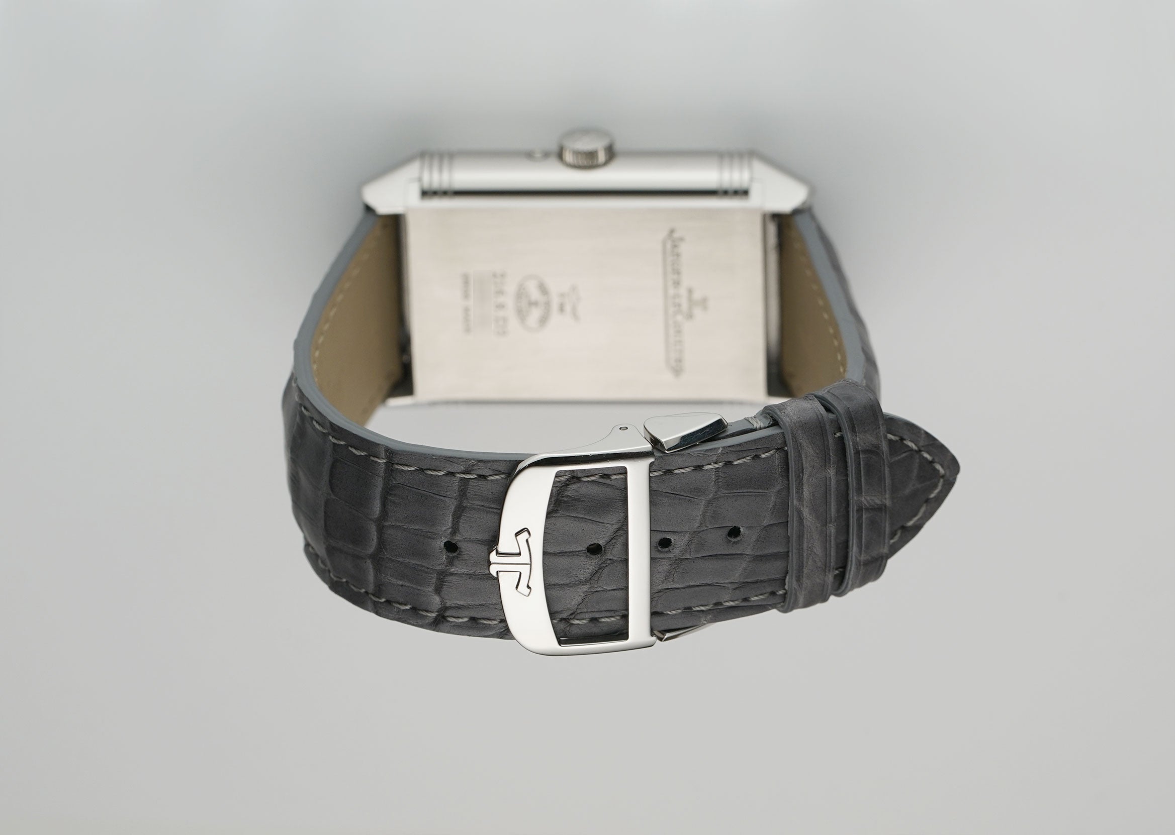 The case is made of stainless steel, mostly displaying a mirror finish while the case back has a satin finish and the inner carriage displays a sunray finish. The watch is currently mounted on an unworn grey John Rousseau (high-quality Paris made) leather strap that is paired with a JLC stainless steel double-folding deployment buckle. The strap does have a slight hint of blue which compliments the watch perfectly.