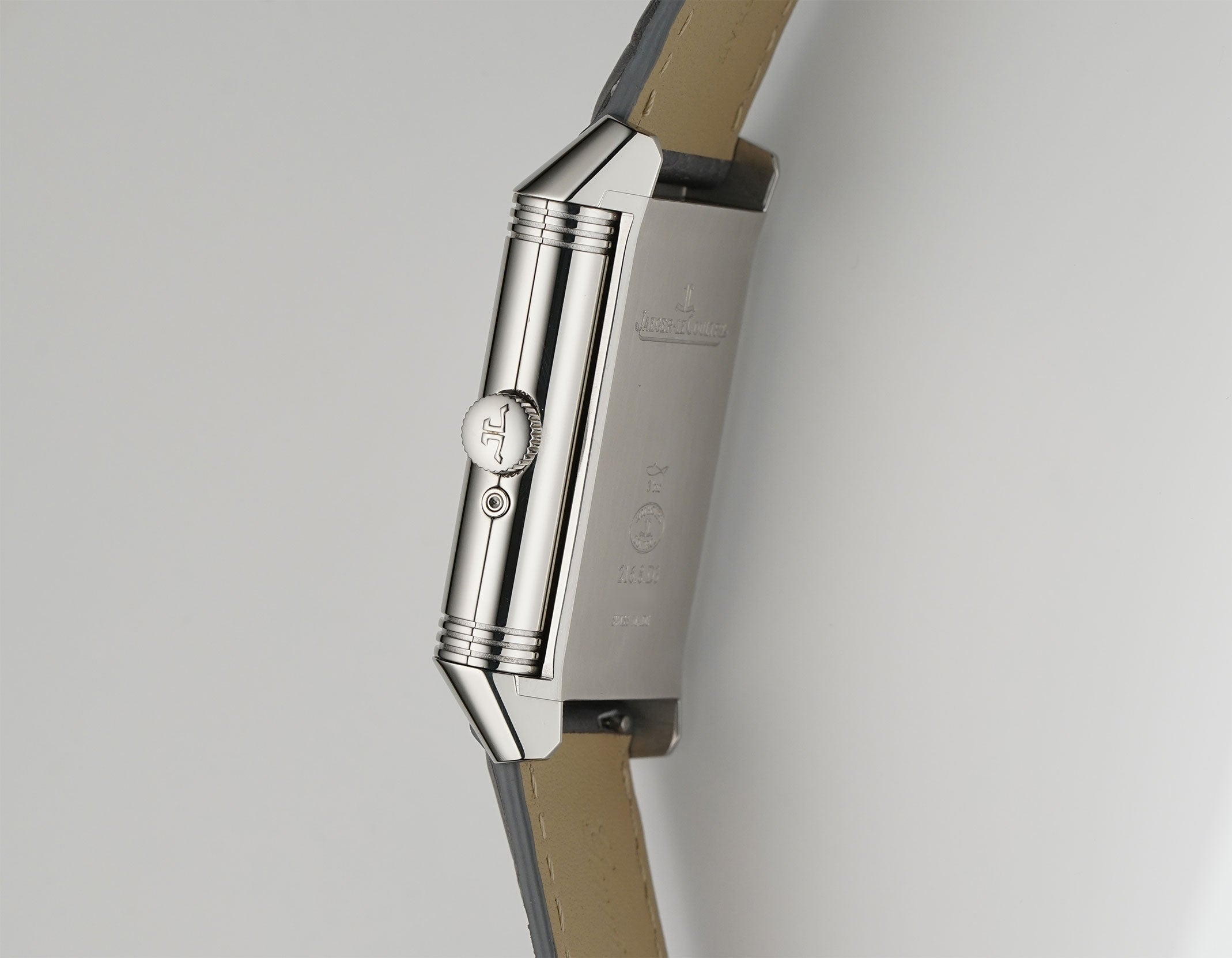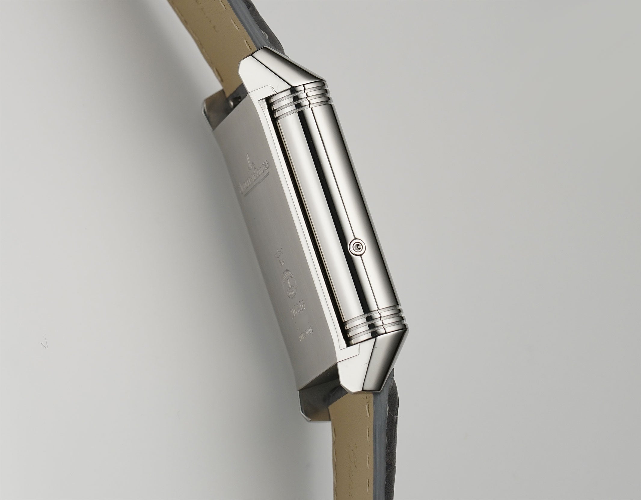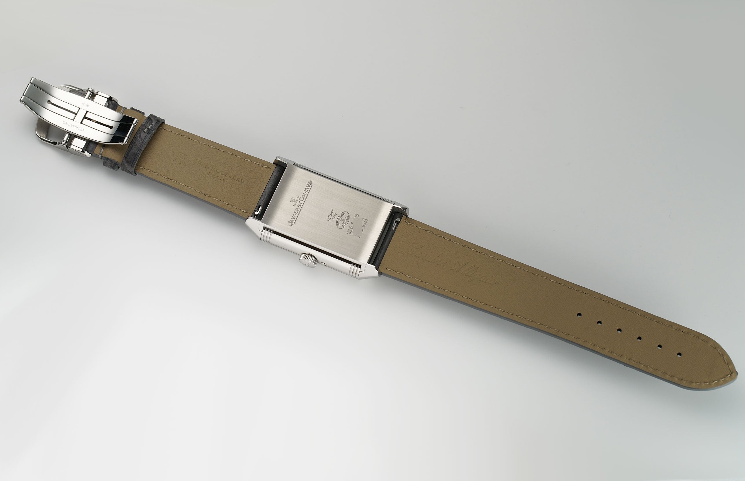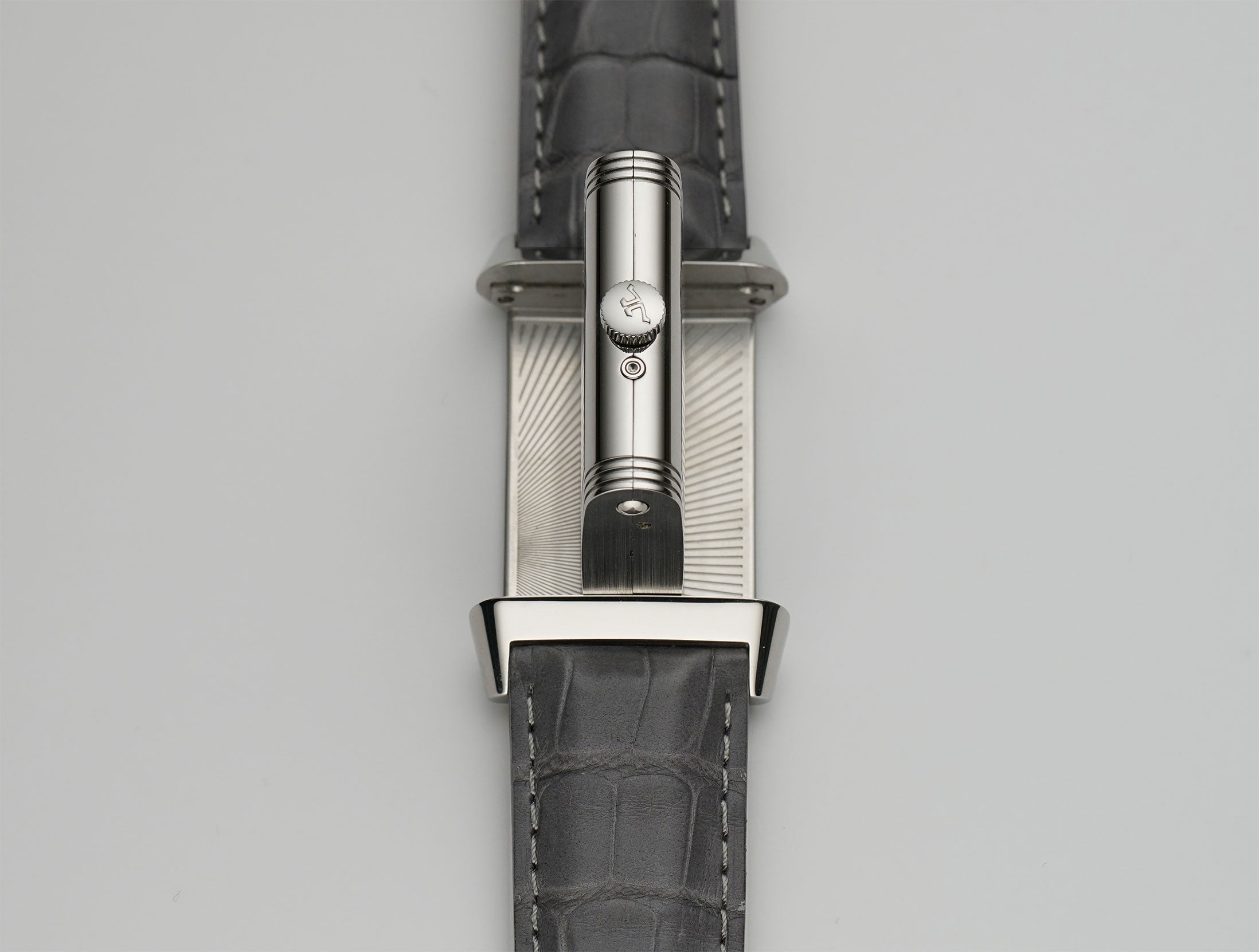 The case is made of stainless steel, mostly displaying a mirror finish while the case back has a satin finish and the inner carriage displays a sunray finish. The watch is currently mounted on an unworn grey John Rousseau (high-quality Paris made) leather strap that is paired with a JLC stainless steel double-folding deployment buckle. The strap does have a slight hint of blue which compliments the watch perfectly.