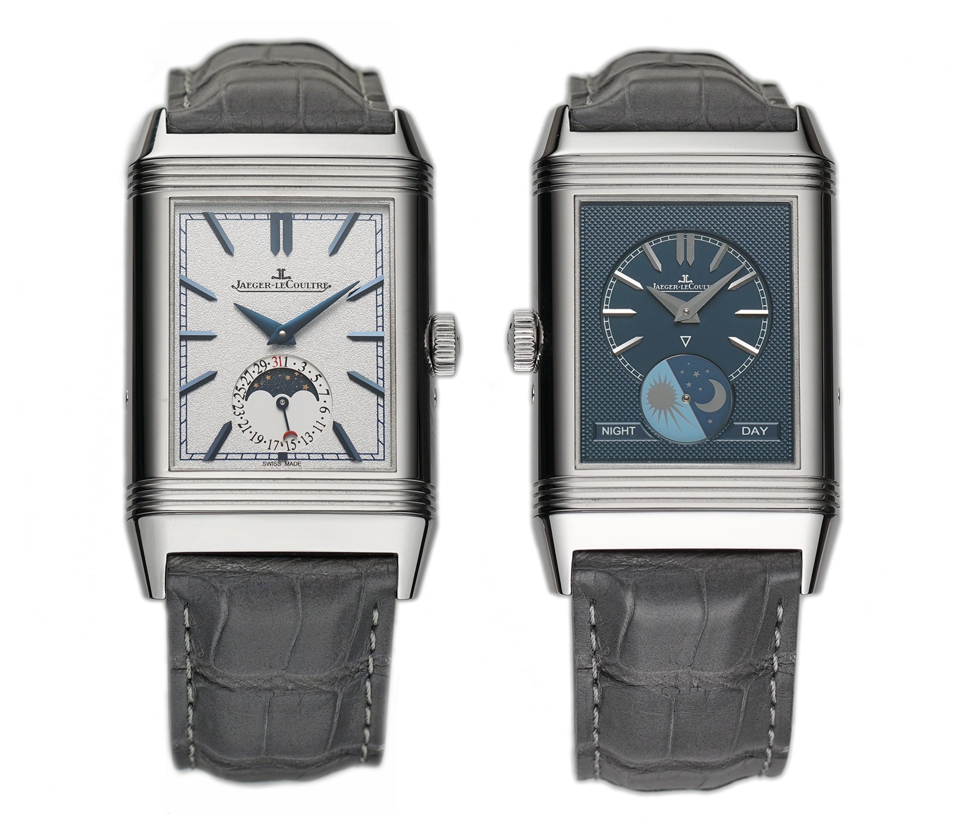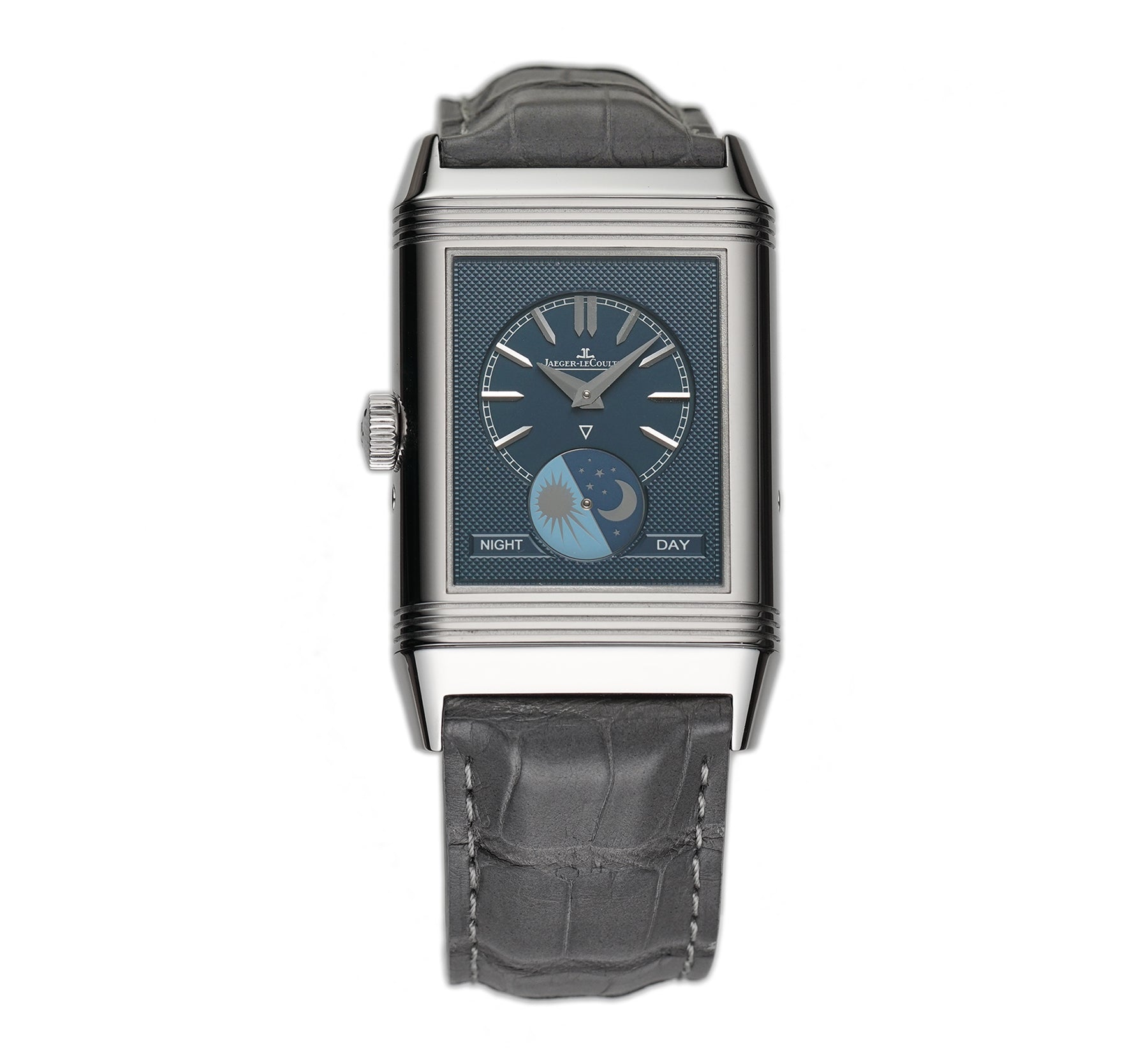 Functions are displayed on a silver eggshell-textured dial that is accompanied by blue hands and baton hour markers. This main face displays a date sub-dial as well as a moon phase display. The reverse side is a blue hobnail dial that displays a second time zone as well as a night and day indicator.