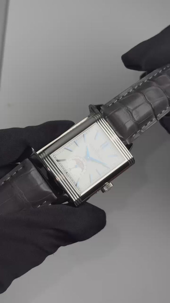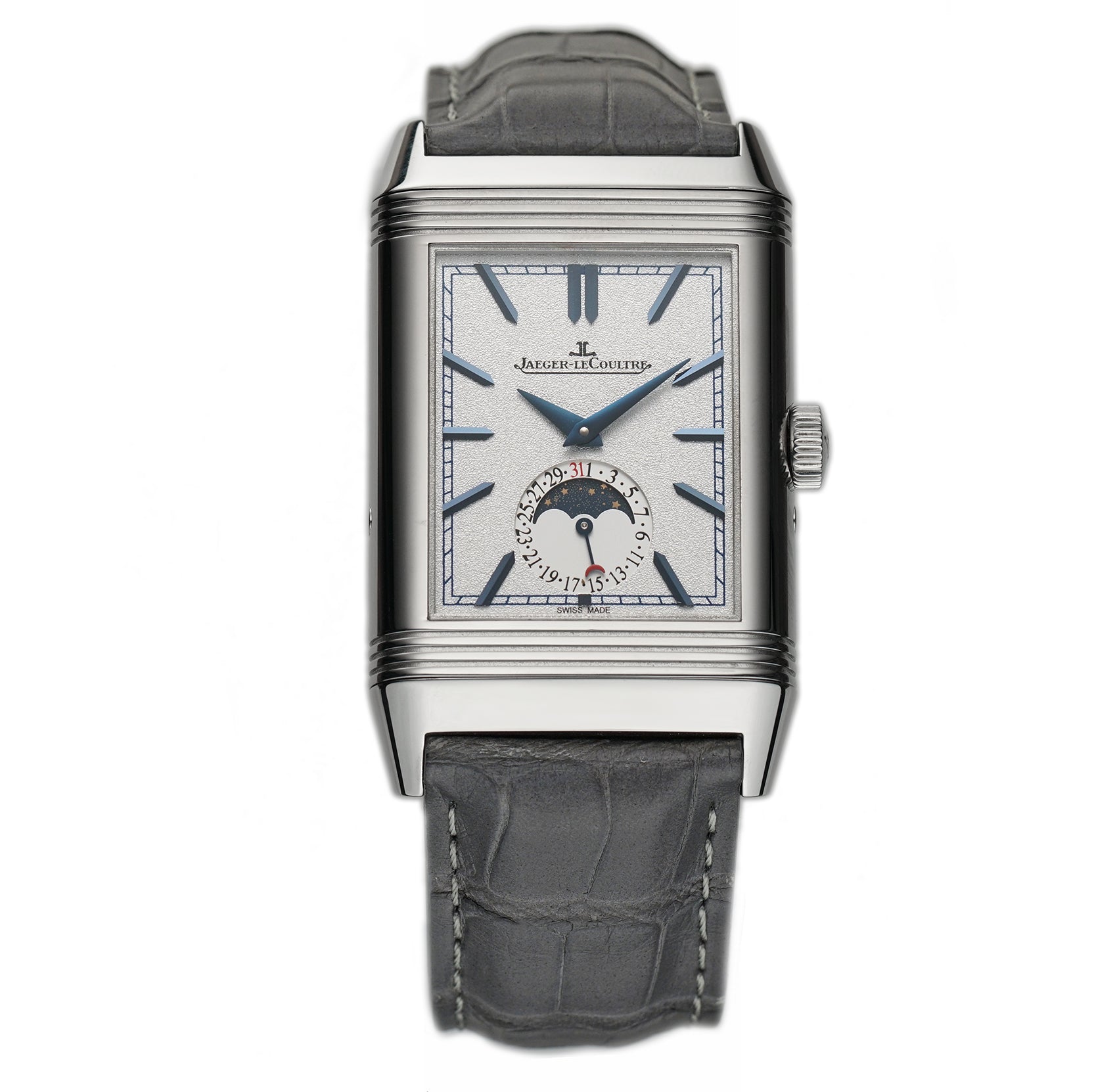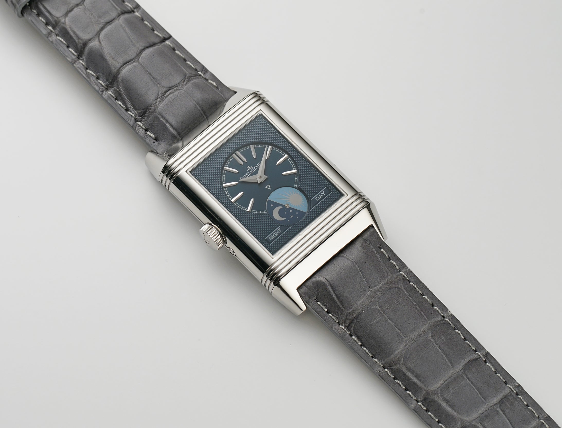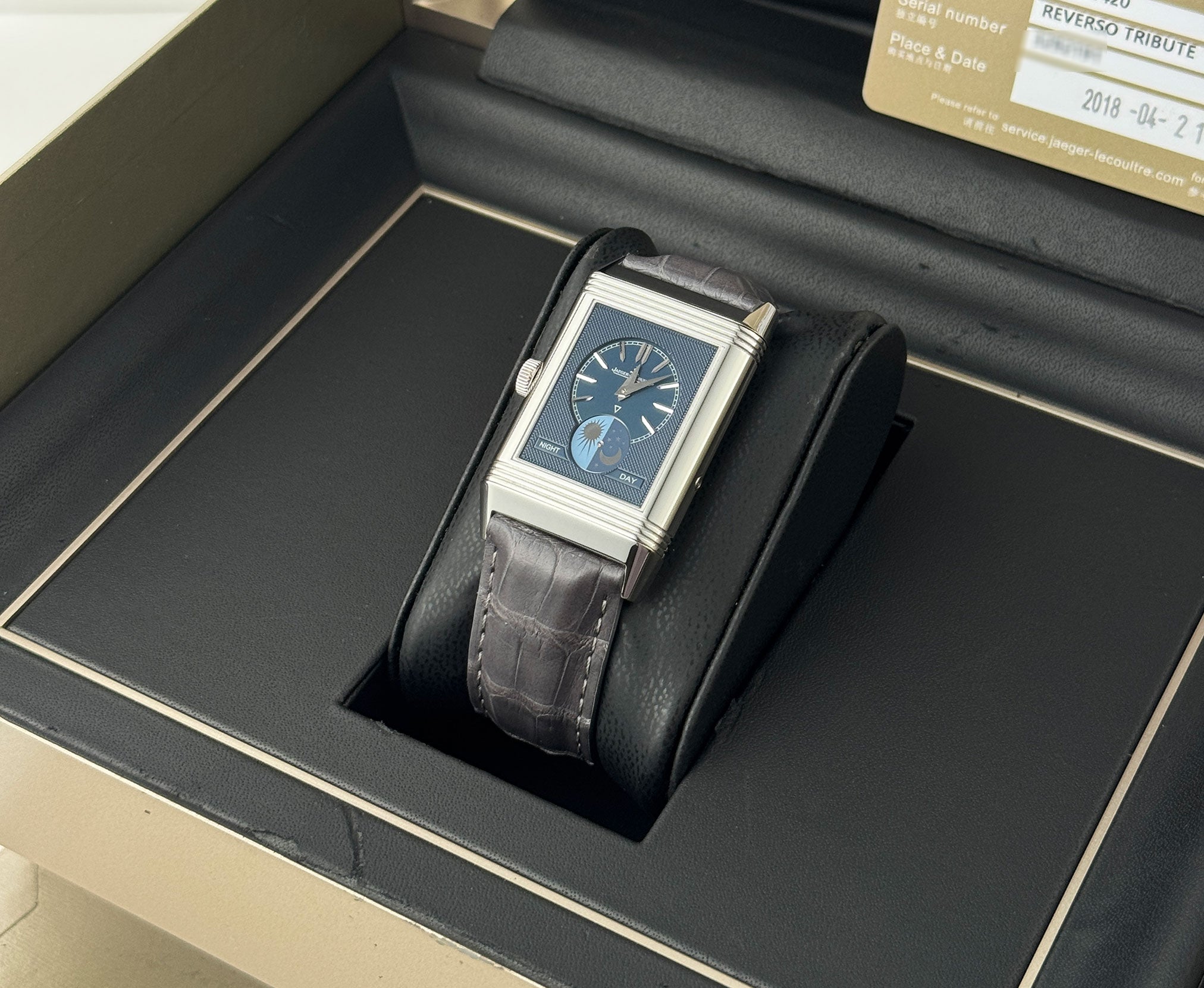 This Reverso tribute moon 216.8.D3 is in outstanding condition for a watch that was enjoyed since 2018. The case does have areas of mirror-like finish which are prone to hairlines (marks visible when with high resolution cameras or if angled at certain lighting). Pictures are part of the description so please refer to the pictures in determining the condition, pictures are of the exact watch being offered.