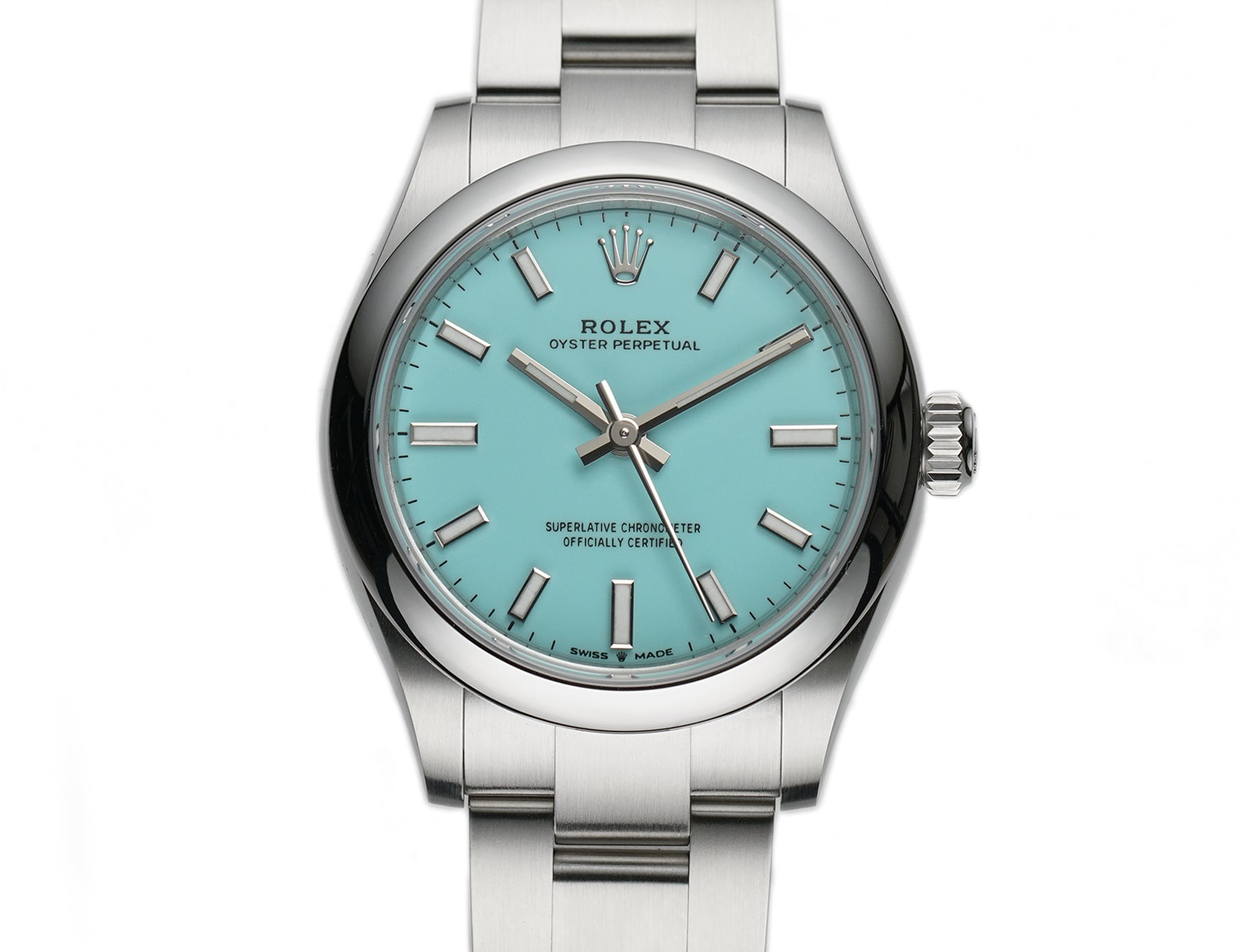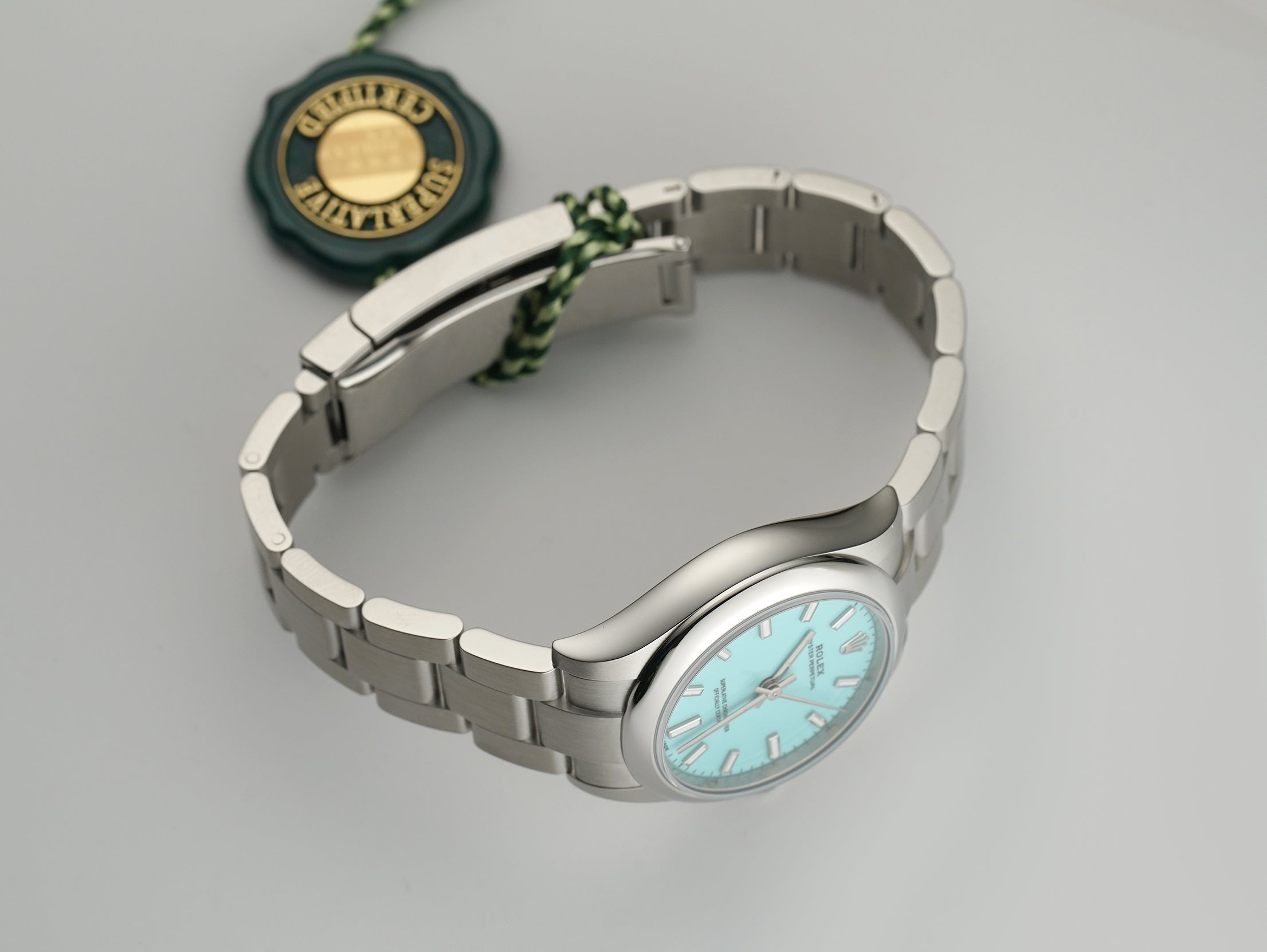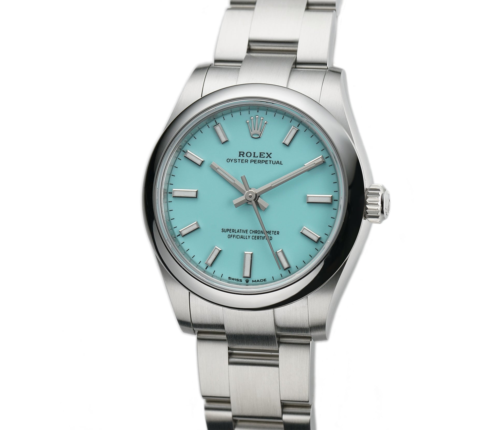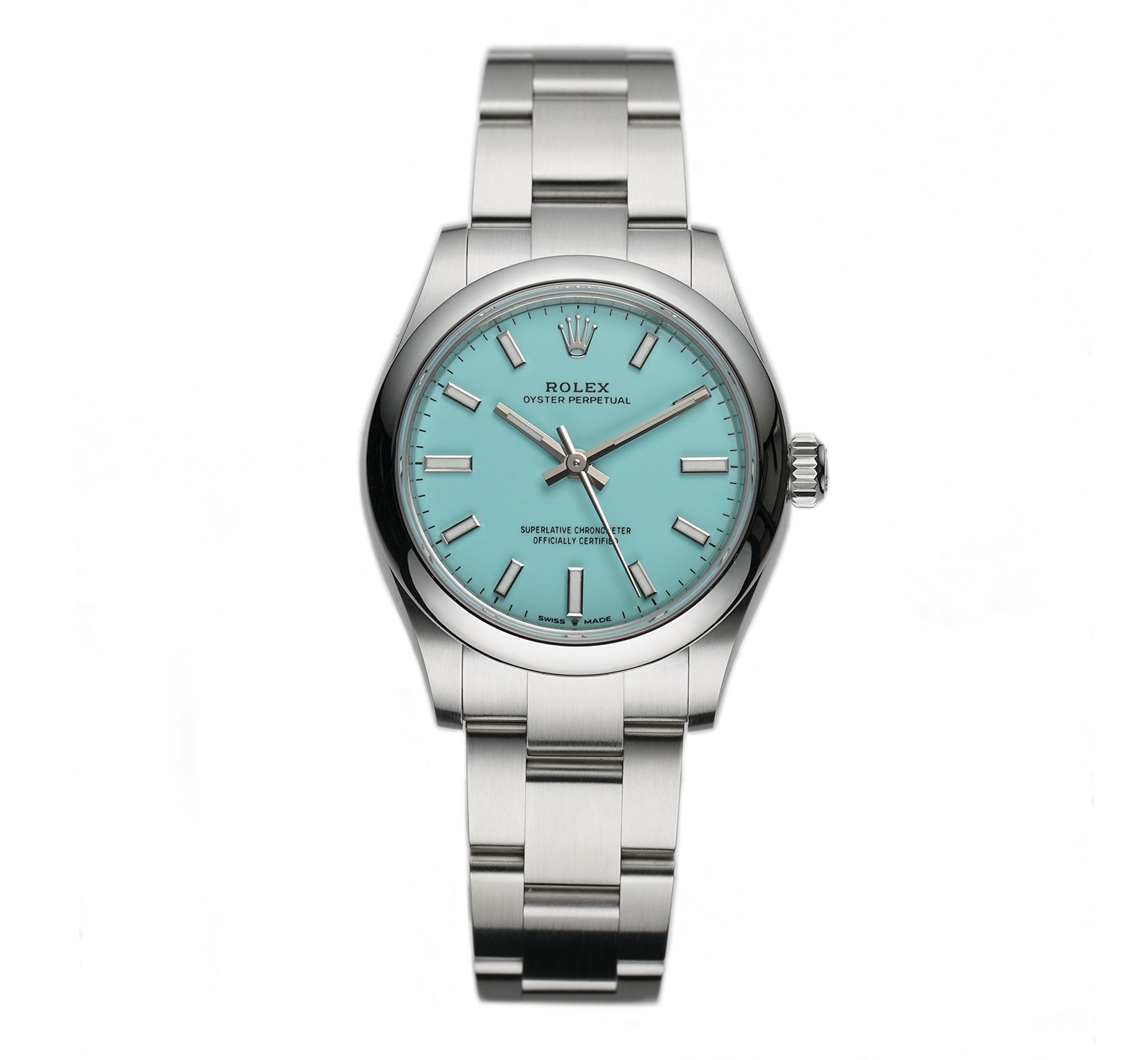Time is displayed on a tiffany blue dial that is accompanied by luminescent filled hands as well as luminous hour markers.