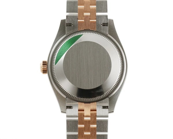 Case is made of high-polish finished stainless steel with a high-polish finished 18k everose gold fluted bezel mounted atop. Screwed down into the case is a solid stainless steel case back as well as an 18k everose gold crown. The jubilee bracelet consists of brush-finished stainless steel outer links and high-polish finished 18k everose gold center links.