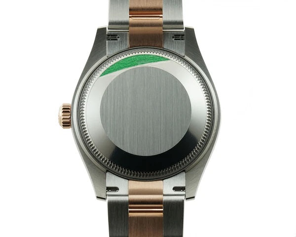 Case is made of high-polish finished stainless steel & everose gold with the exception of the case back which is combination of satin-finished and high-polish stainless steel. Mounted atop is a fluted 18K everose gold bezel. The oyster bracelet is of 18k everose gold high-polish finished center links and stainless steel satin-finished outer links.