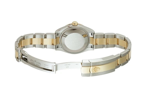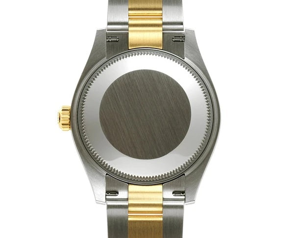 Case is made of high-polish finished stainless steel & yellow gold with the exception of the case back which is combination of satin-finished and high-polish stainless steel. Mounted atop is a diamond 18k yellow gold bezel. The oyster bracelet is of 18k yellow gold high-polish finished center links and stainless steel satin-finished outer links.