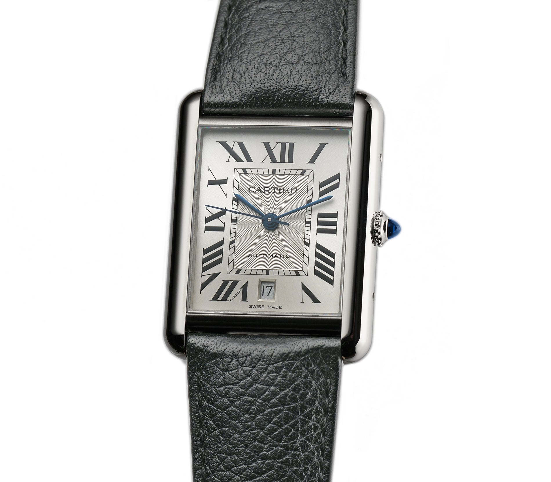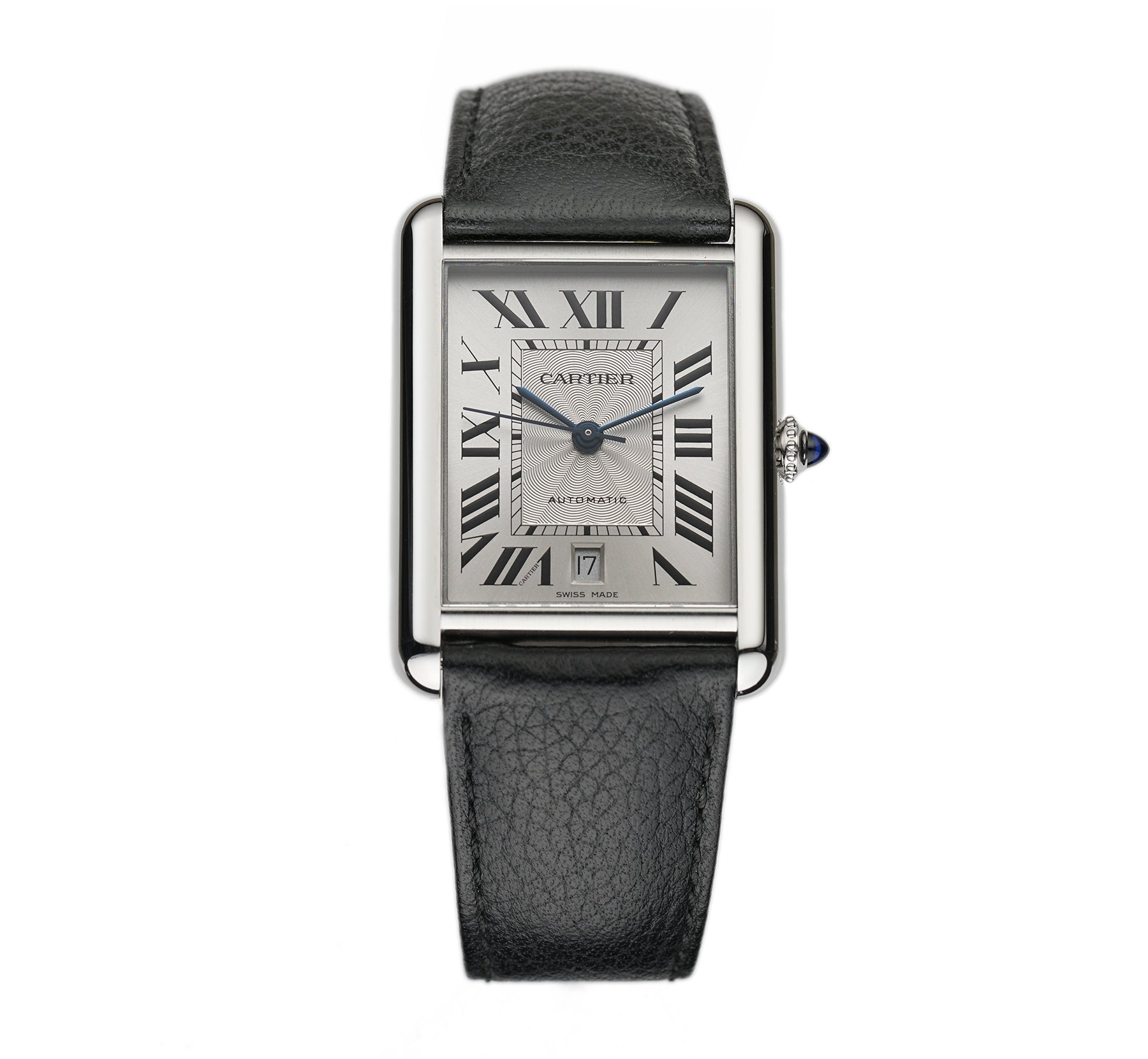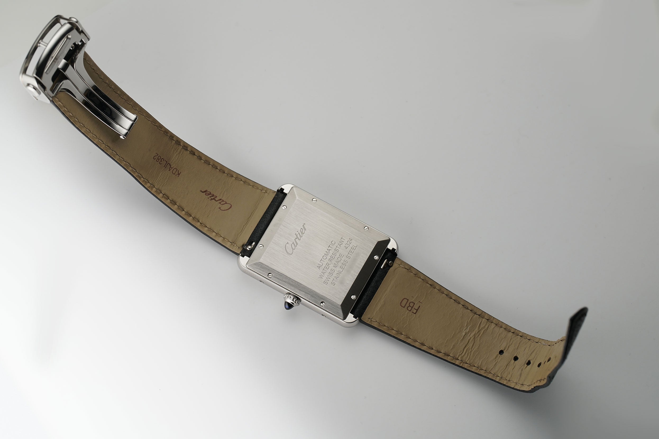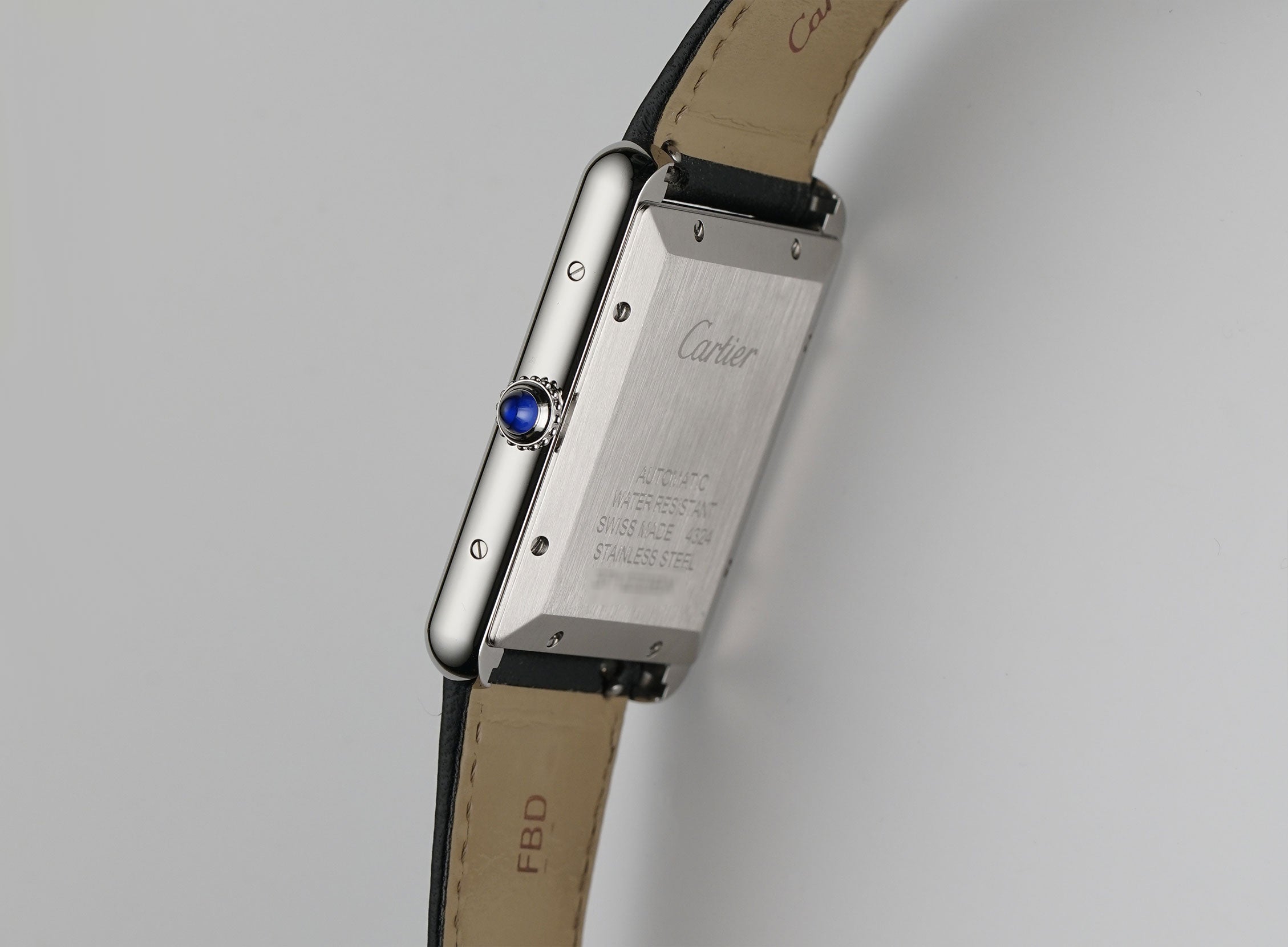 The case is made of a mirror finish stainless steel including the crown with the blue synthetic cabochon spinel. It is paired with a black leather Cartier strap (approximately 80% condition) with a stainless steel Cartier deployment buckle.