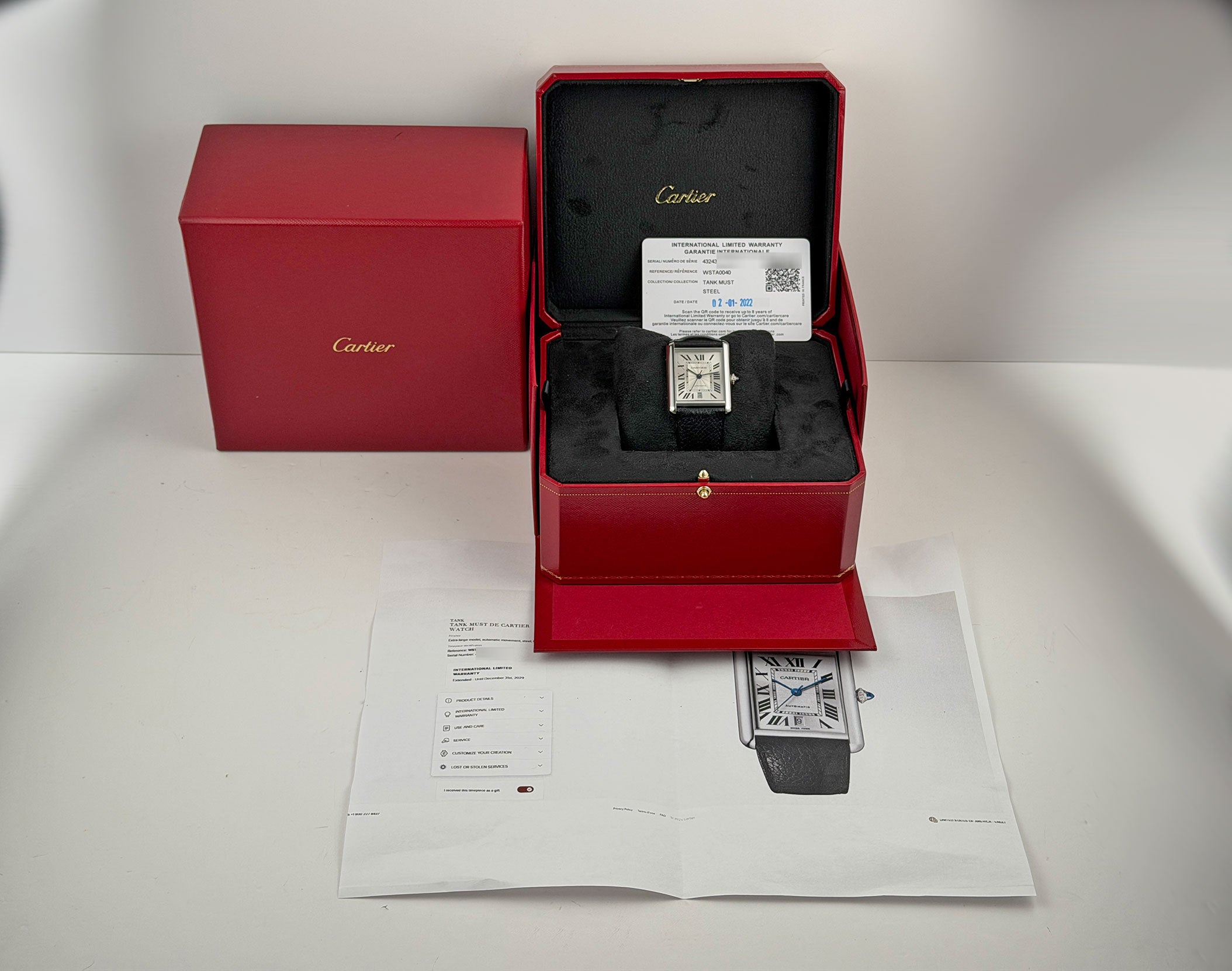 Additionally, the watch is covered under a factory Cartier warranty up until December 31st of 2029.