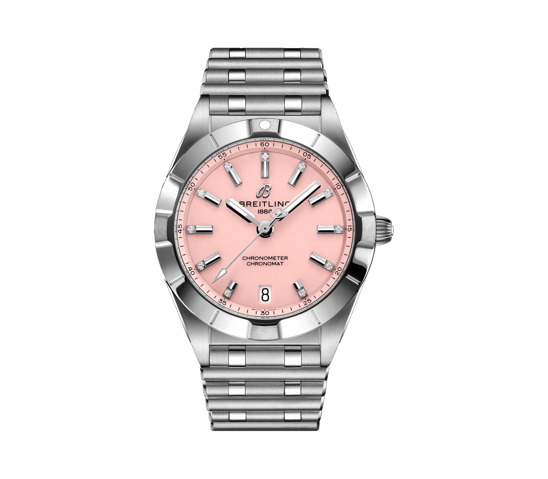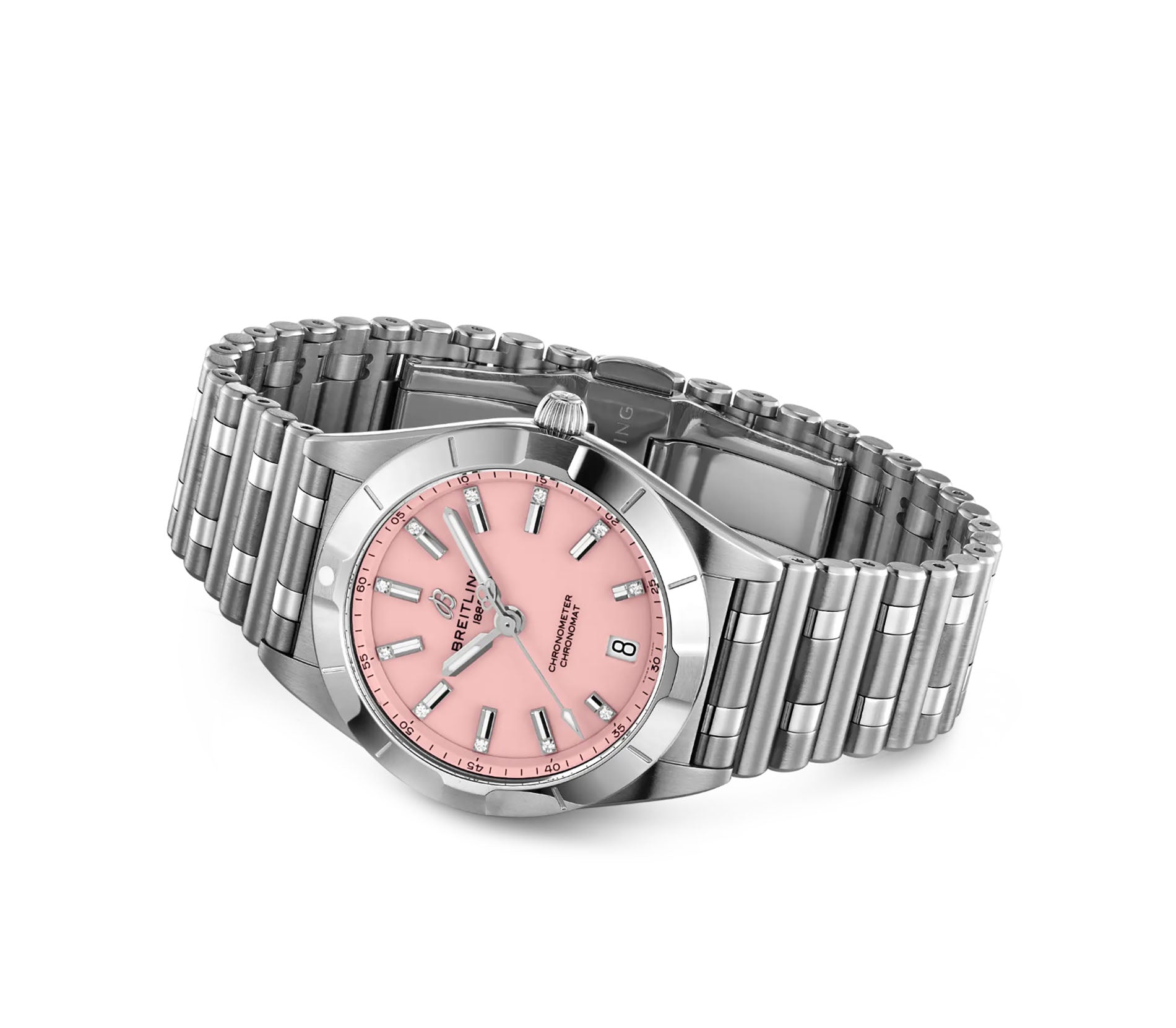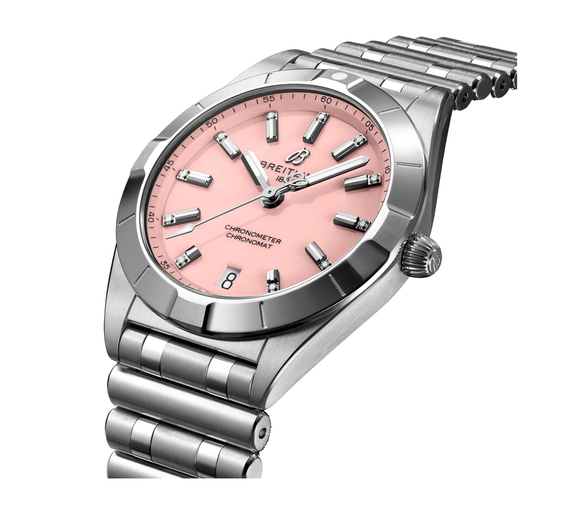Functions are shown on a pink dial with luminous hands and index diamond hour markers. These functions include hours, minutes, seconds, and a date at 6 o'clock.