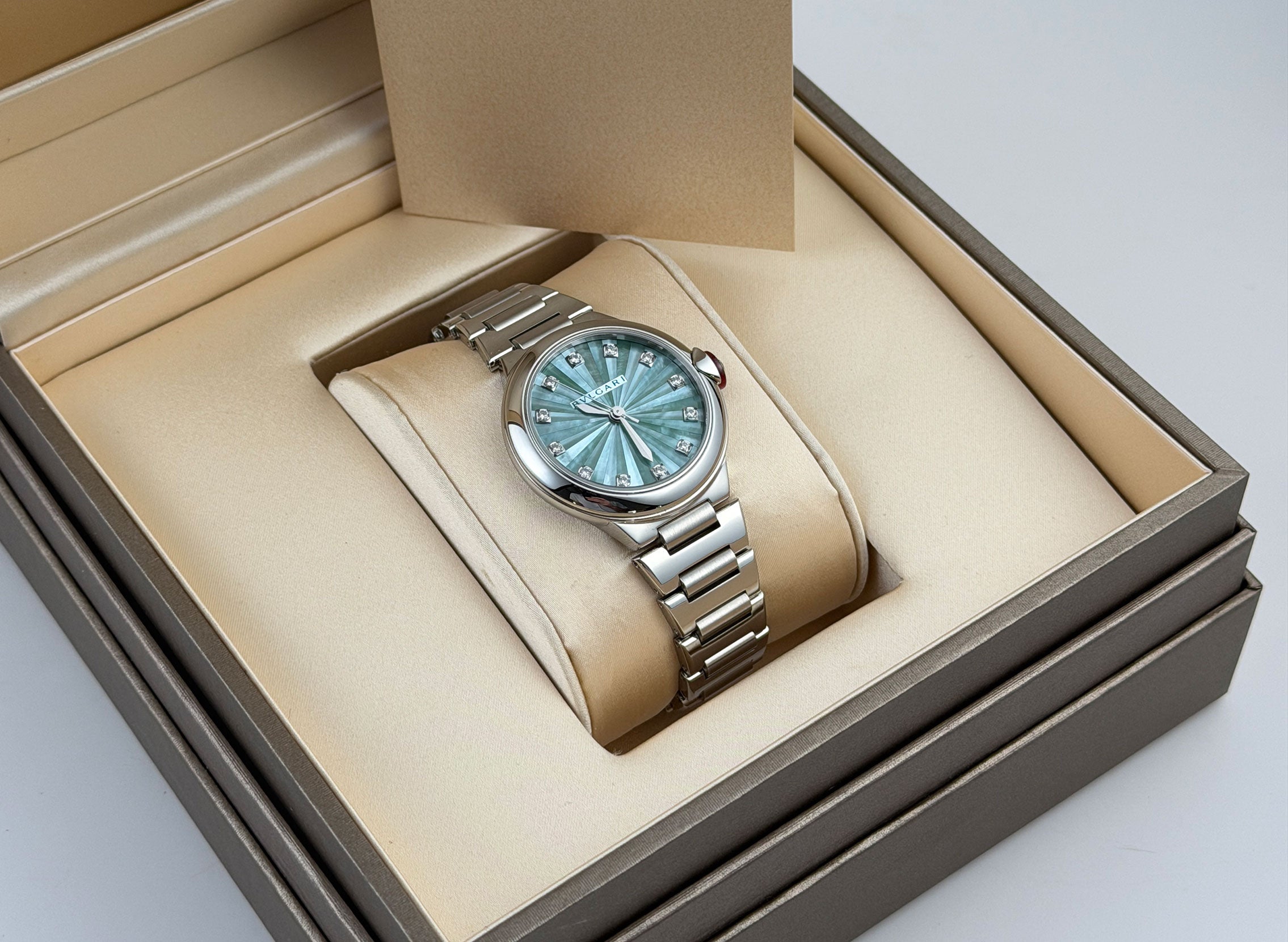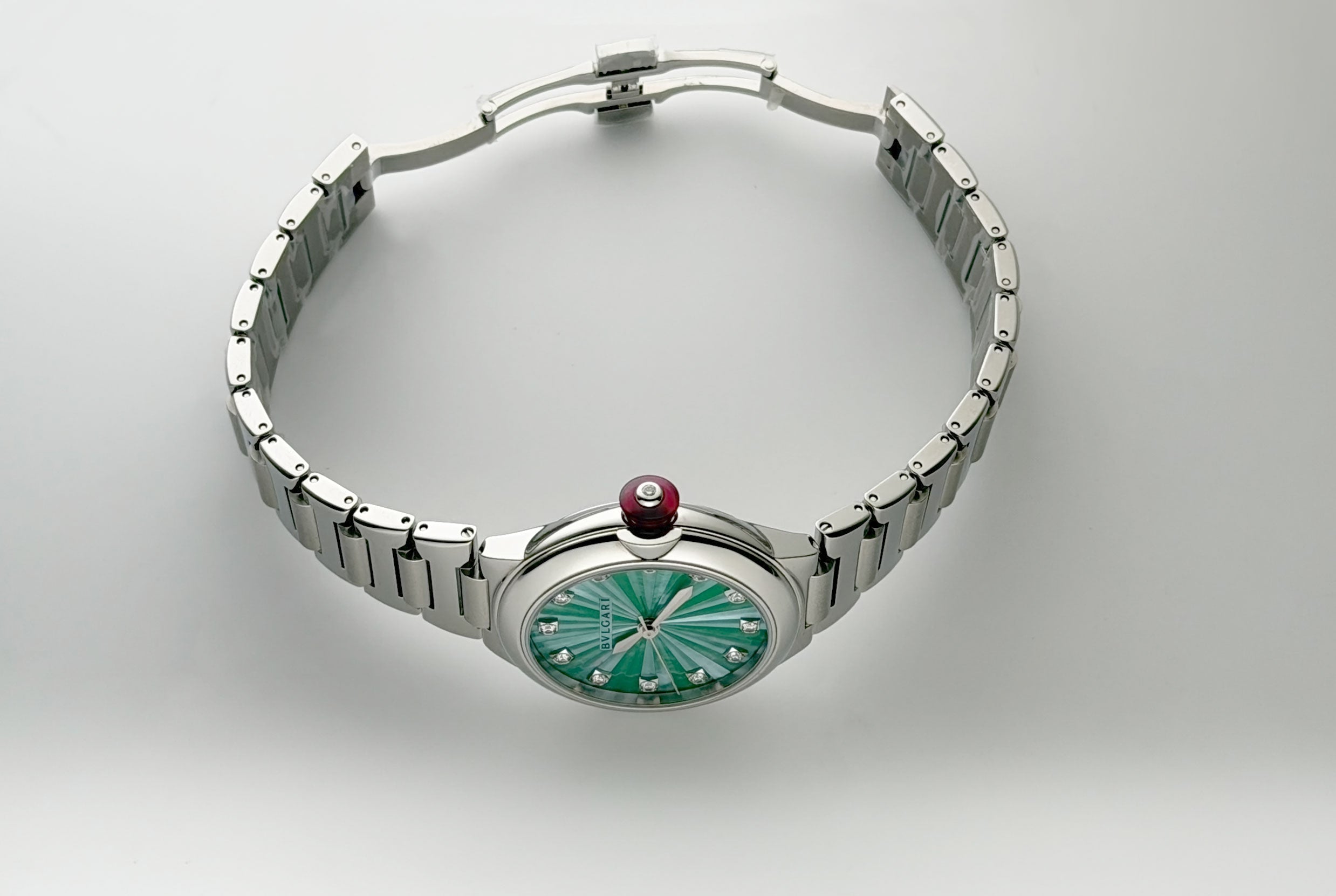 Functions are shown on a green mother-of-pearl dial with a diamond hour markers. These functions include hours, minutes, and seconds.