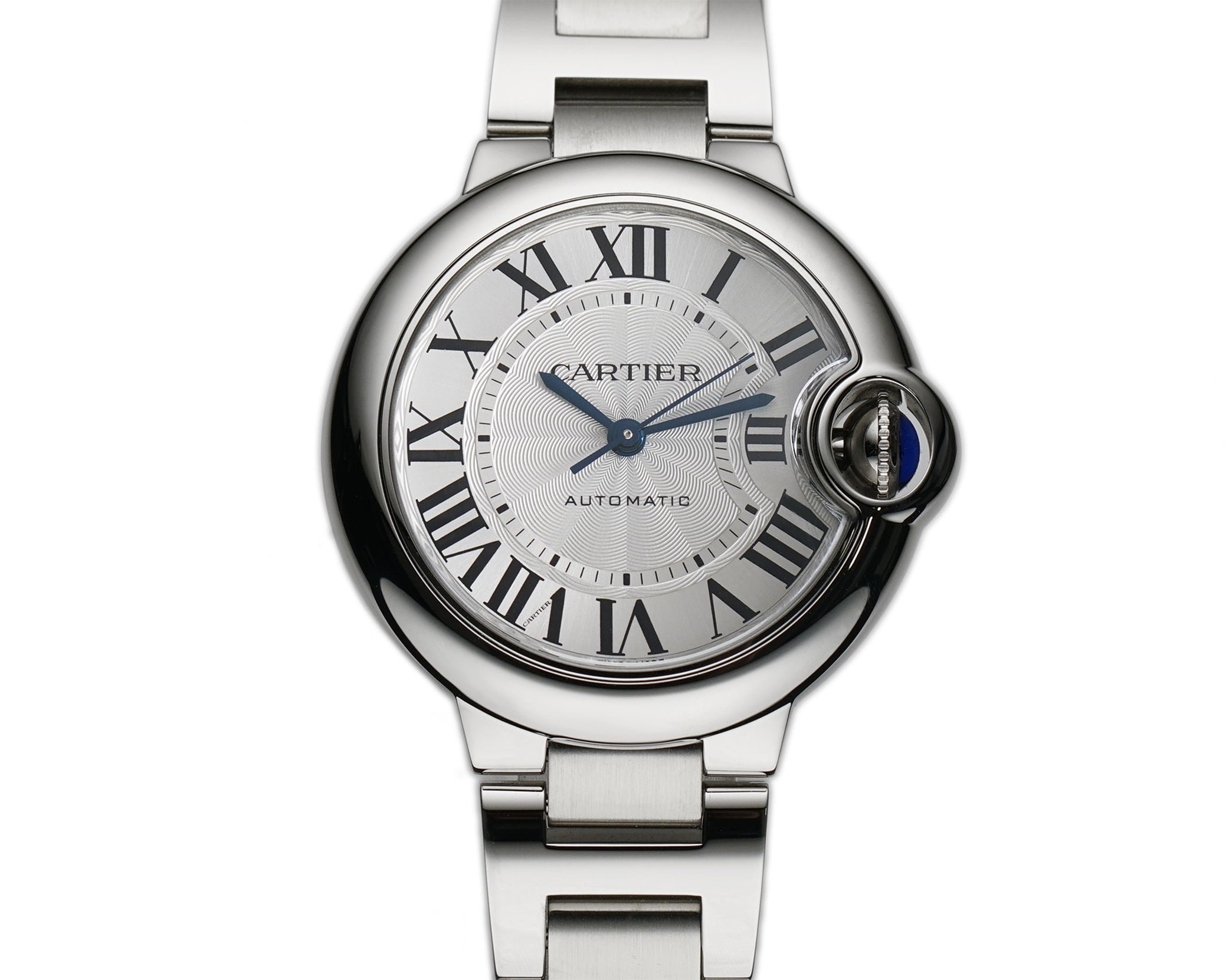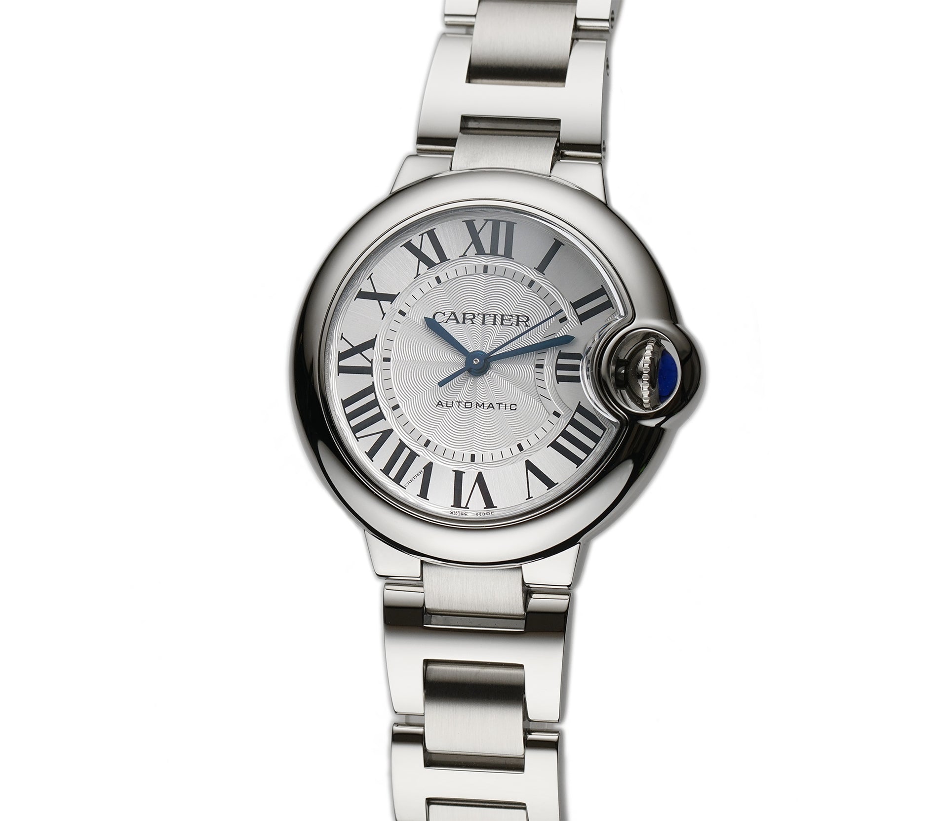 Time is displayed on a silver dial with blued steel hands and black roman hour markers.