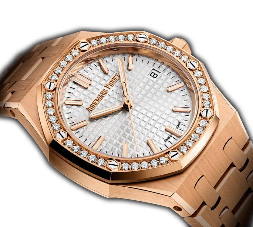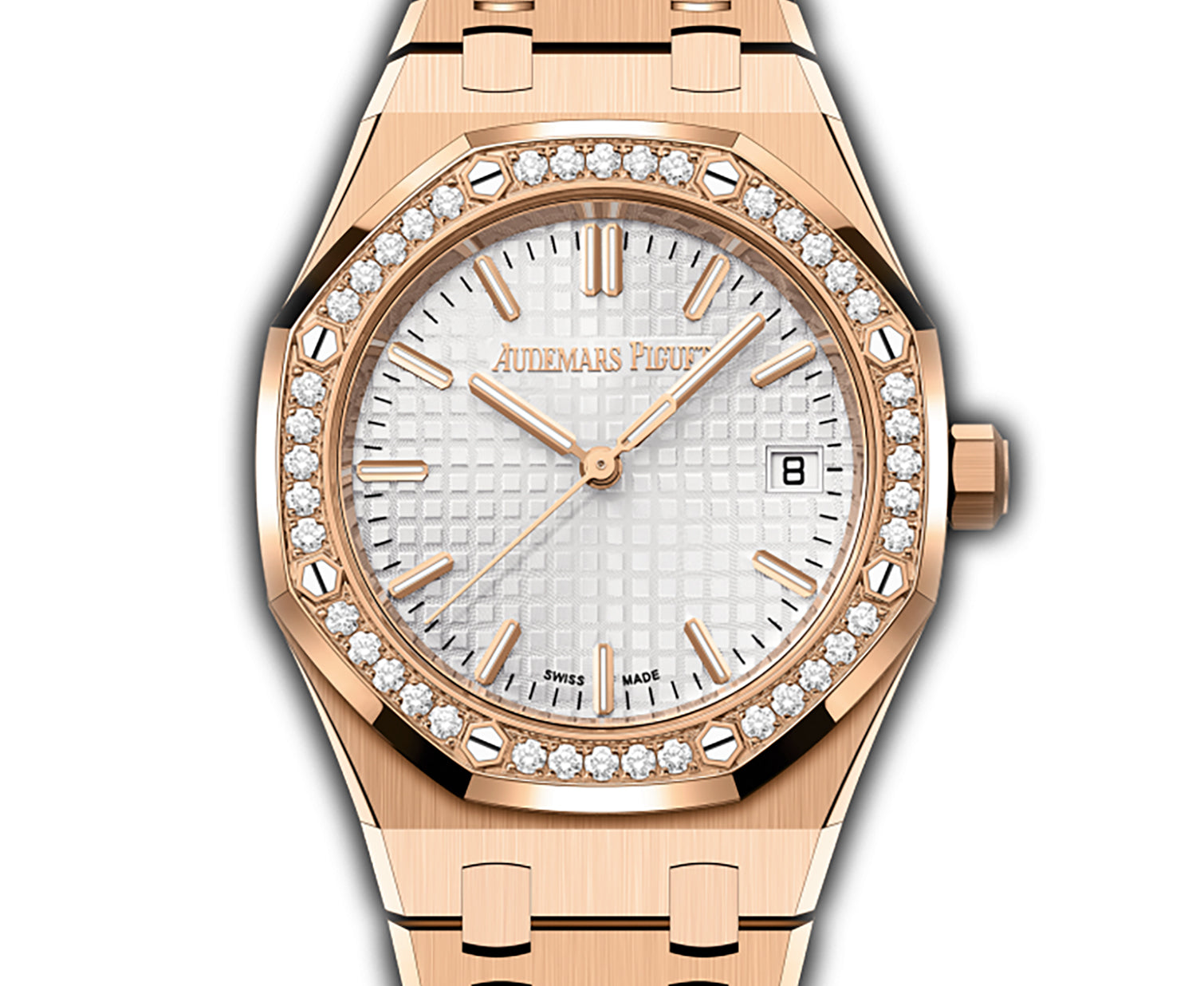 The case is made of 18k rose gold, most of which displays a satin finish with the exception of the beveled edges which are of a mirror-finish. Following the same configuration is an 18k rose gold bracelet. AP designed this bezel with 40 brilliant-cut diamonds weighing approximately 0.71 carats in total.