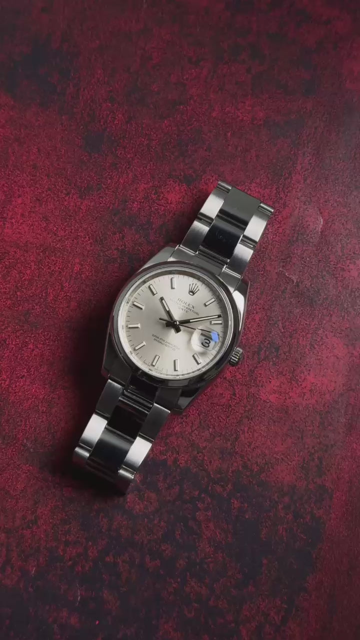 oysteThis Rolex Oyster Perpetual Date (115200) is in excellent condition for a previously owned watch. The case does have areas of mirror-like finish which are prone to hairlines (marks visible when with high resolution cameras or if angled at certain lighting). Pictures are part of the description so please refer to the pictures in determining the condition, pictures are of the exact watch being offered.