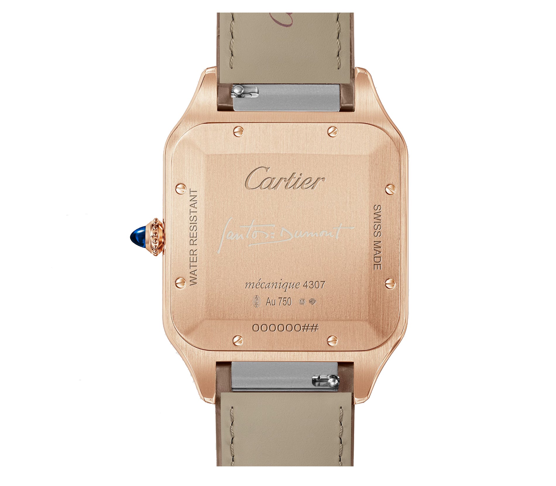 Caseback is engraved with the handwritten signature of Alberto Santos-Dumont. Watch is paired with a brown alligator strap with a 18k rose gold Cartier tang buckle.