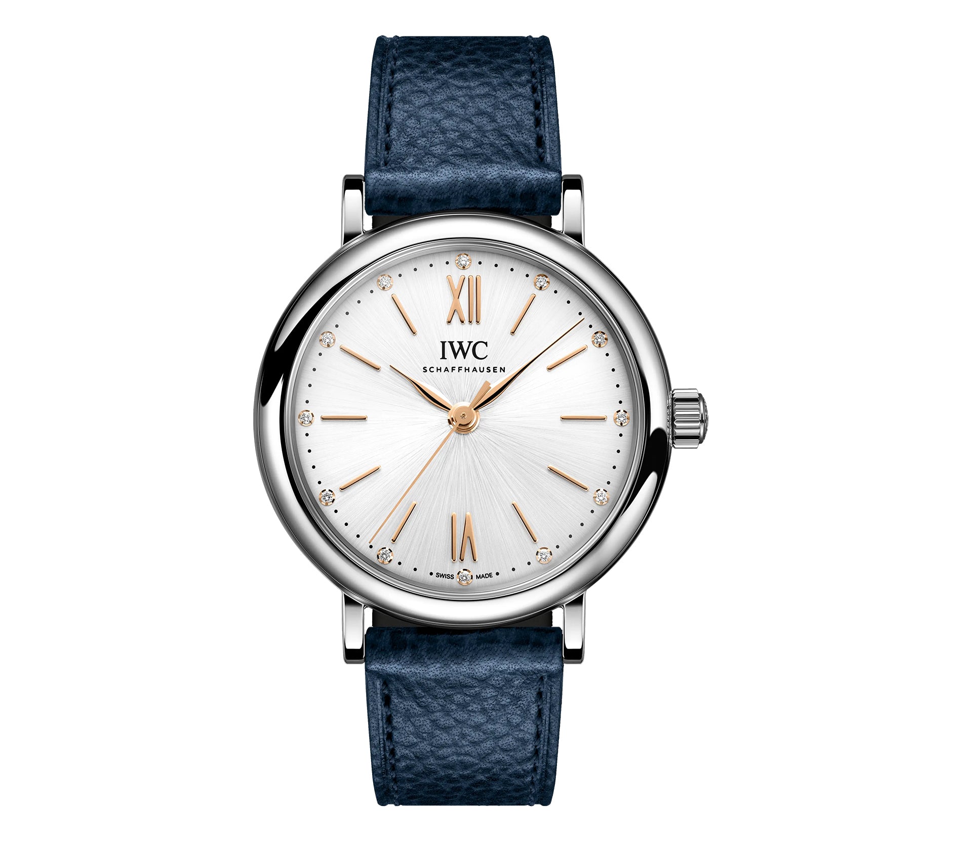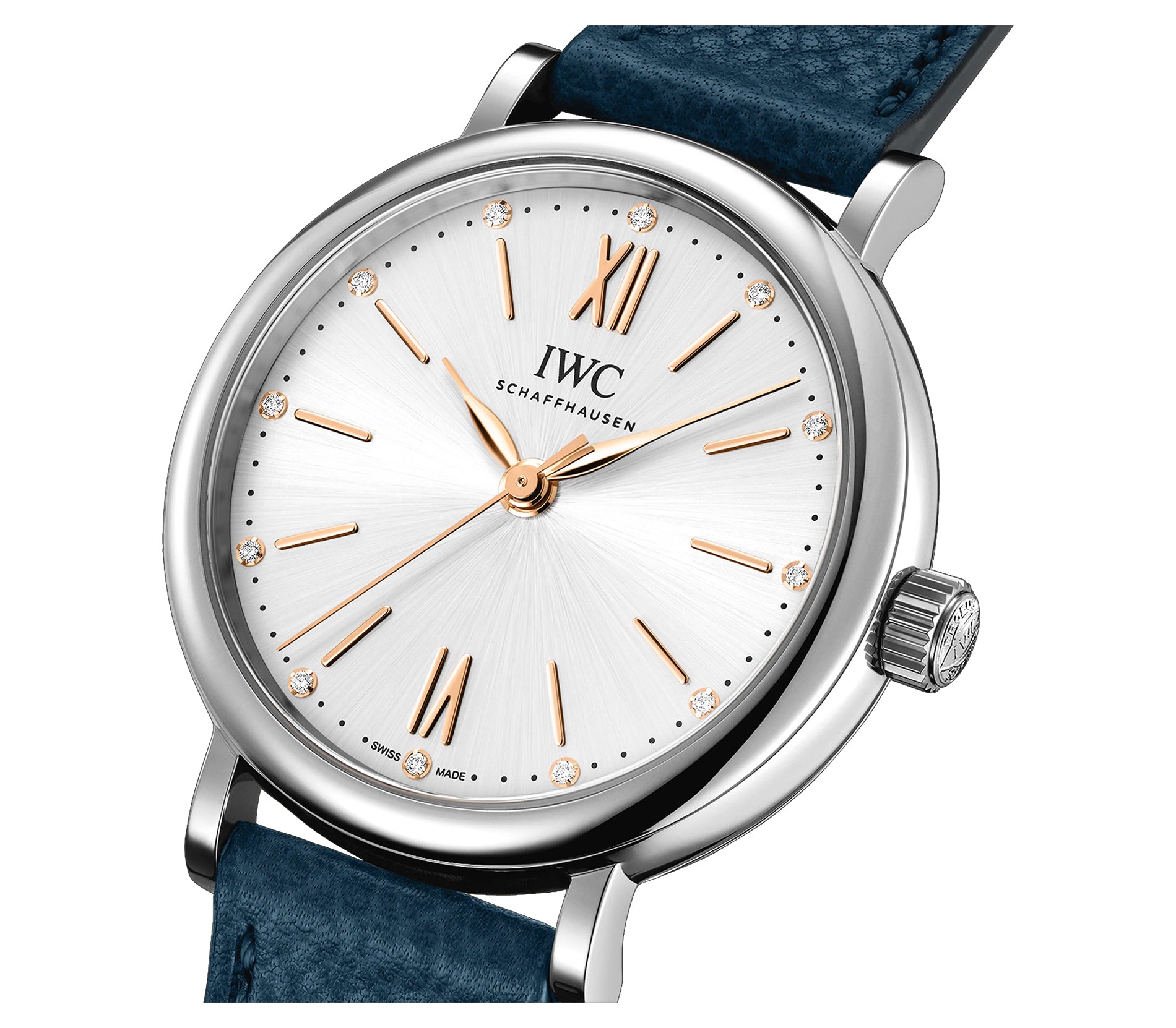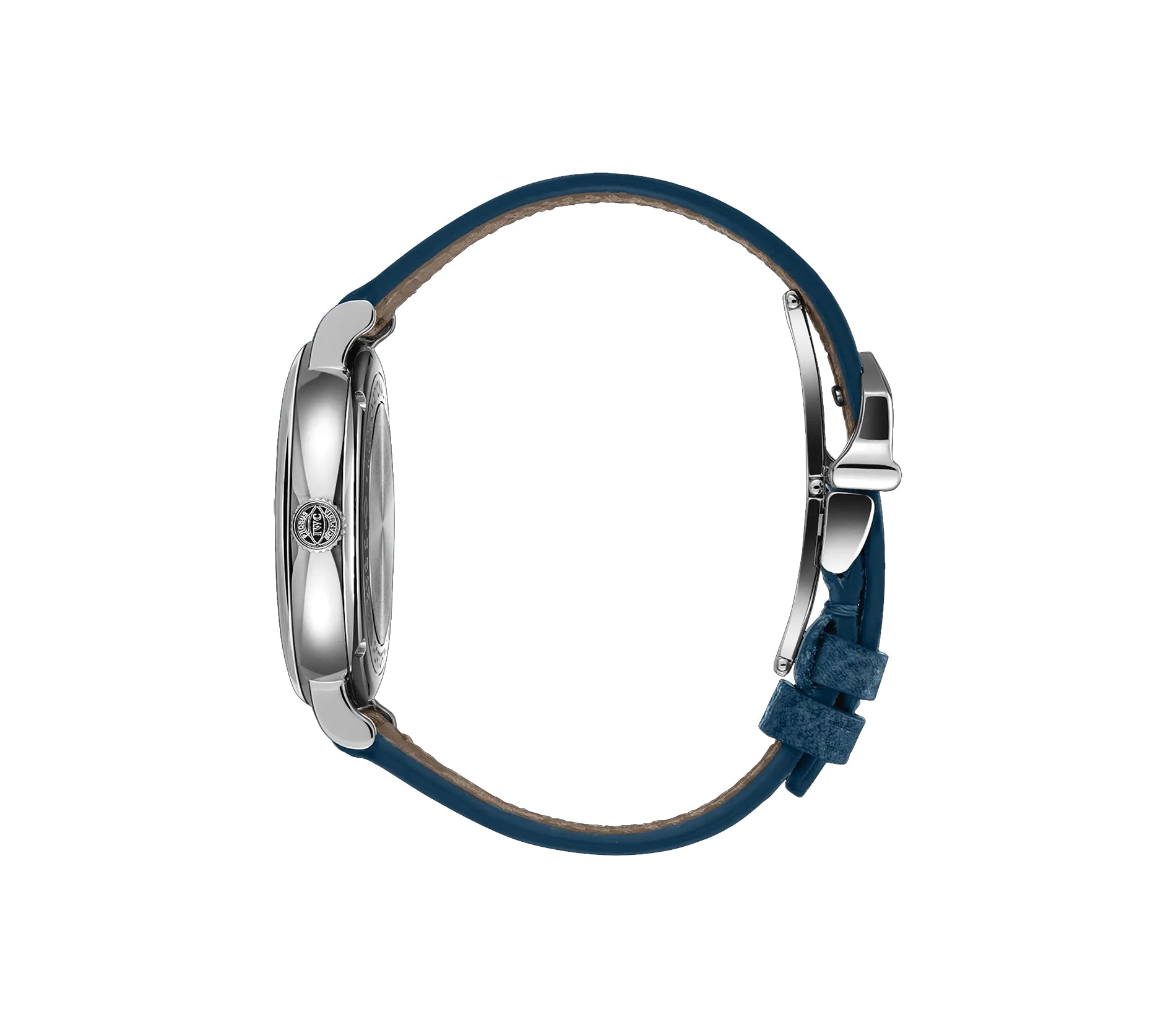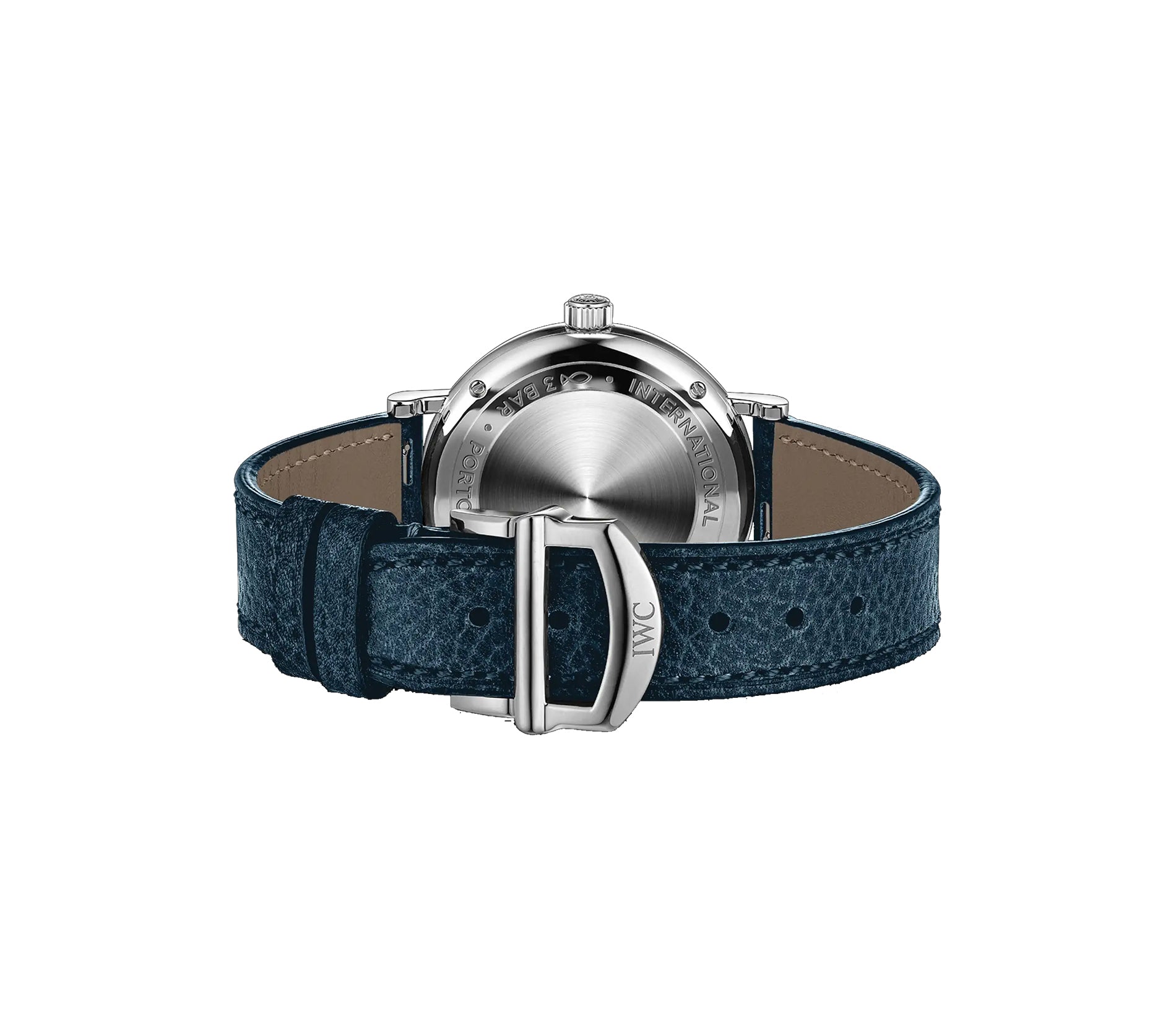 Case is made of mirror finished stainless steel as is the fixed bezel mounted atop. Back of the watch is a closed-solid caseback. Mounted atop is a blue calfskin leather strap with an IWC steel double folding claps.