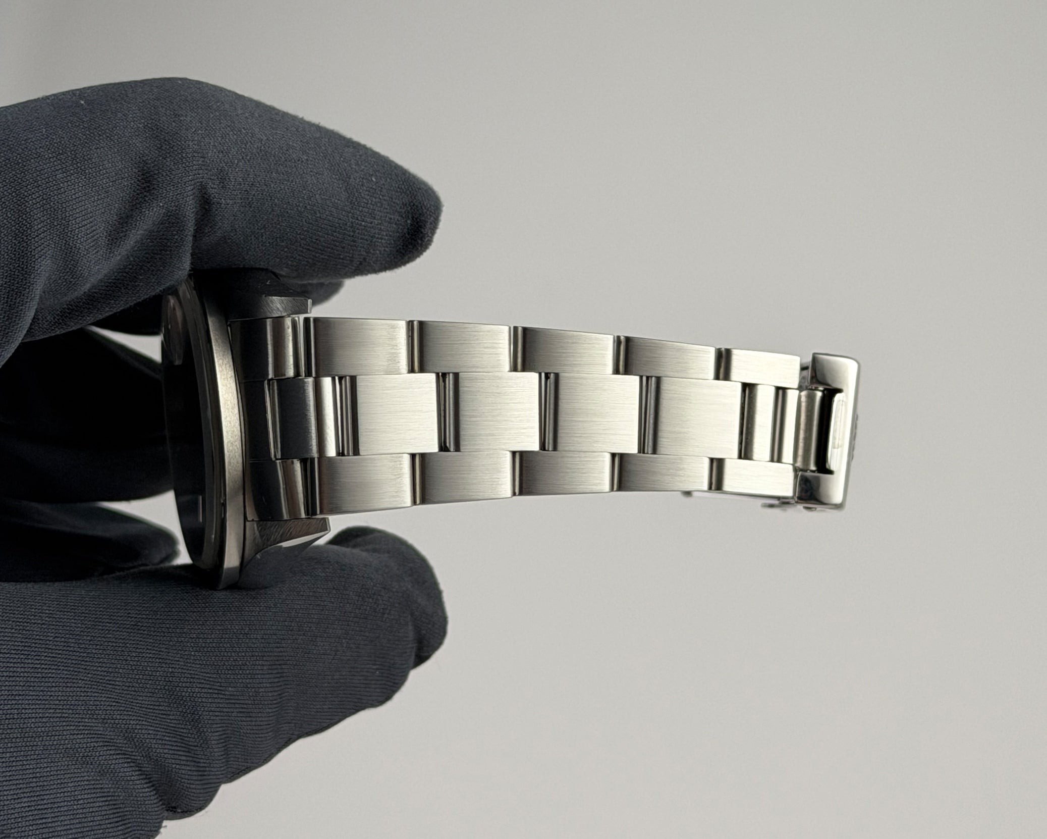 The case is made of stainless steel, displaying a mirrored finish on the sides and a satin finish on the lugs. As for the bezel, it is engine turned also of stainless steel. The stainless steel oyster bracelet features a satin finish and fits up to an approximate 7 inch wrist.
