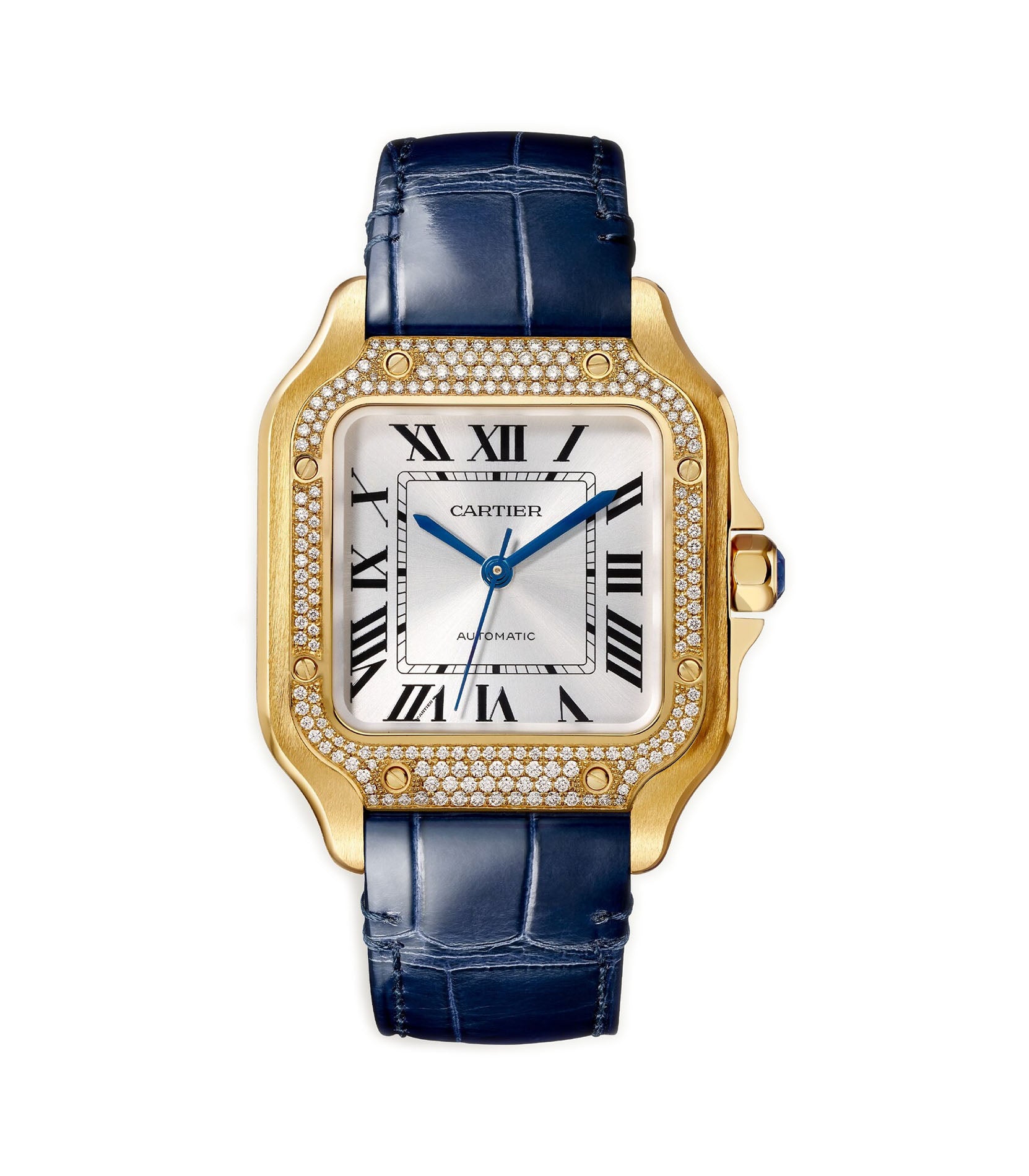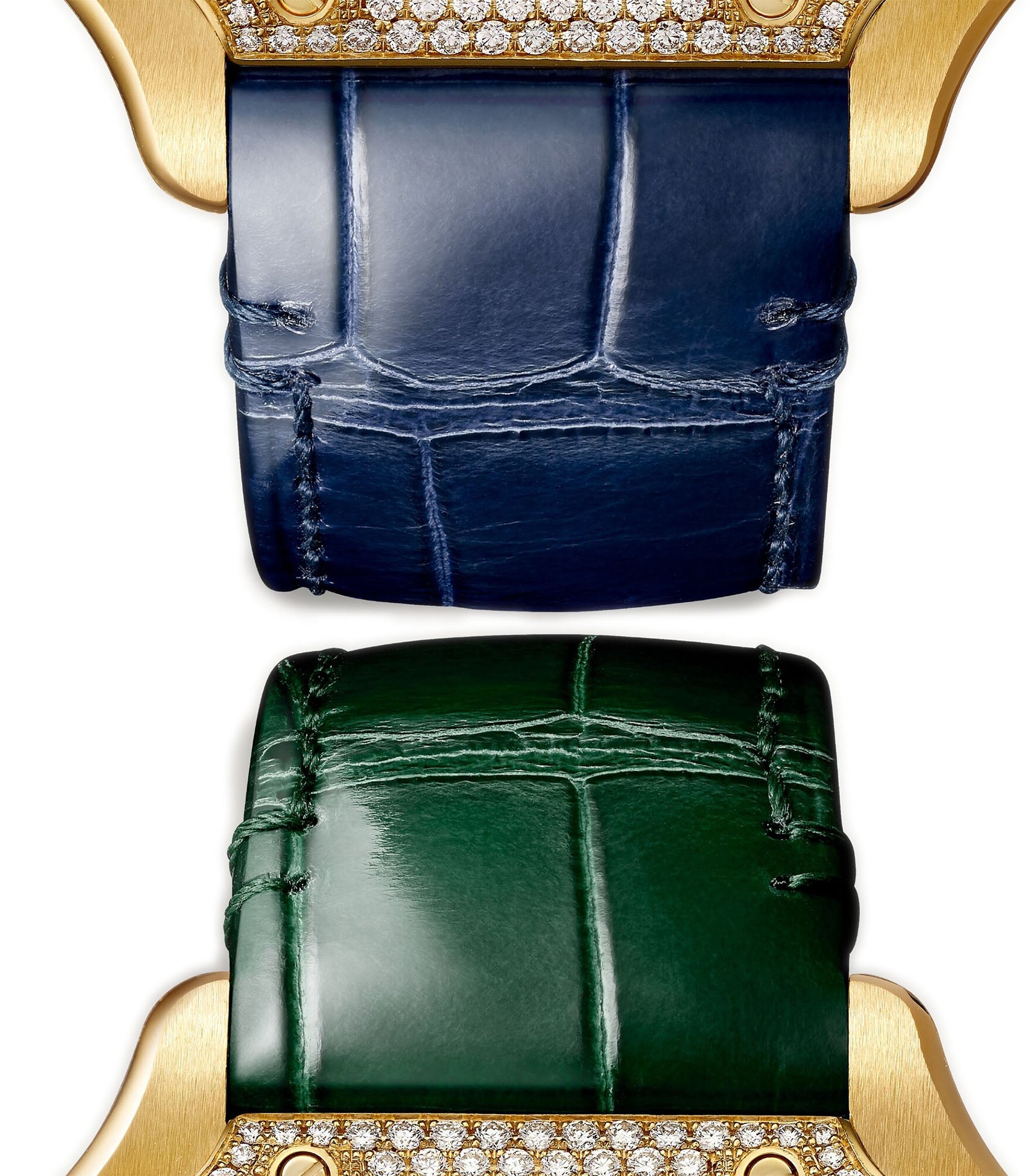 The case is made of a satin finish 18k yellow gold with mirror-like finish edges and crown. Mounted atop the case is an 18k yellow gold diamond bezel. The watch is paired with a blue leather strap with an 18k yellow gold folding buckle. The watch comes with an additional green leather strap.