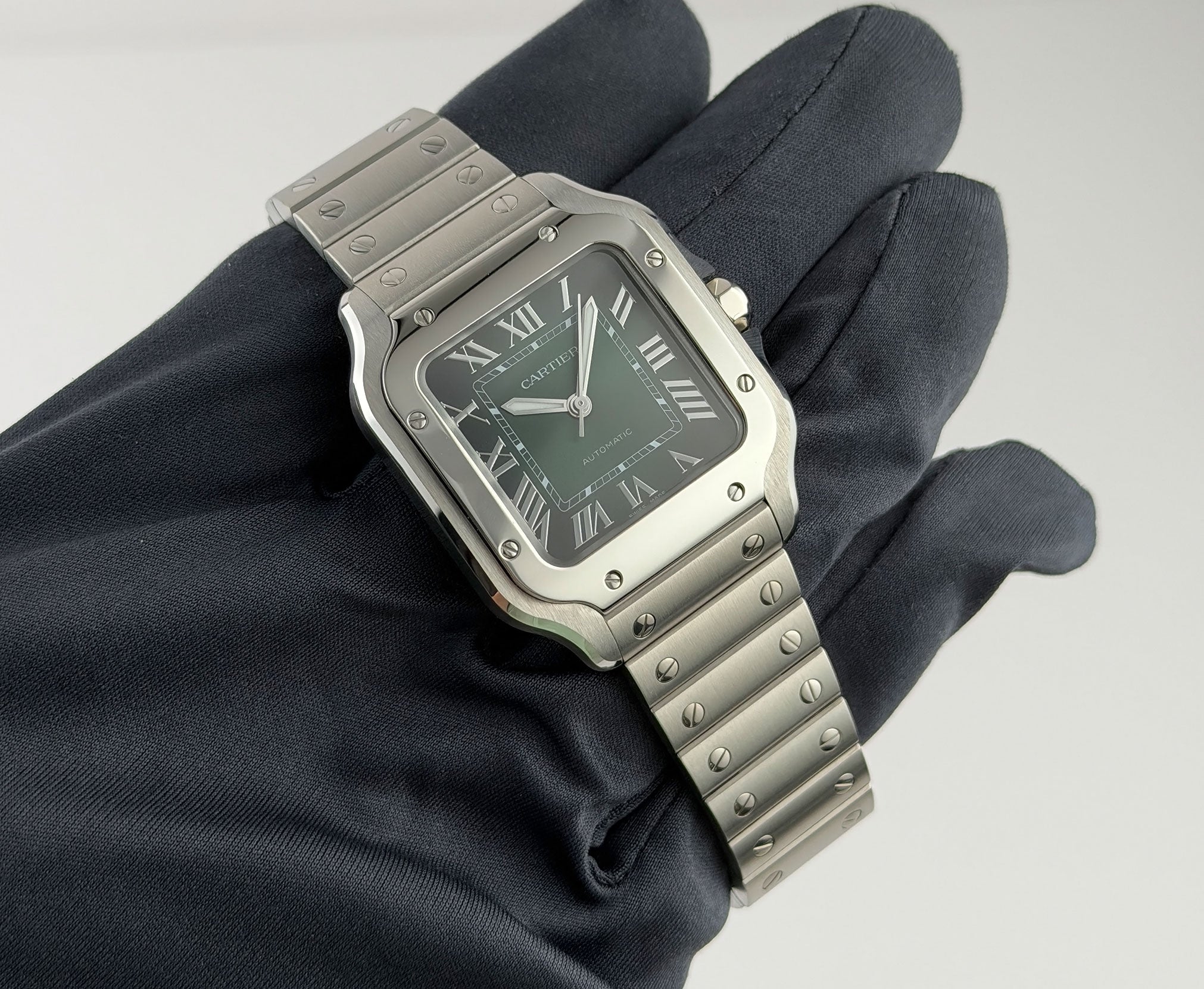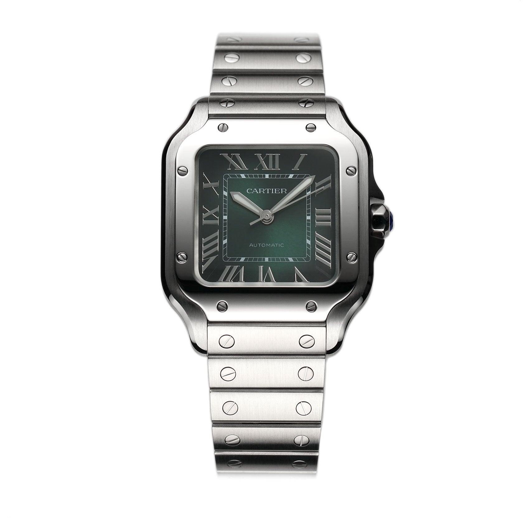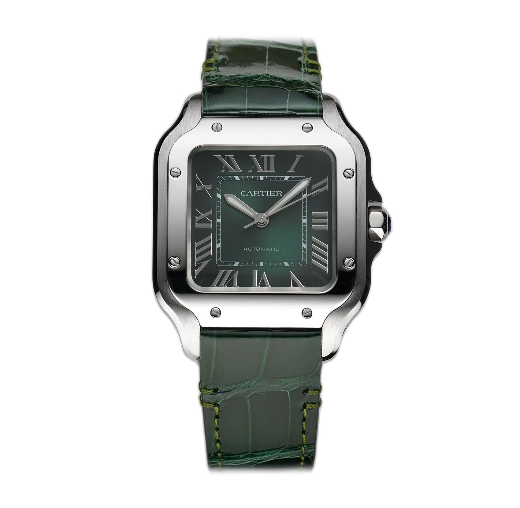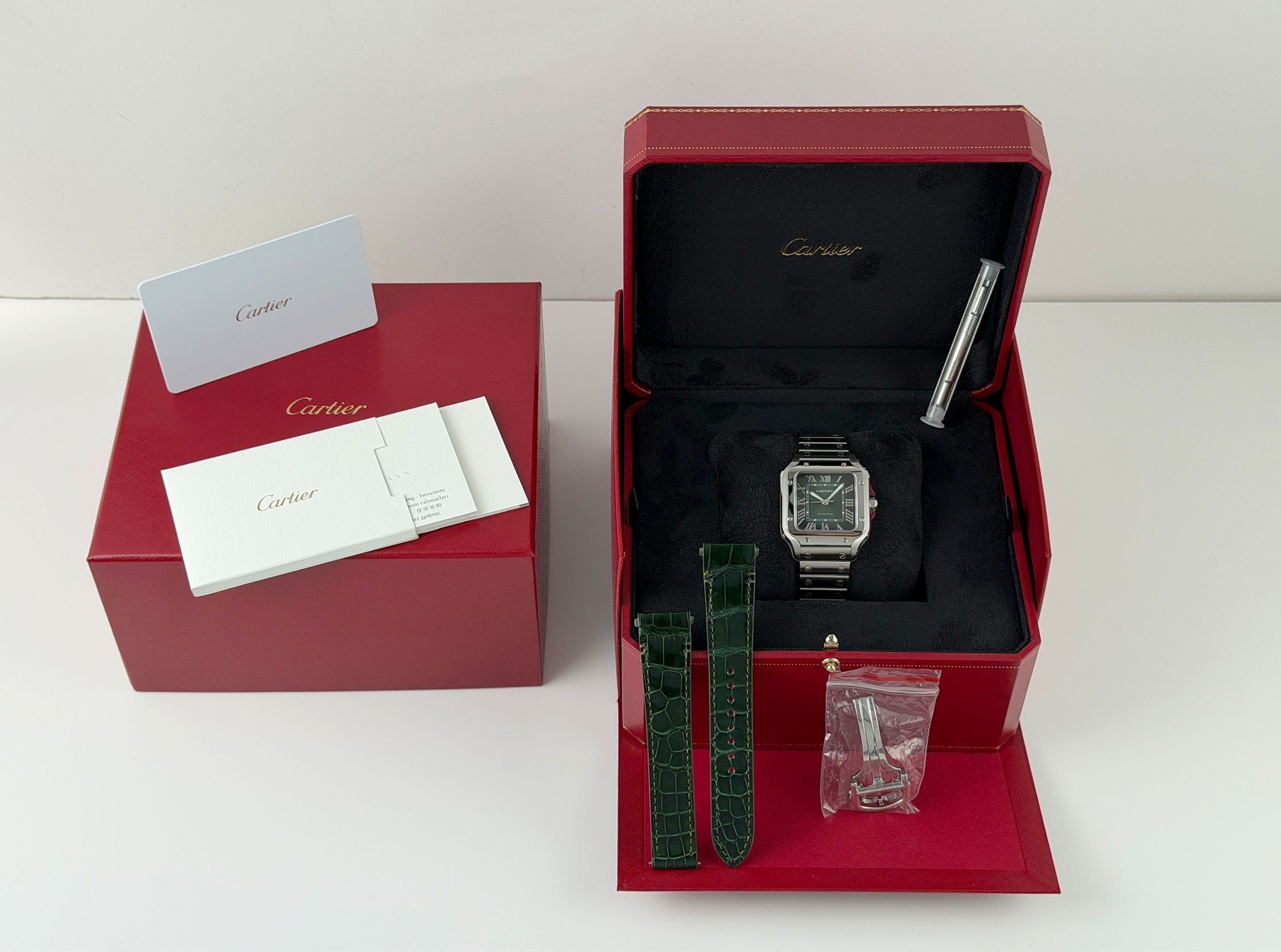 This Santos De Cartier WSSA0061 is new and unworn with original box, papers and the additional green leather strap and buckle combination.