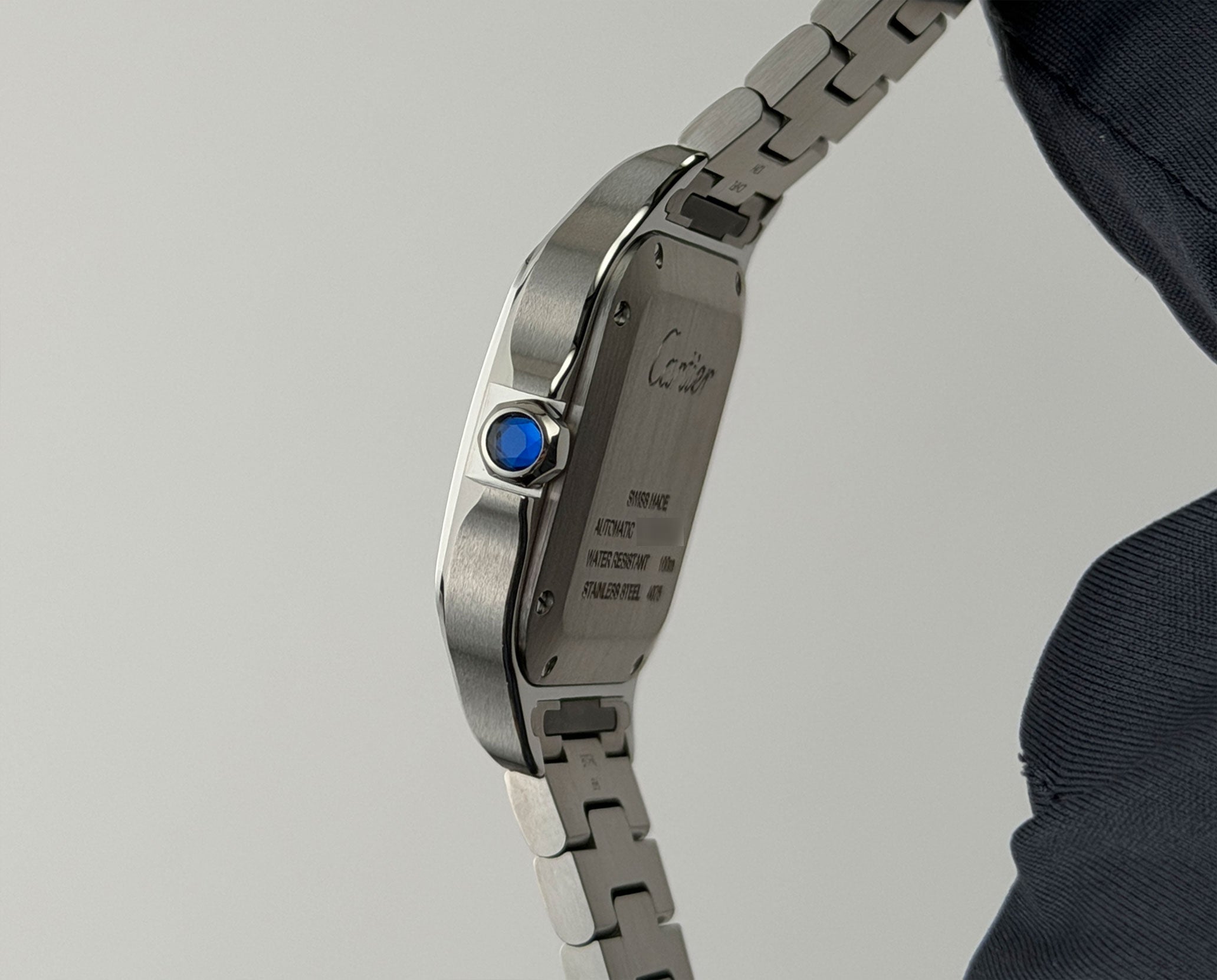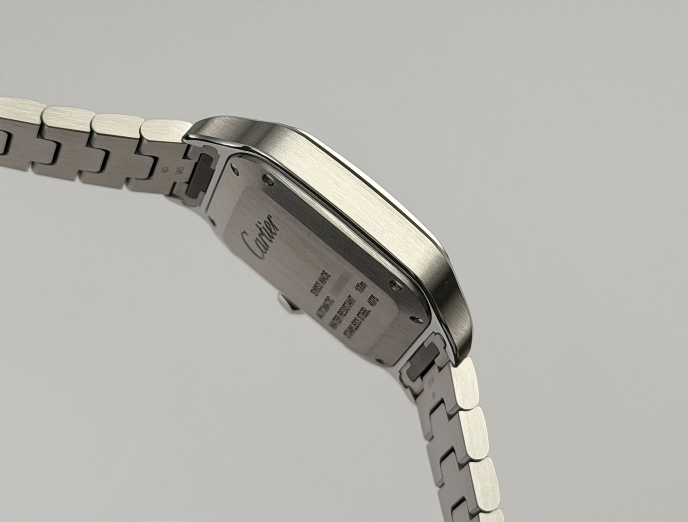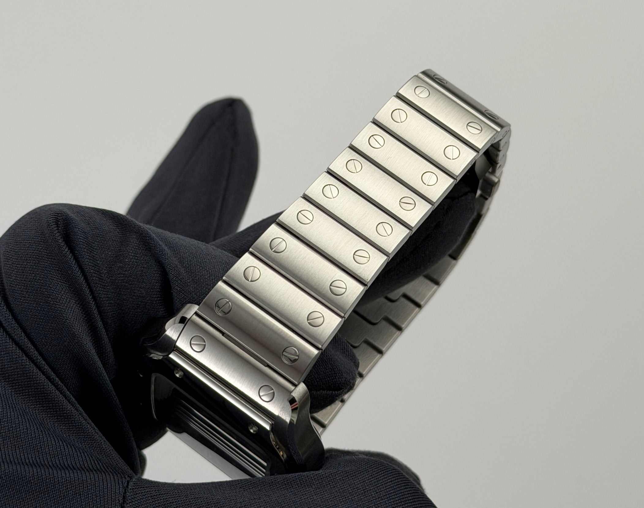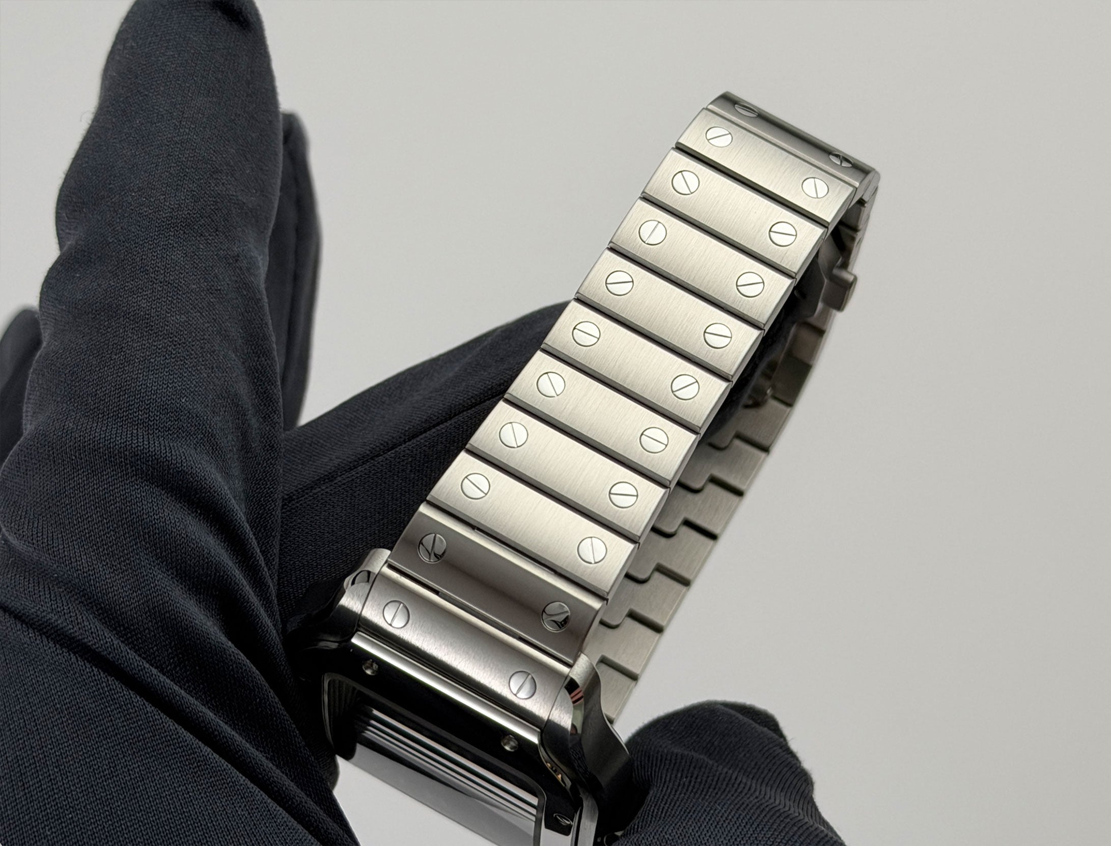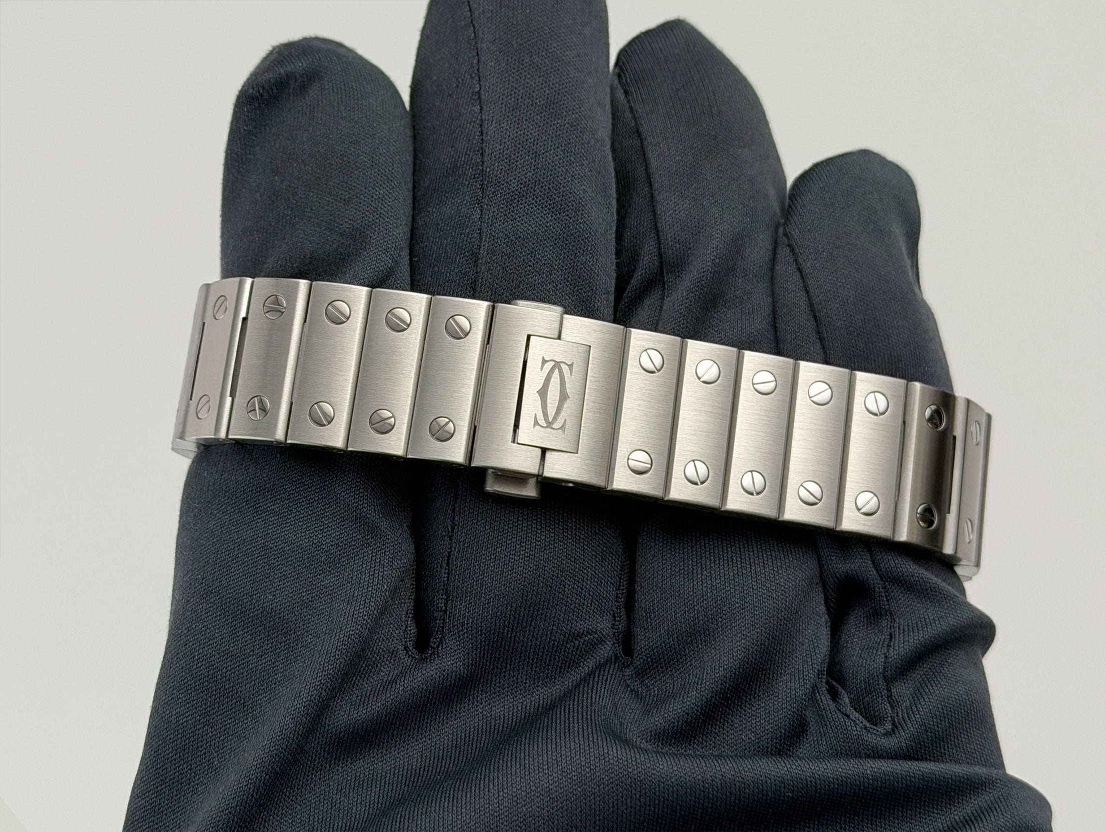 This Santos De Cartier WSSA0061 is new and unworn with original box, papers and the additional green leather strap and buckle combination.