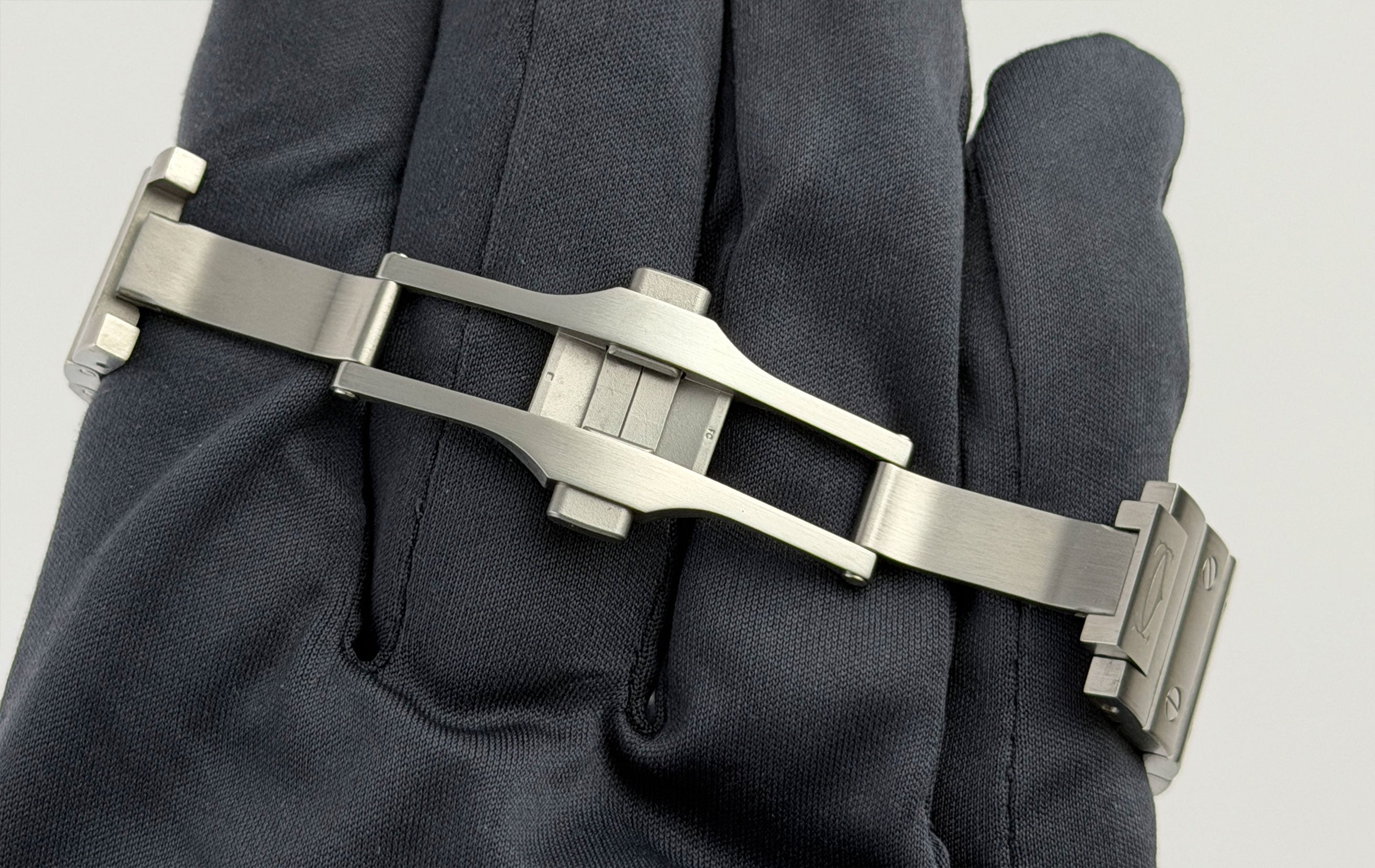 The case is made of a mostly satin-finished stainless steel, while the beveled edges and crown display a mirror finish. Mounded atop the case is a mirror-finish stainless steel bezel. The watch is paired with a satin-finished bracelet with mirror finished screws and a double folding clasp.