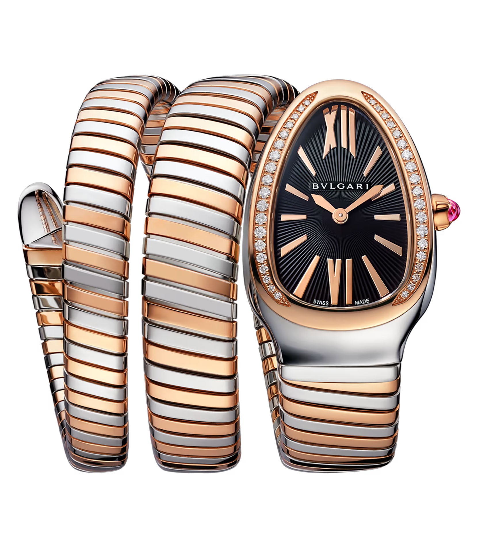 The case is made of a stainless steel mirror finish not including the mirror finish 18k rose gold crown with the cabochon spinel. Mounted atop the case is a mirror finish 18k rose gold diamond bezel. Paired with the watch is a double spiral combined stainless steel and 18k rose gold mirror finish bracelet.