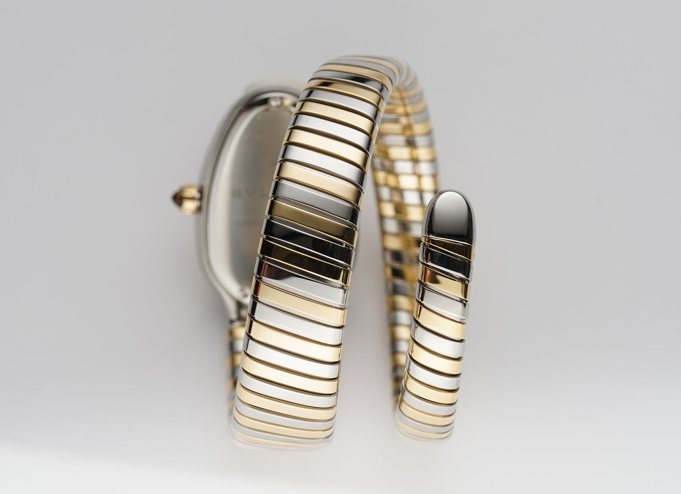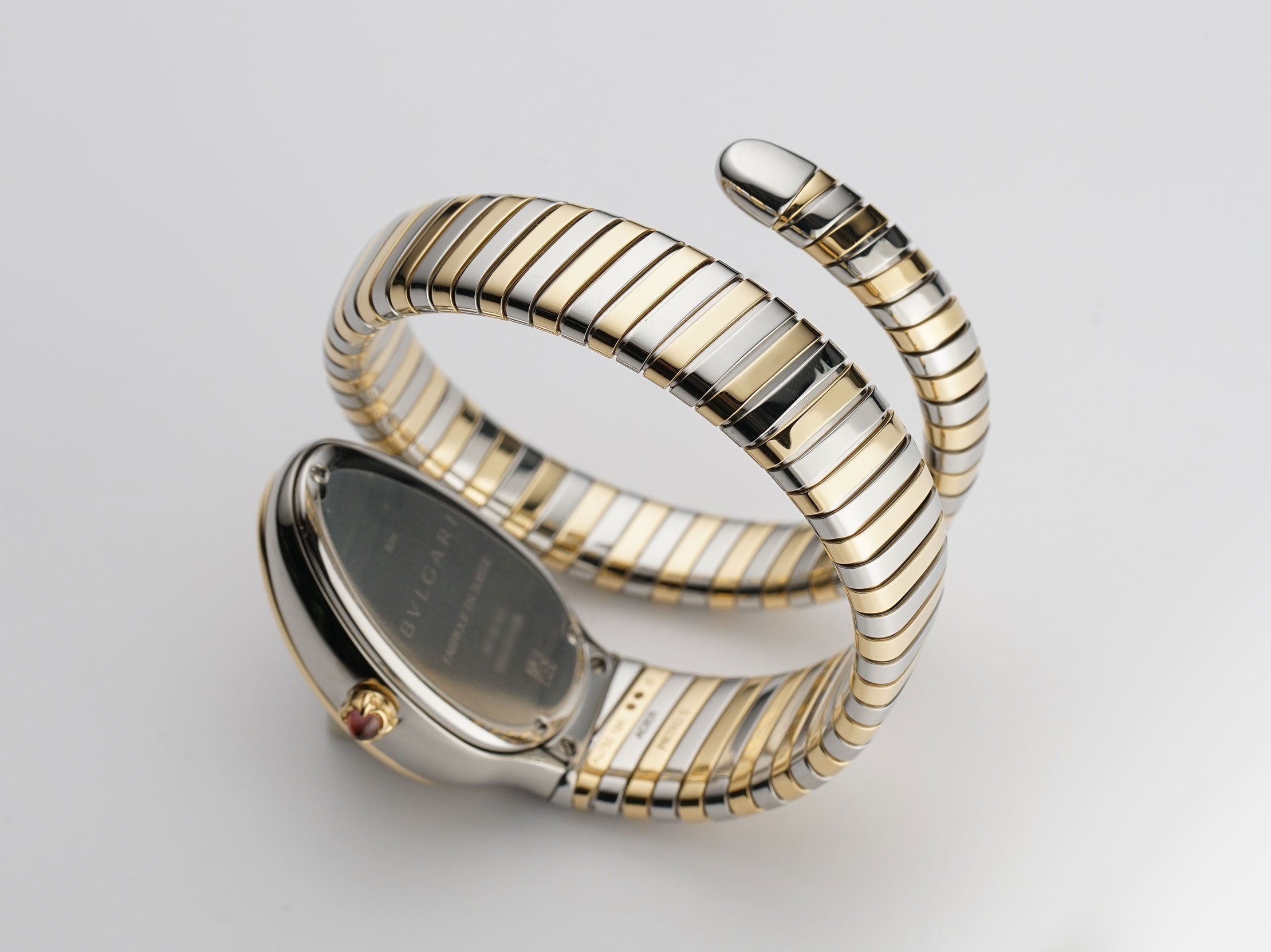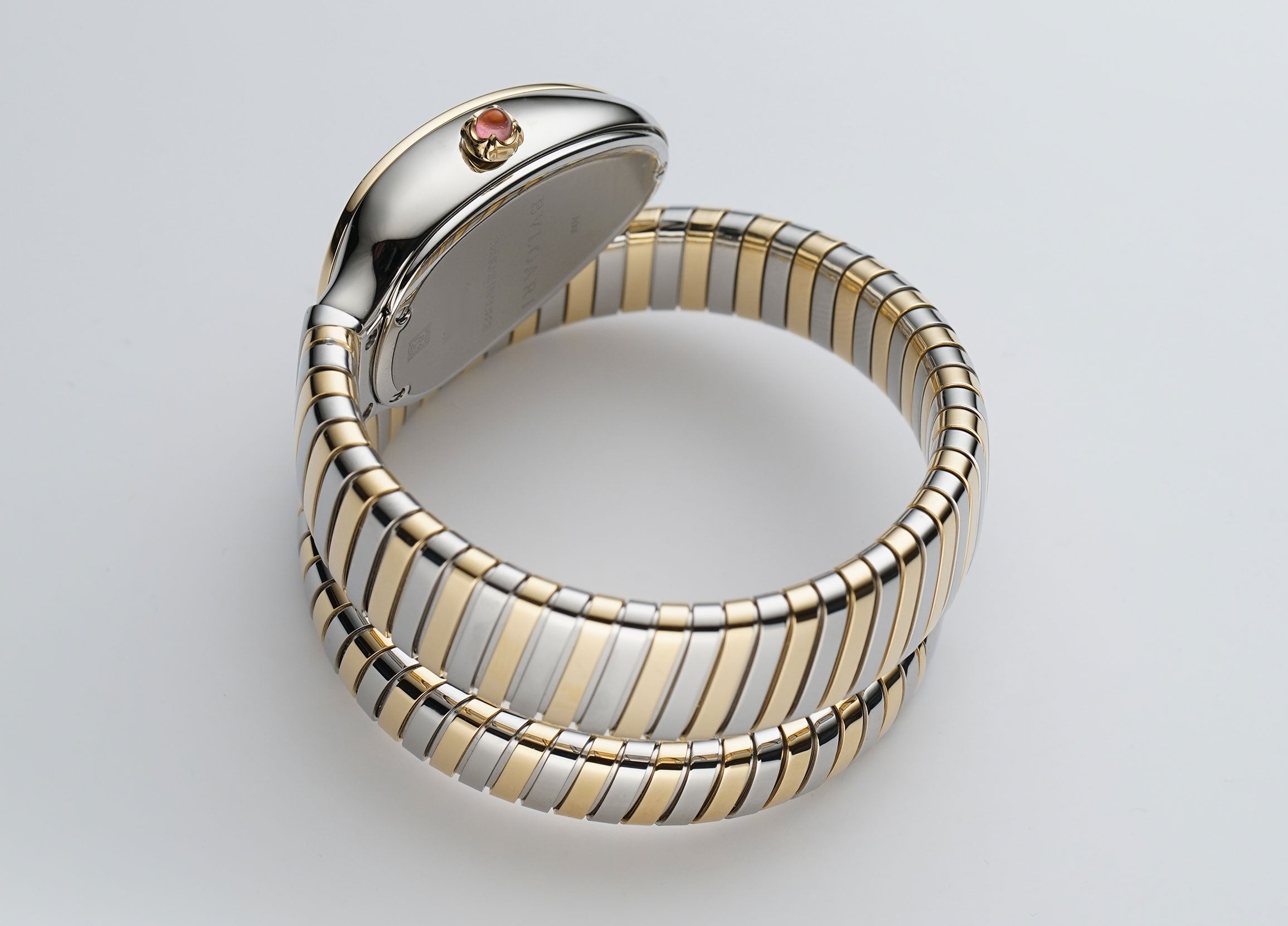 The case is made of a mirror finish stainless steel not including the crown which is of a mirror finish 18k yellow gold with a rubellite cabochon. Mounted atop the case is a mirror finish 18k yellow gold diamond bezel. Paired with the watch is an 18k yellow gold and steel single spiral bracelet.