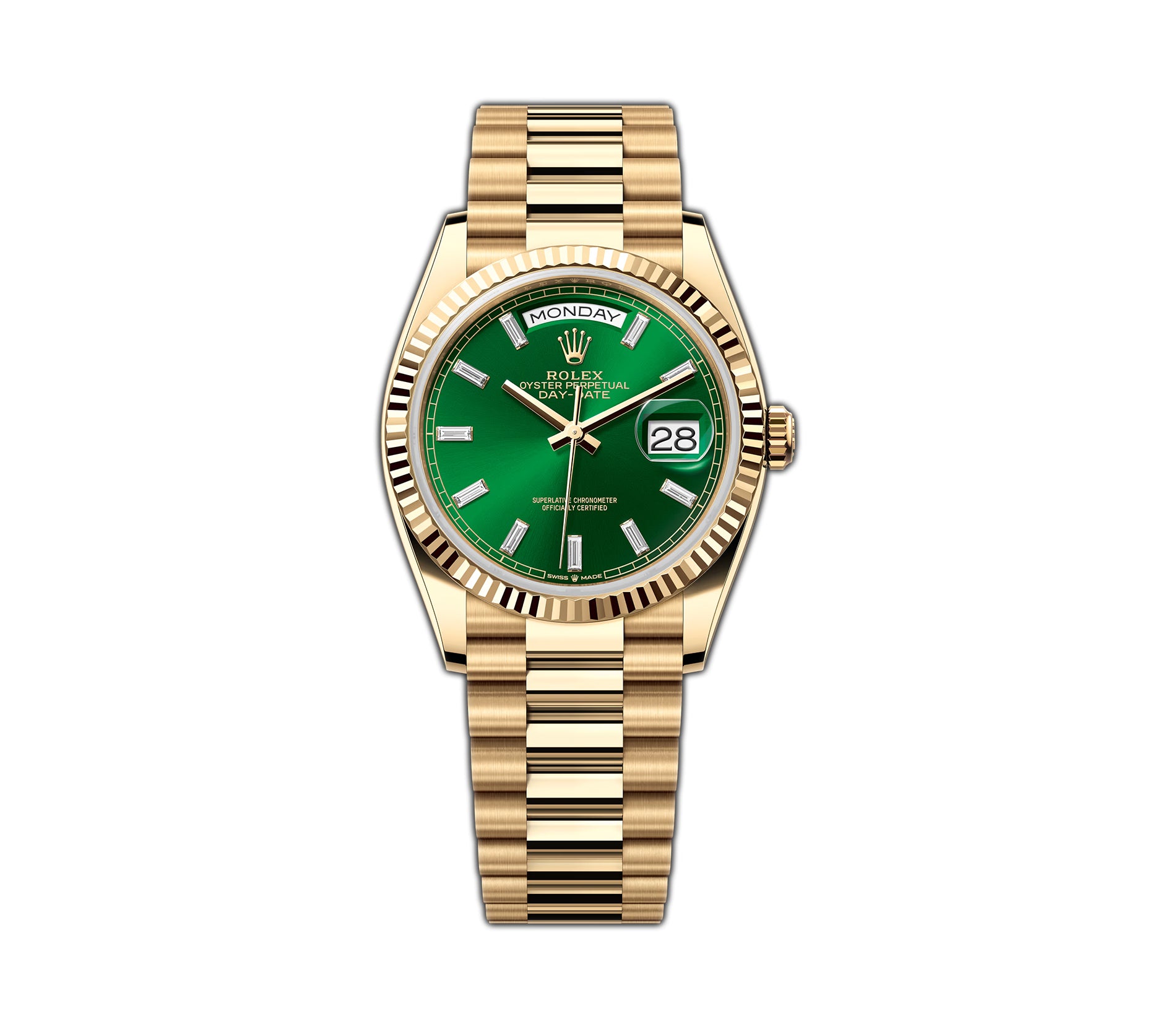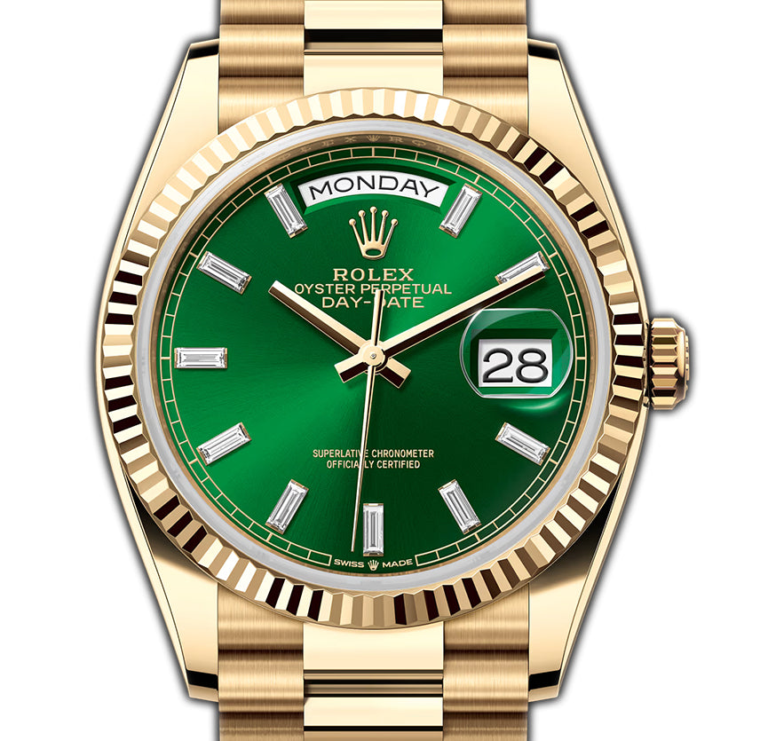 36mm President 18k Yellow Gold Green Baguette Diamond Dial