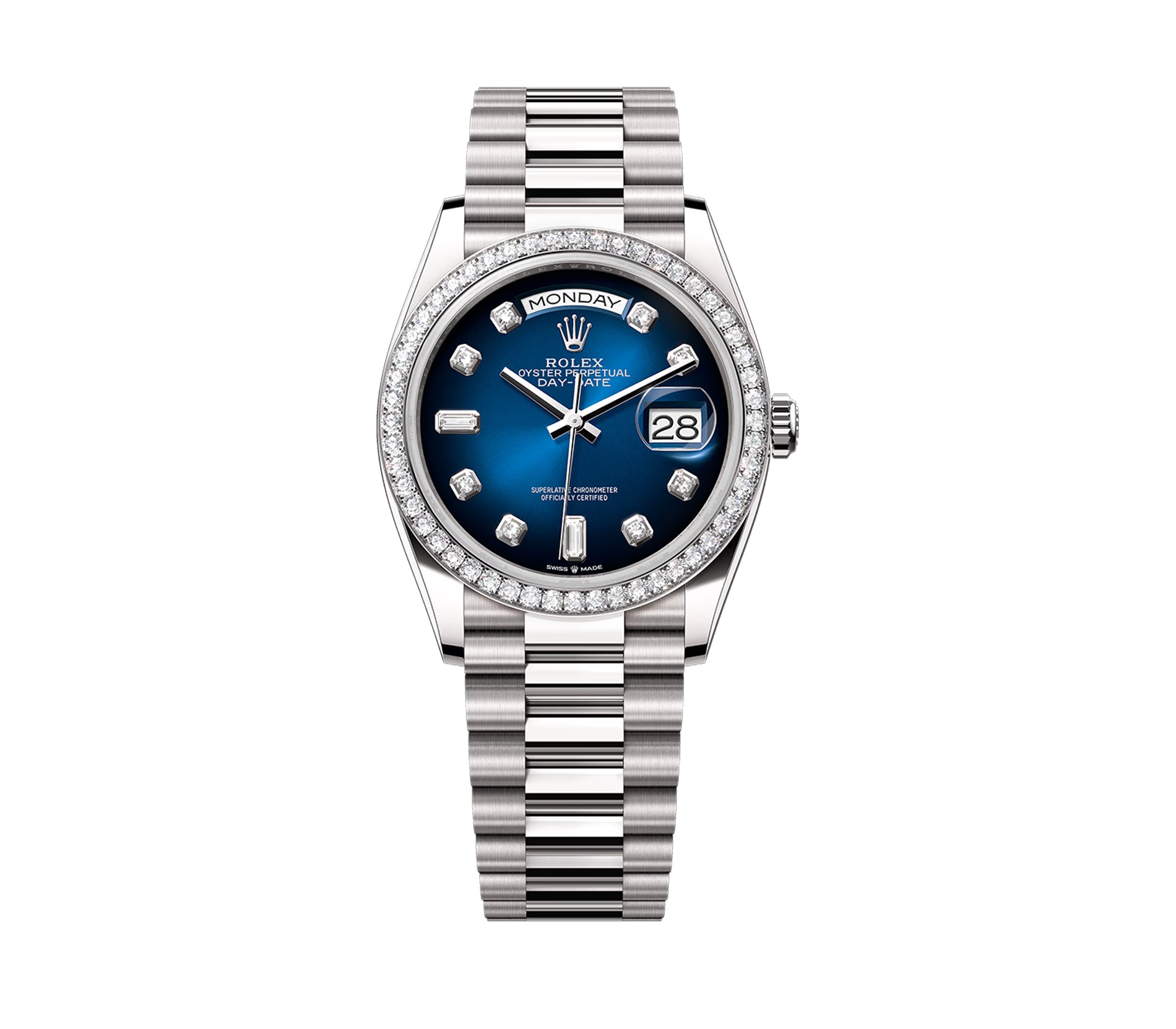 36mm 18k White Gold President Diamond Bezel Blue Ombré Baguette Diamond Dial