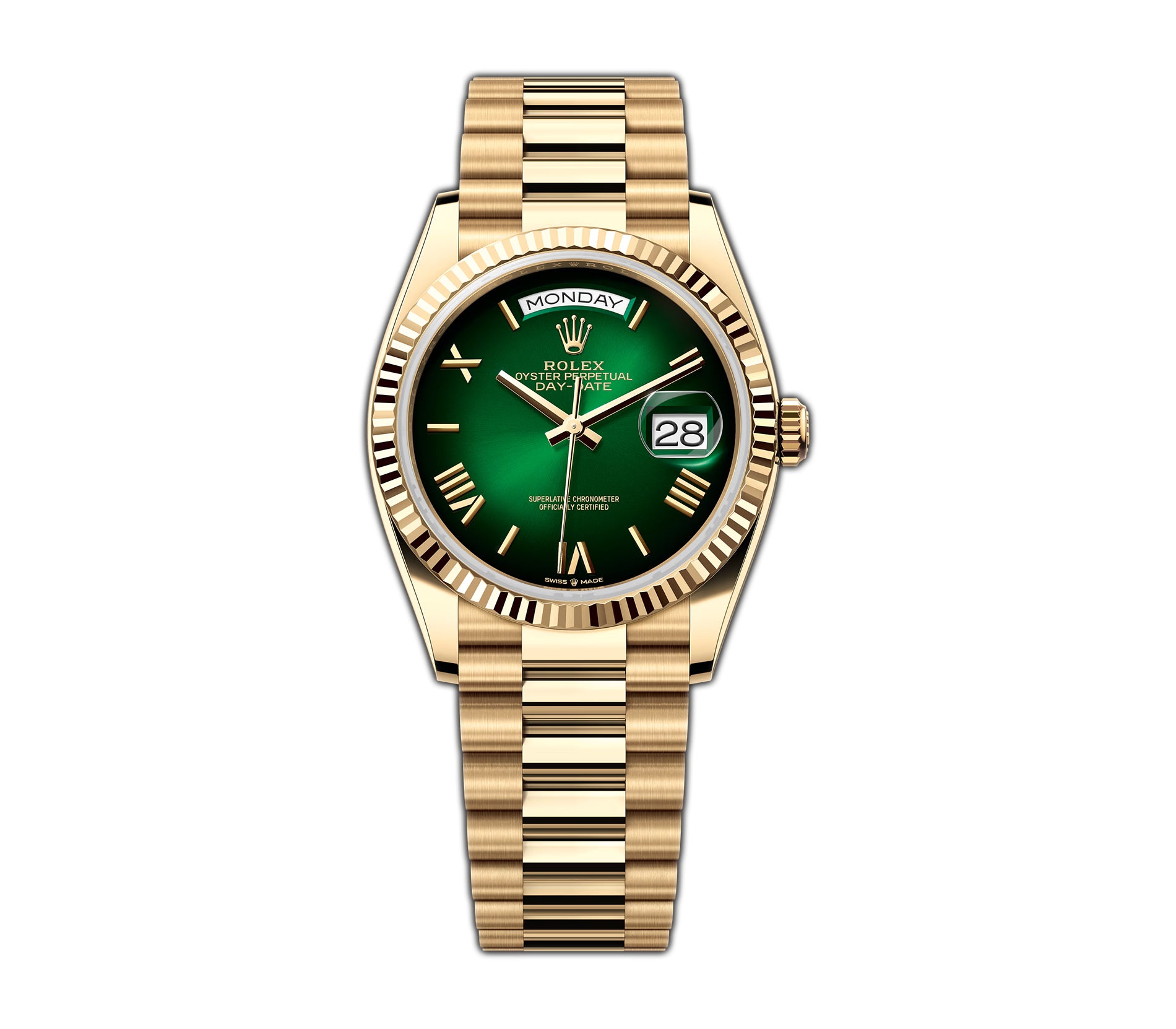 36mm 18k Yellow Gold President Green Ombre Roman Dial