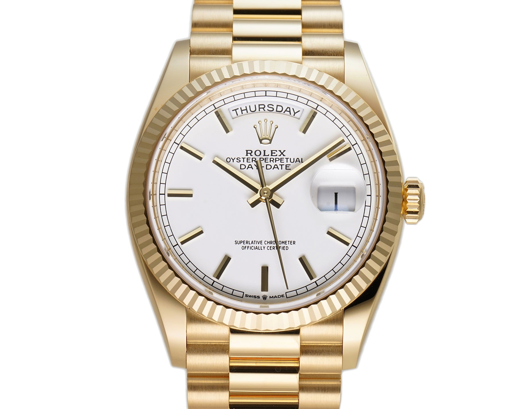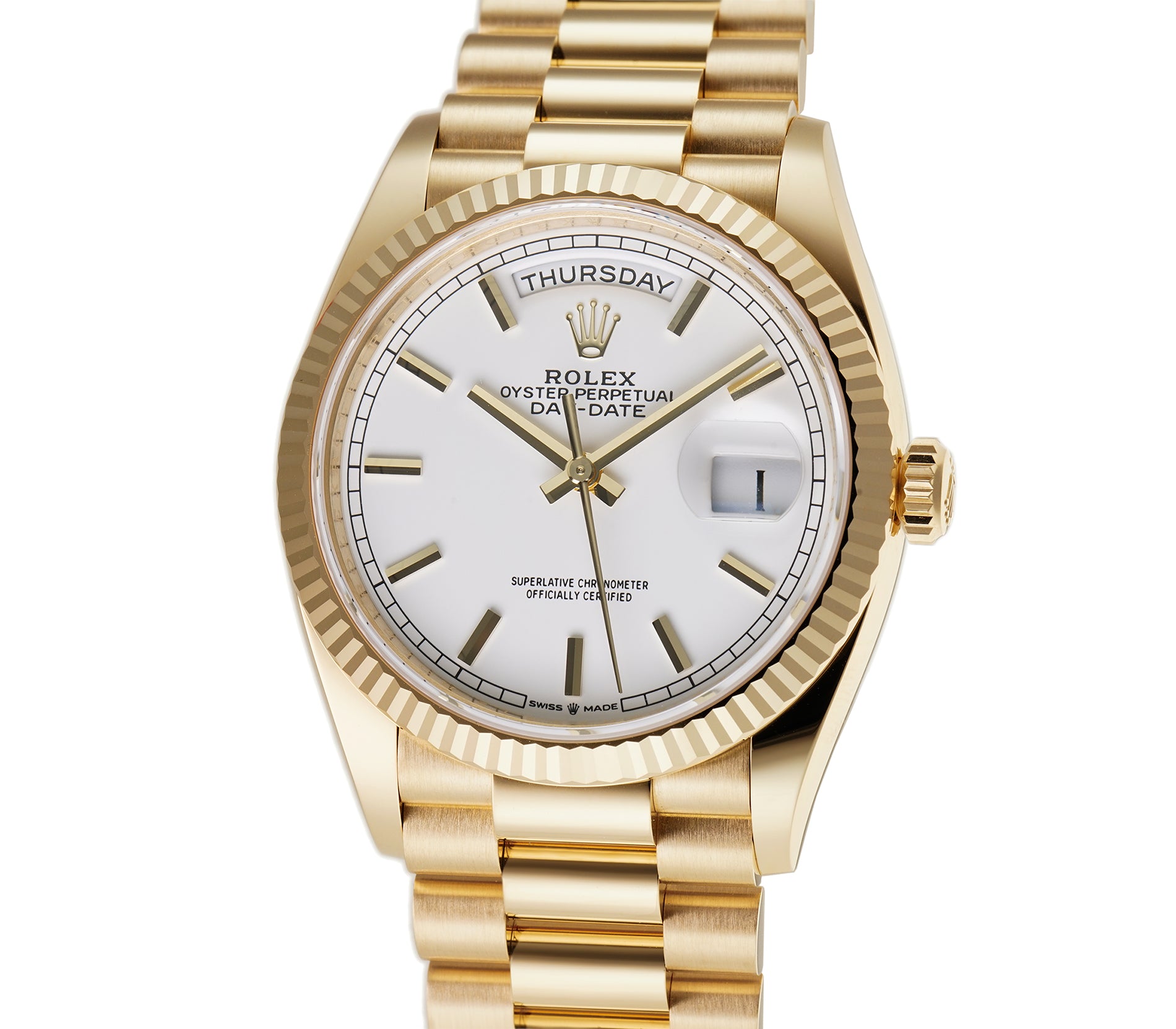 Case is made of high-polish finished 18k yellow gold and mounted atop the case is a high-polish finished fluted 18k yellow gold bezel. Screwed in to the case is an 18k yellow gold crown as well as an 18k yellow gold solid case back with mixed combination of high and satin polish finishes. The presidential bracelet is of the same material, with high-polish finished center links and brush-finished outer links.