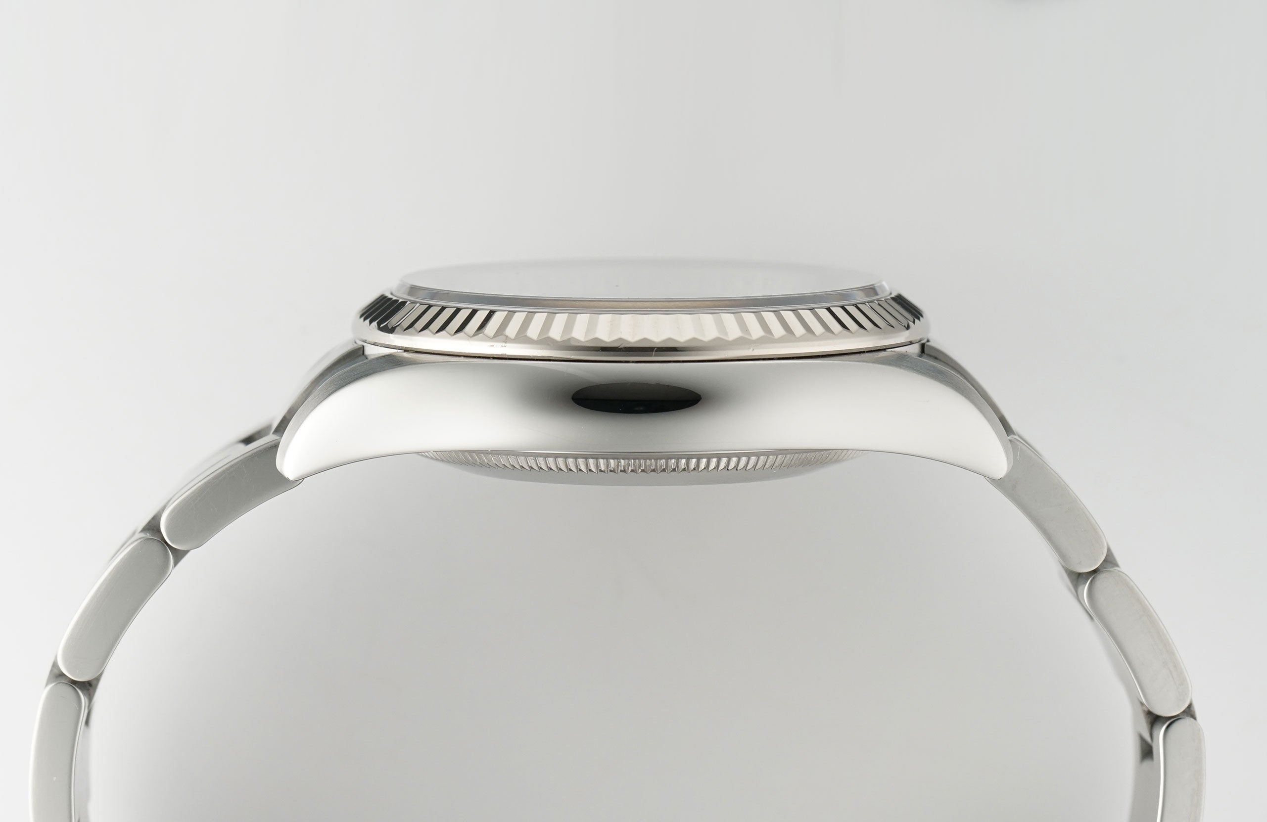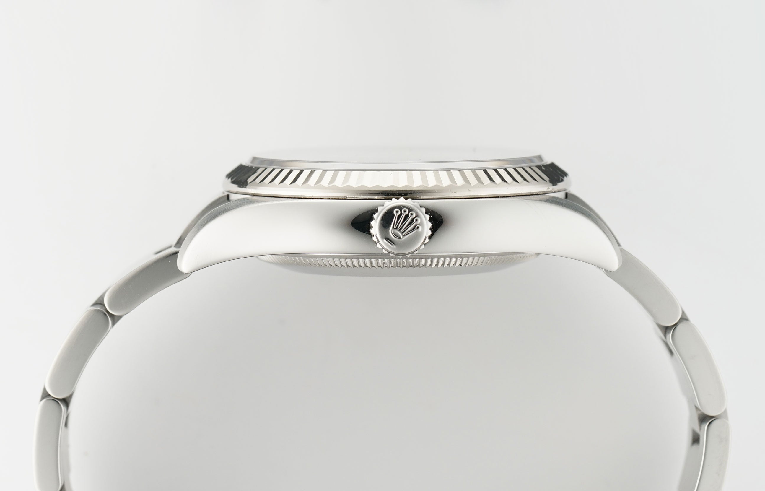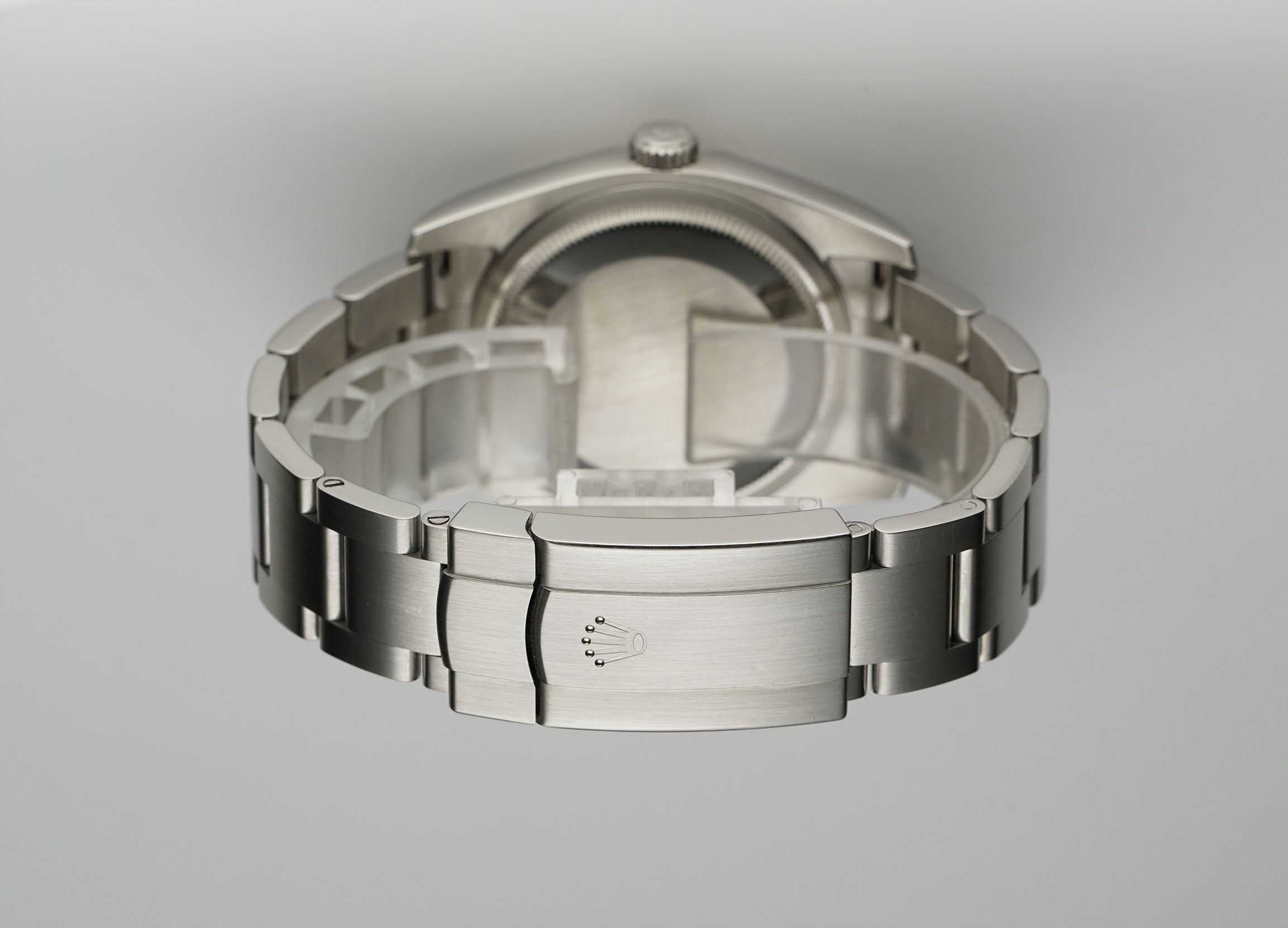 The case is made of stainless steel with satin finished lugs and mirror finished sides. It is equipped with a screw-down crown and case back, both of which are stainless steel as well. Mounted atop the case is a mirror-finished 18k white gold fluted bezel. The watch is paired with a stainless steel Oyster bracelet (fits up to an approximate 6.75 inch wrist). It is mostly satin finish with only the sides of the links displaying a mirror finish.
