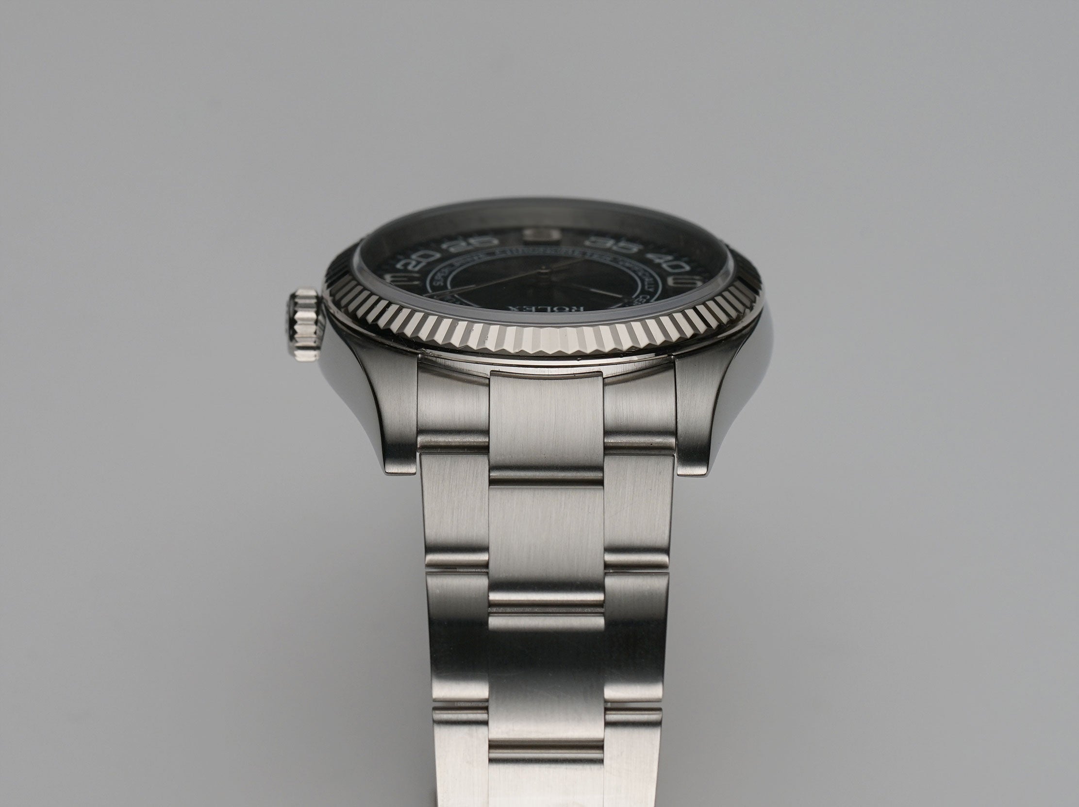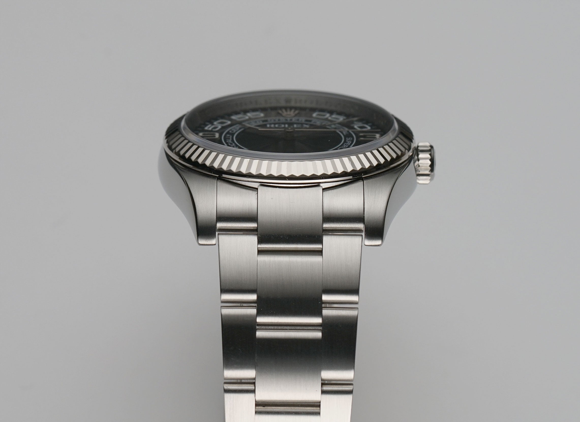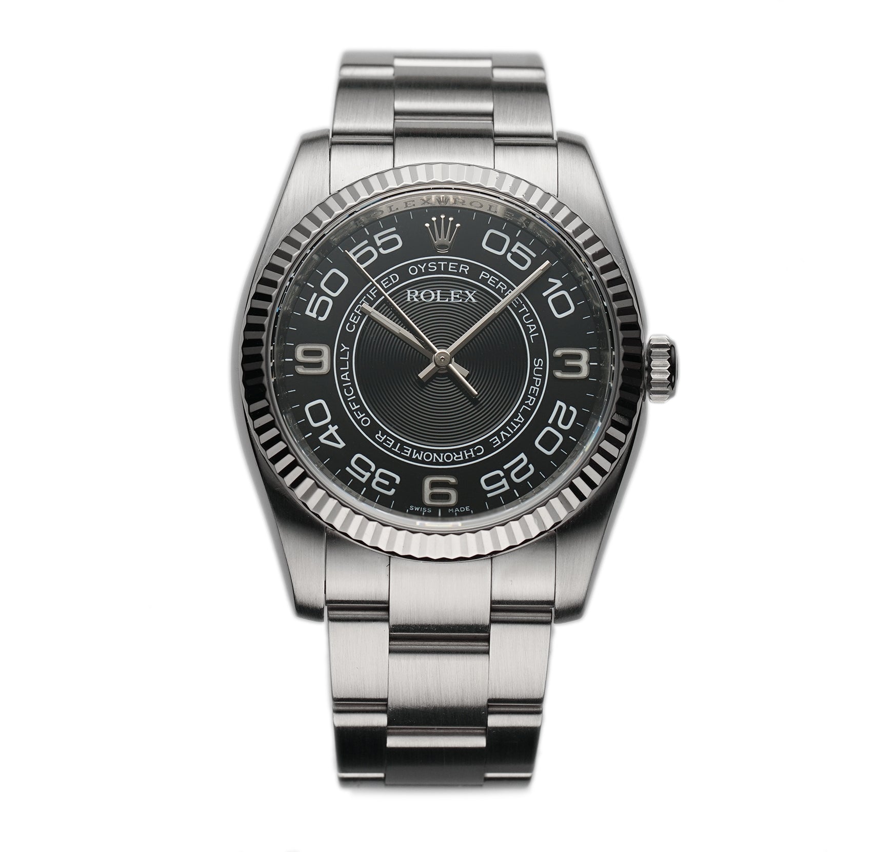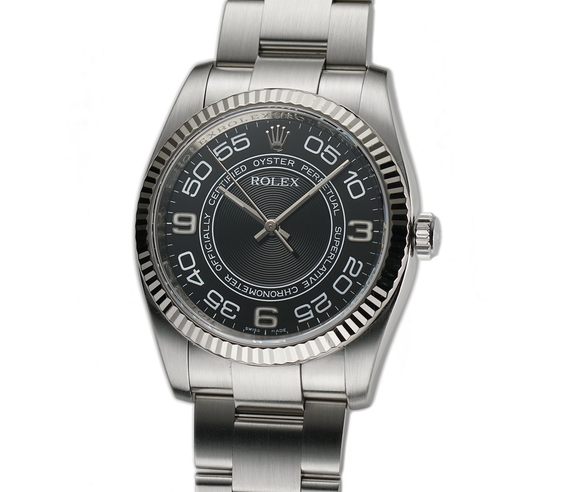 The case is made of stainless steel with satin finished lugs and mirror finished sides. It is equipped with a screw-down crown and case back, both of which are stainless steel as well. Mounted atop the case is a mirror-finished 18k white gold fluted bezel. The watch is paired with a stainless steel Oyster bracelet (fits up to an approximate 6.75 inch wrist). It is mostly satin finish with only the sides of the links displaying a mirror finish.