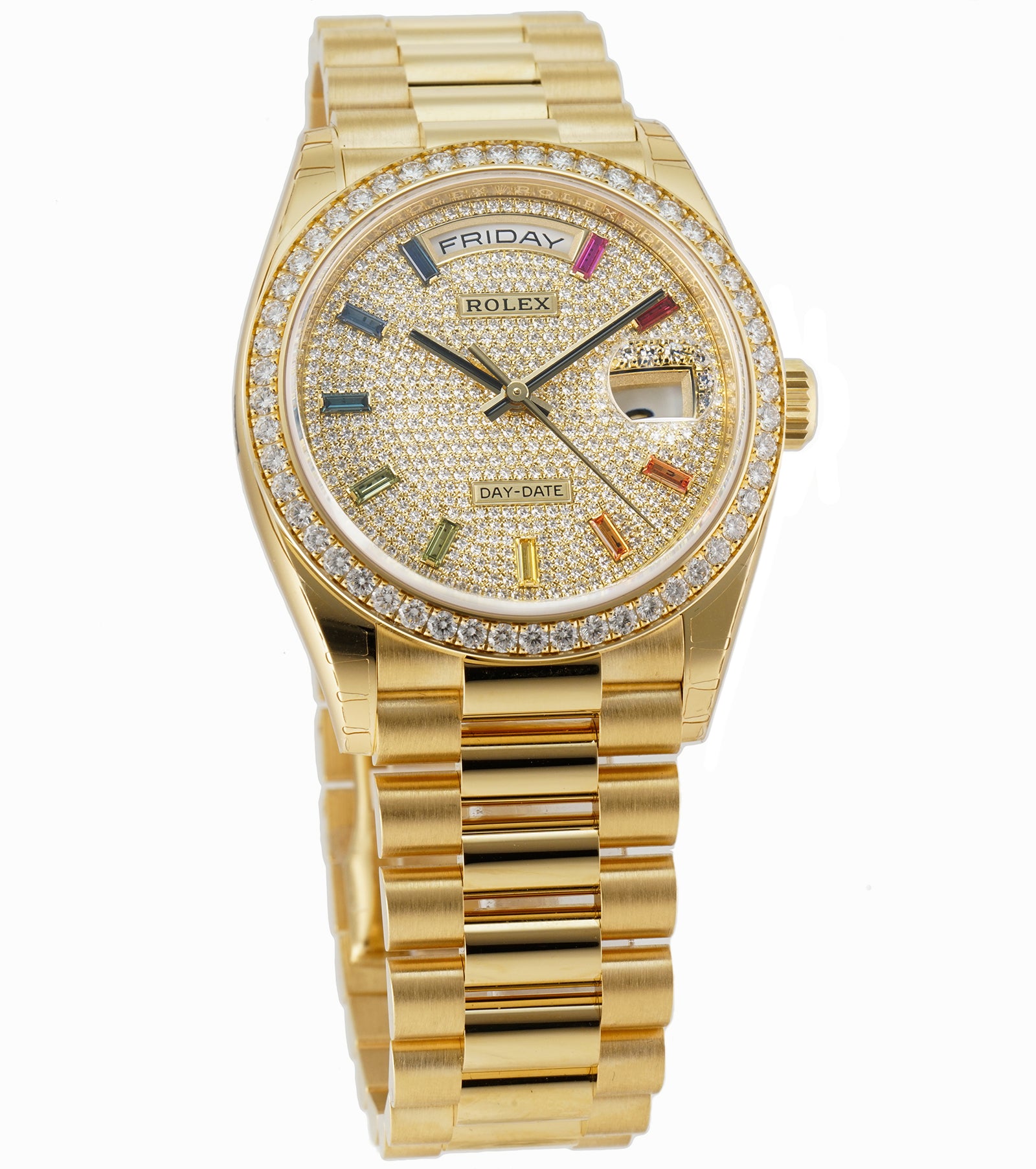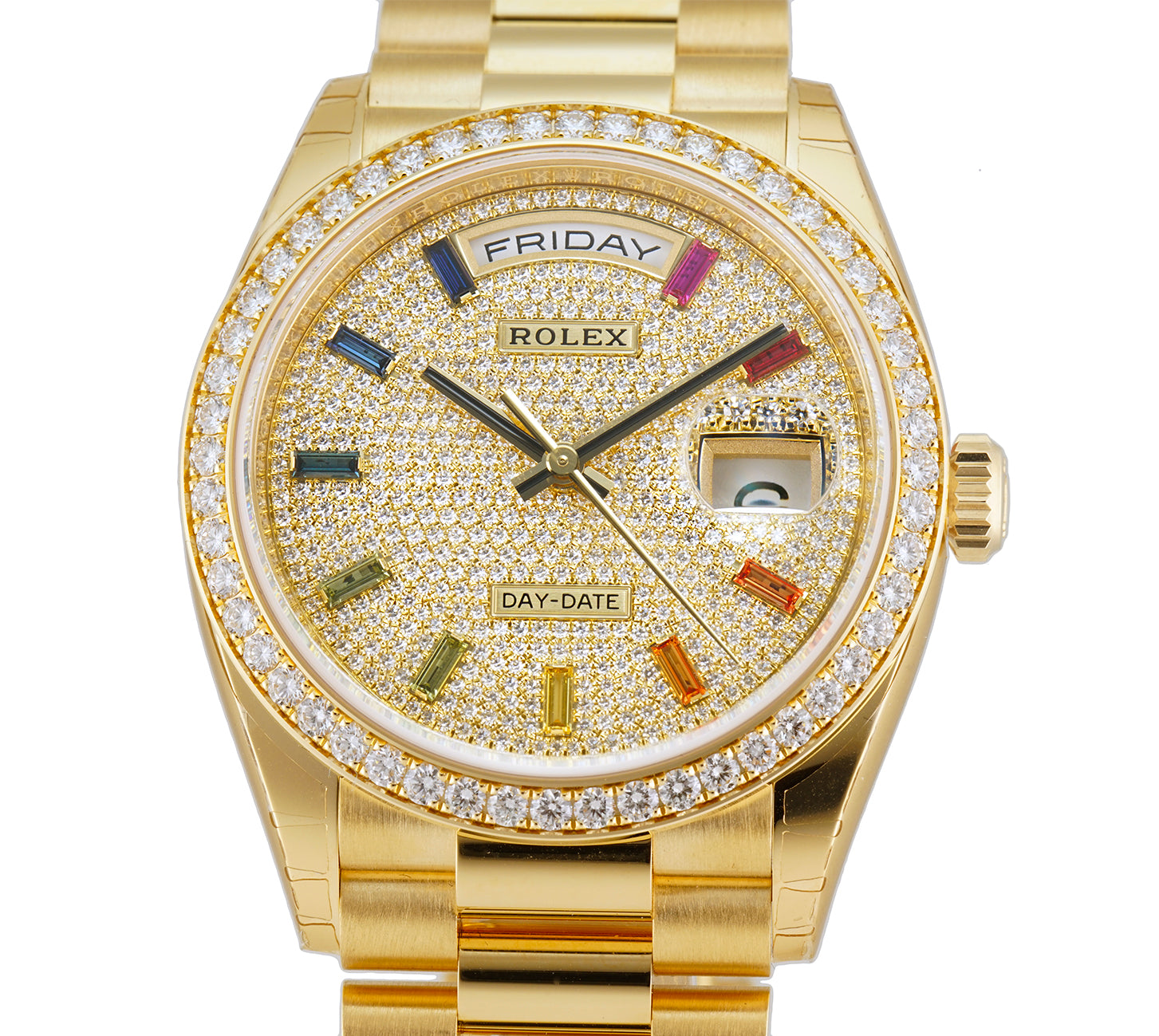 Not your every day watch, dial is diamond-paved throughout and it is accompanied by rainbow-colored baguette hour markers. The 18k yellow gold bezel surrounding the face is also set with diamonds. Case is made of high-polish finished 18k yellow gold and is equipped with a screw-down case back as well as a screw down crown. Watch comes on an 18k yellow gold president's bracelet which has high-polish finished center links and brush-finished outer links.