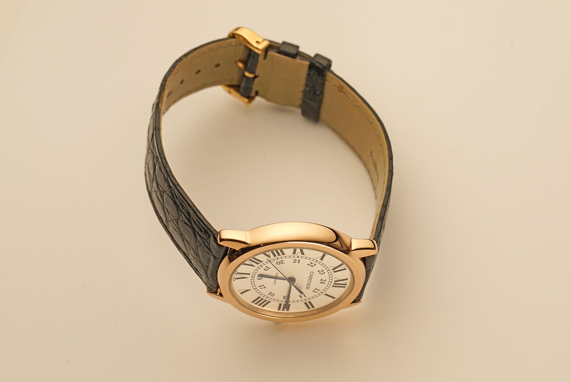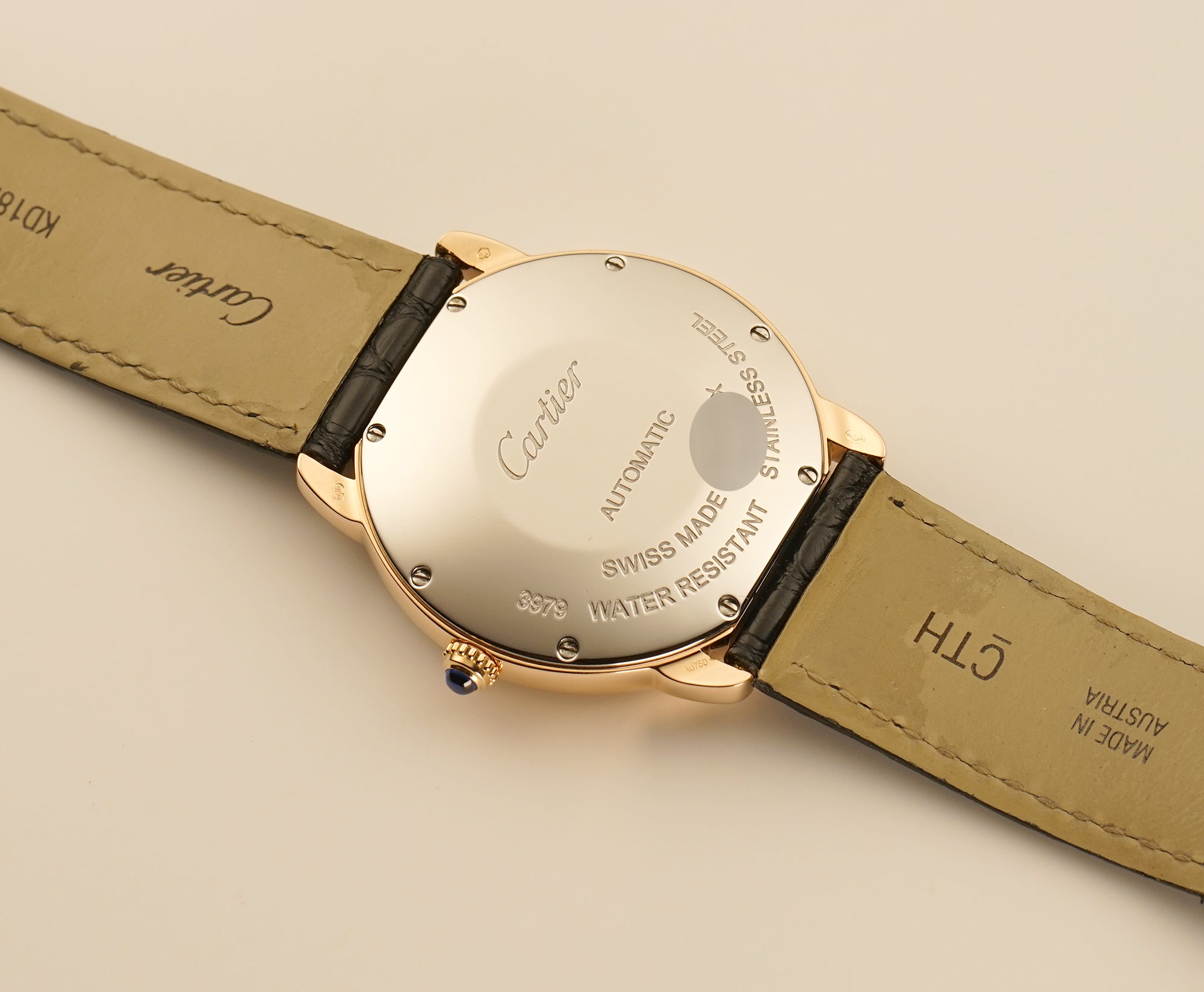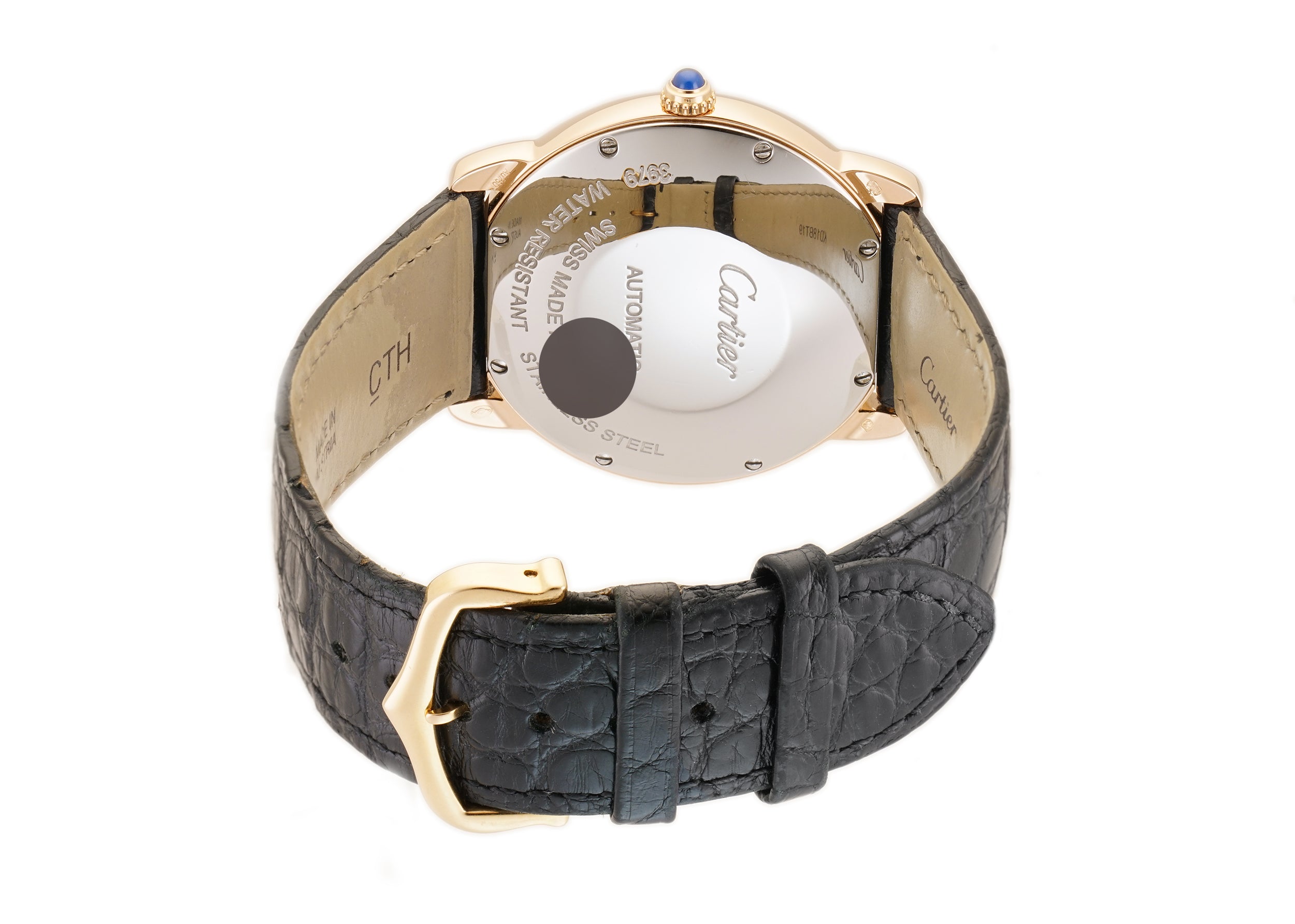 Case is made of 18k rose gold, all of which displays a high-polish finish. As for the case back, it is stainless steel but also of high-polish finish. Currently mounted on the watch is an original Cartier black leather strap (70% condition). It is all tied together with the help of an original Cartier 18k rose gold tang buckle.