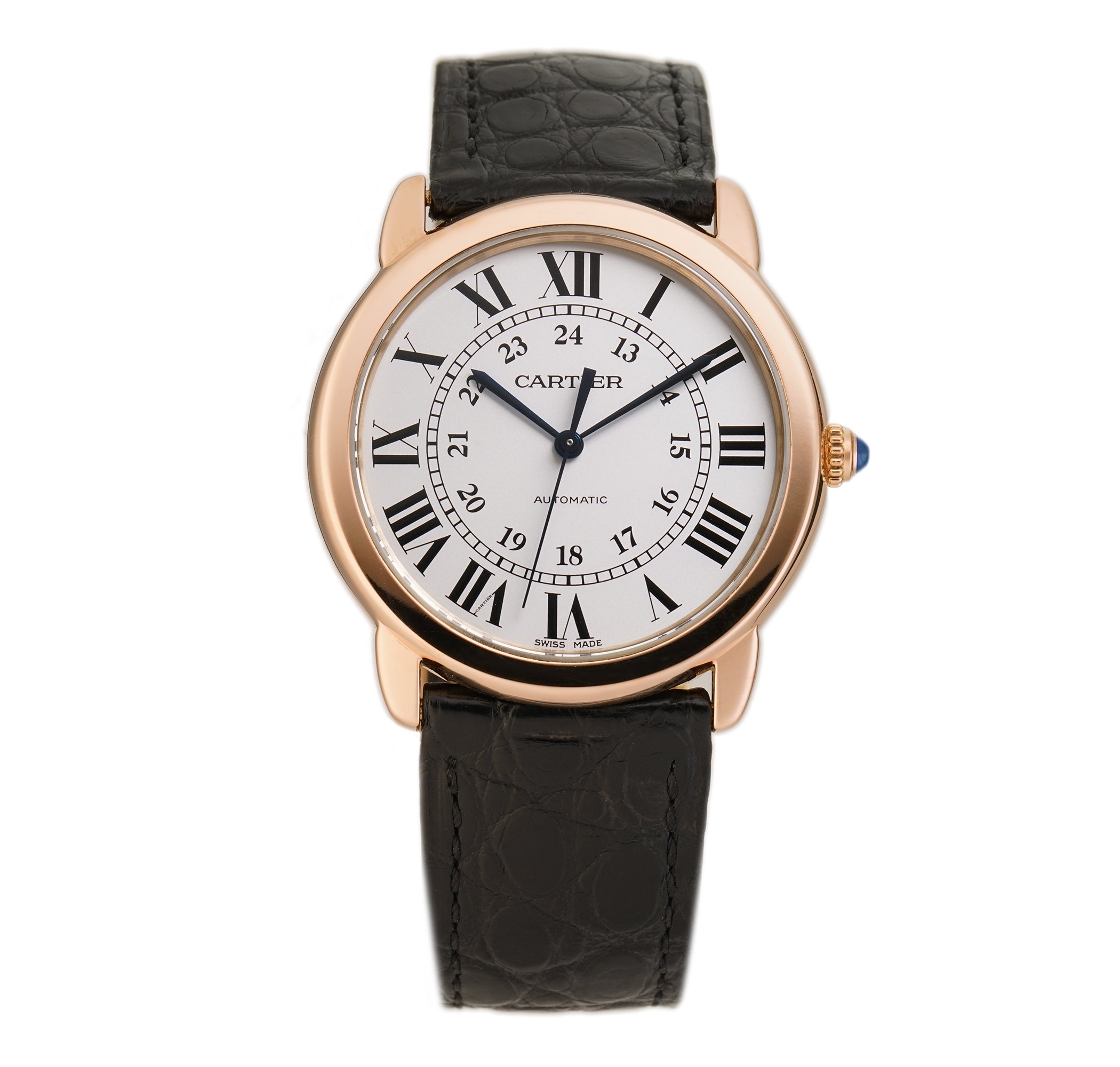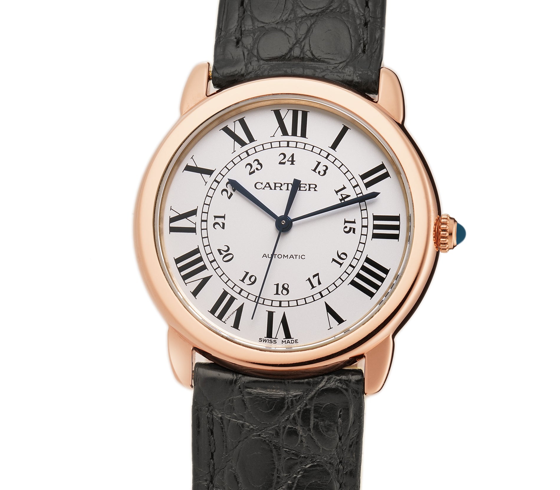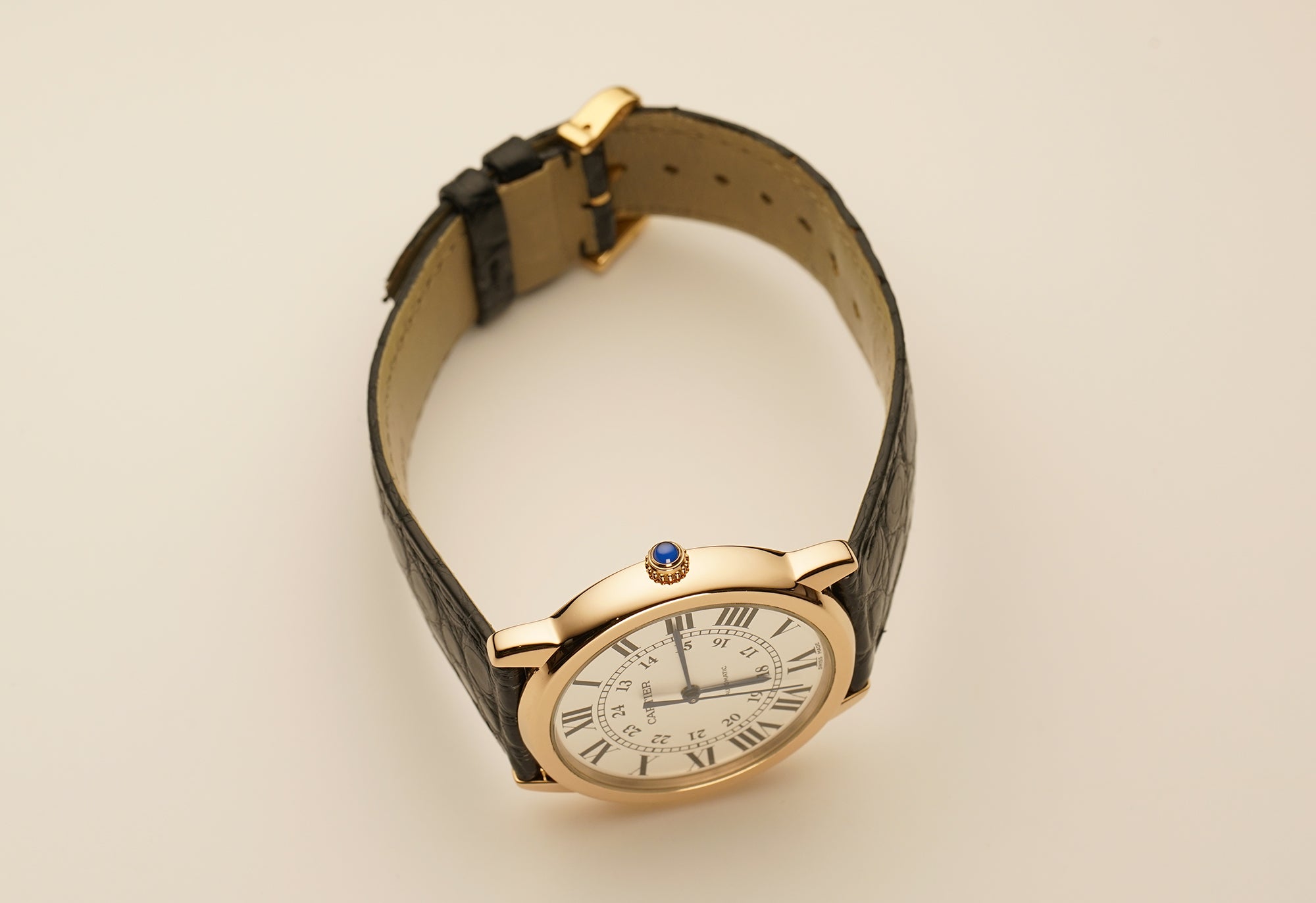 Case is made of 18k rose gold, all of which displays a high-polish finish. As for the case back, it is stainless steel but also of high-polish finish. Currently mounted on the watch is an original Cartier black leather strap (70% condition). It is all tied together with the help of an original Cartier 18k rose gold tang buckle.