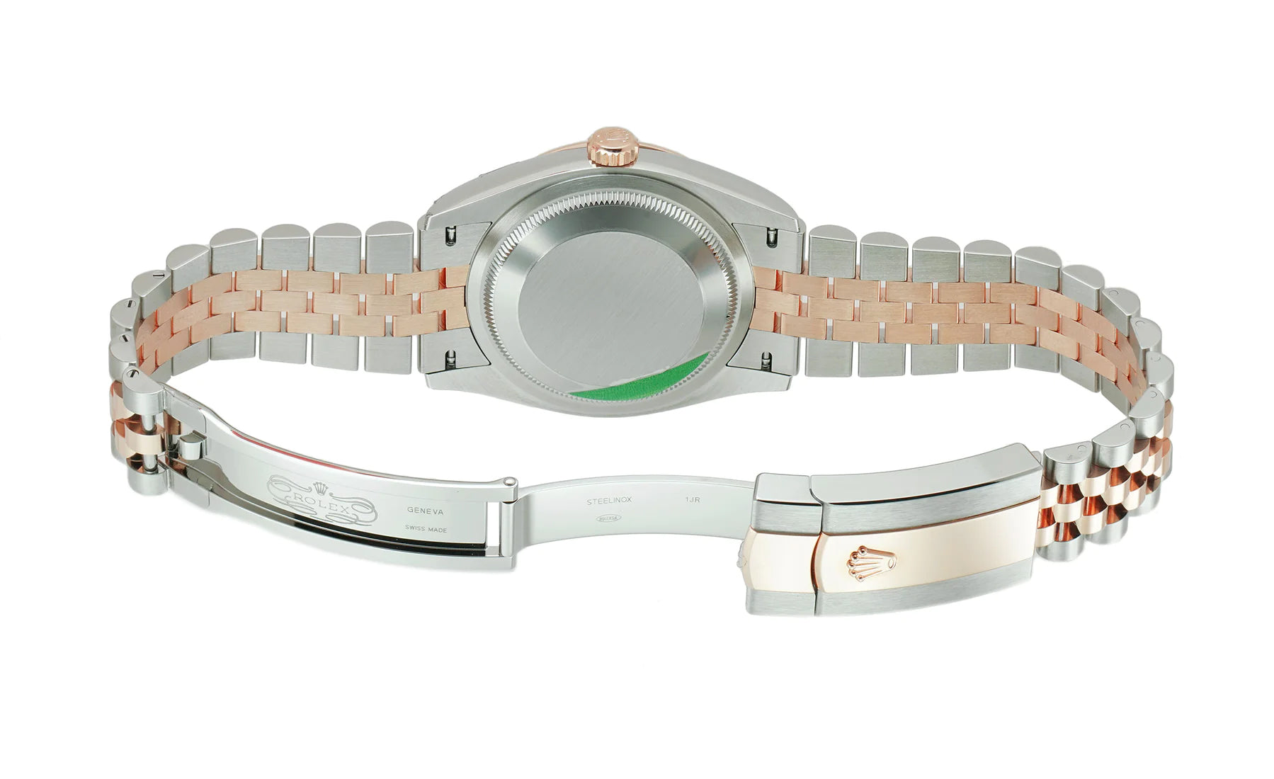 This watch features a high polished finish stainless steel case with an 18k rose gold crown. Mounted atop the case is an 18k everose gold fluted bezel with high polished finishes. The watch is paired with a satin finished stainless steel and high polished finished 18k rose gold jubilee bracelet fixed on the wrist with a combined stainless steel and rose gold deployment buckle.