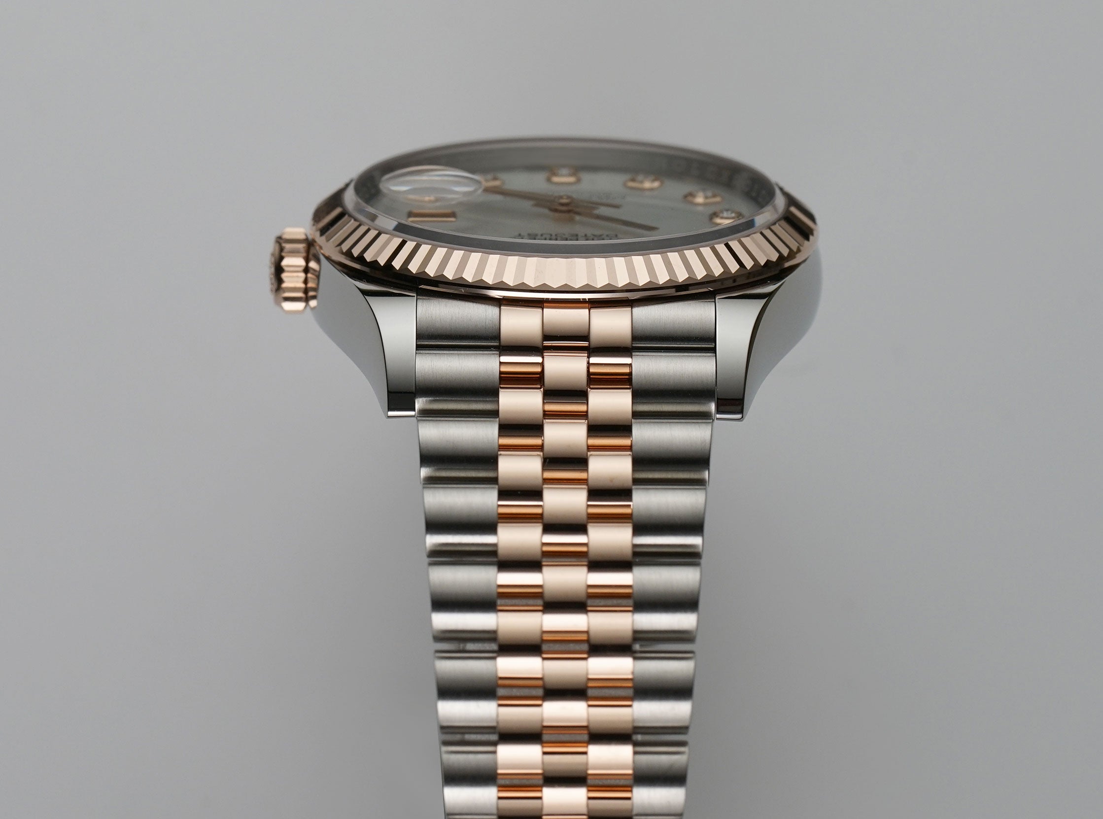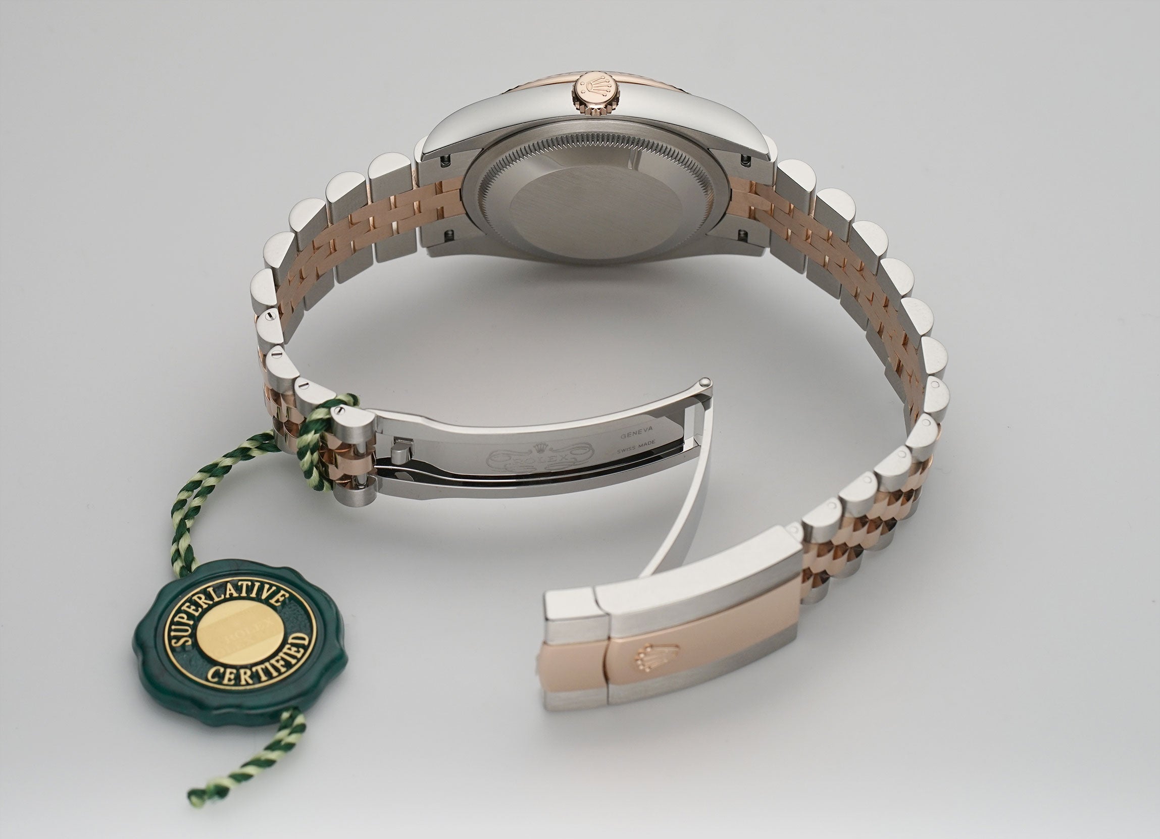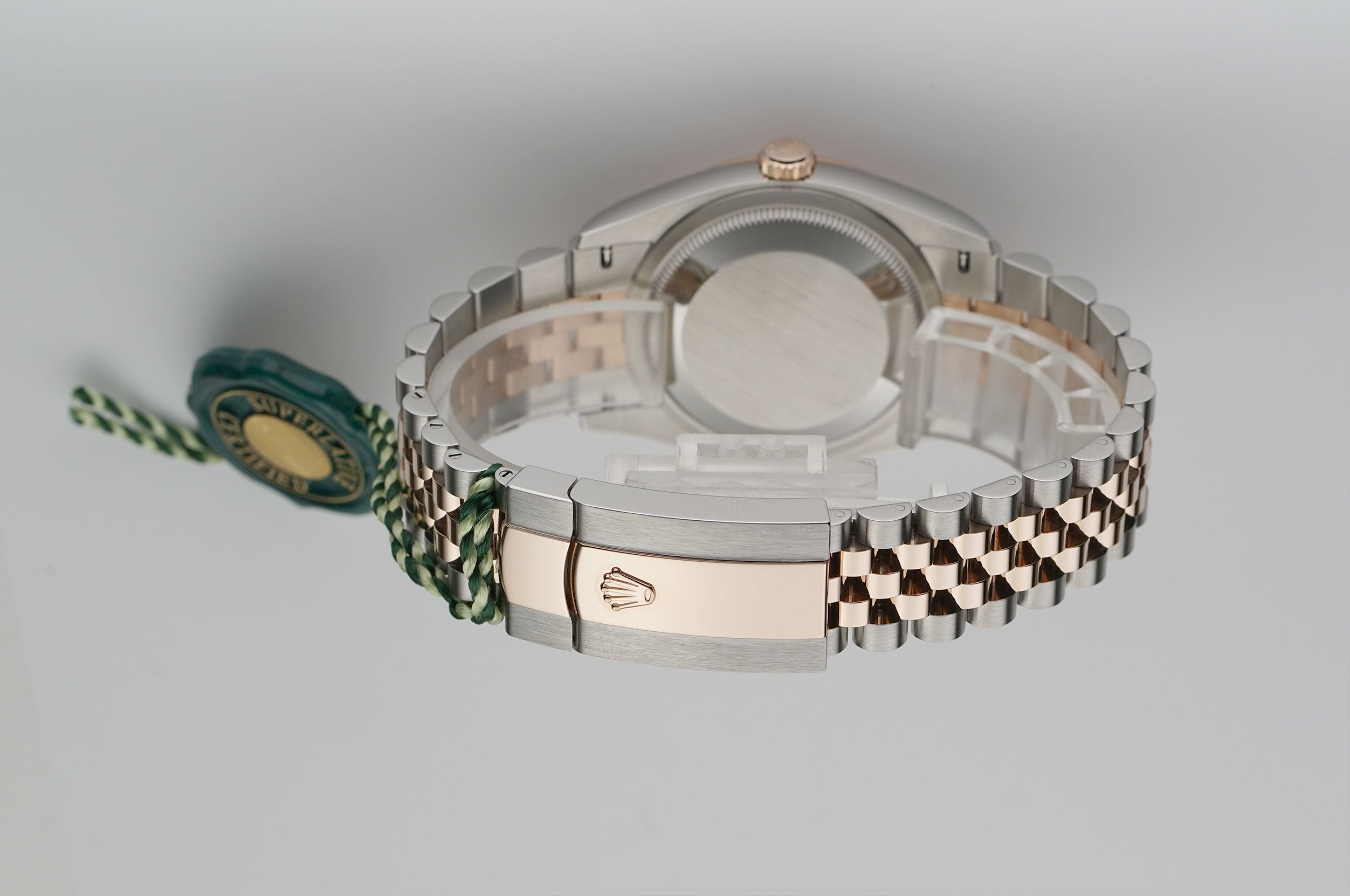 The case is made of mirror-finished stainless steel and equipped with an 18k rose gold fluted bezel mounted atop. It also features a stainless steel screw-down case back and an 18k rose gold screw-down crown. The watch is paired with a two tone jubilee bracelet with mirror-finished 18k rose gold center links and satin finished stainless steel outer links.
