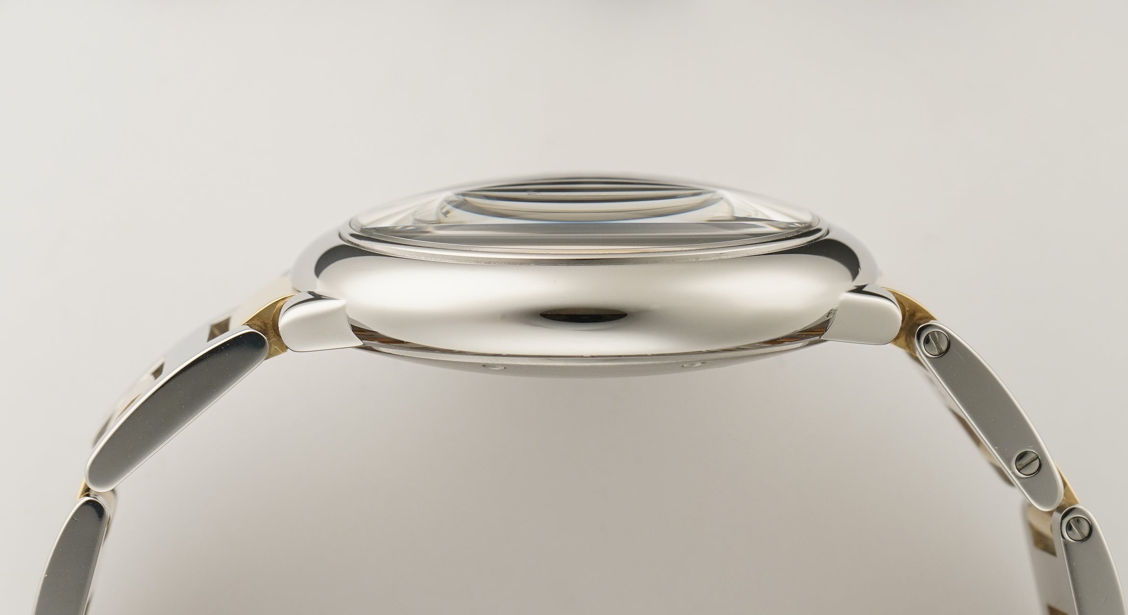 The case is made of a mirror finish stainless steel including the crown guard. Mounted atop the case is a mirror finish stainless steel bezel. Paired with the watch is a mirror finish stainless steel and 18k yellow gold mirror finish bracelet (fits up to a 6.5 inch wrist).