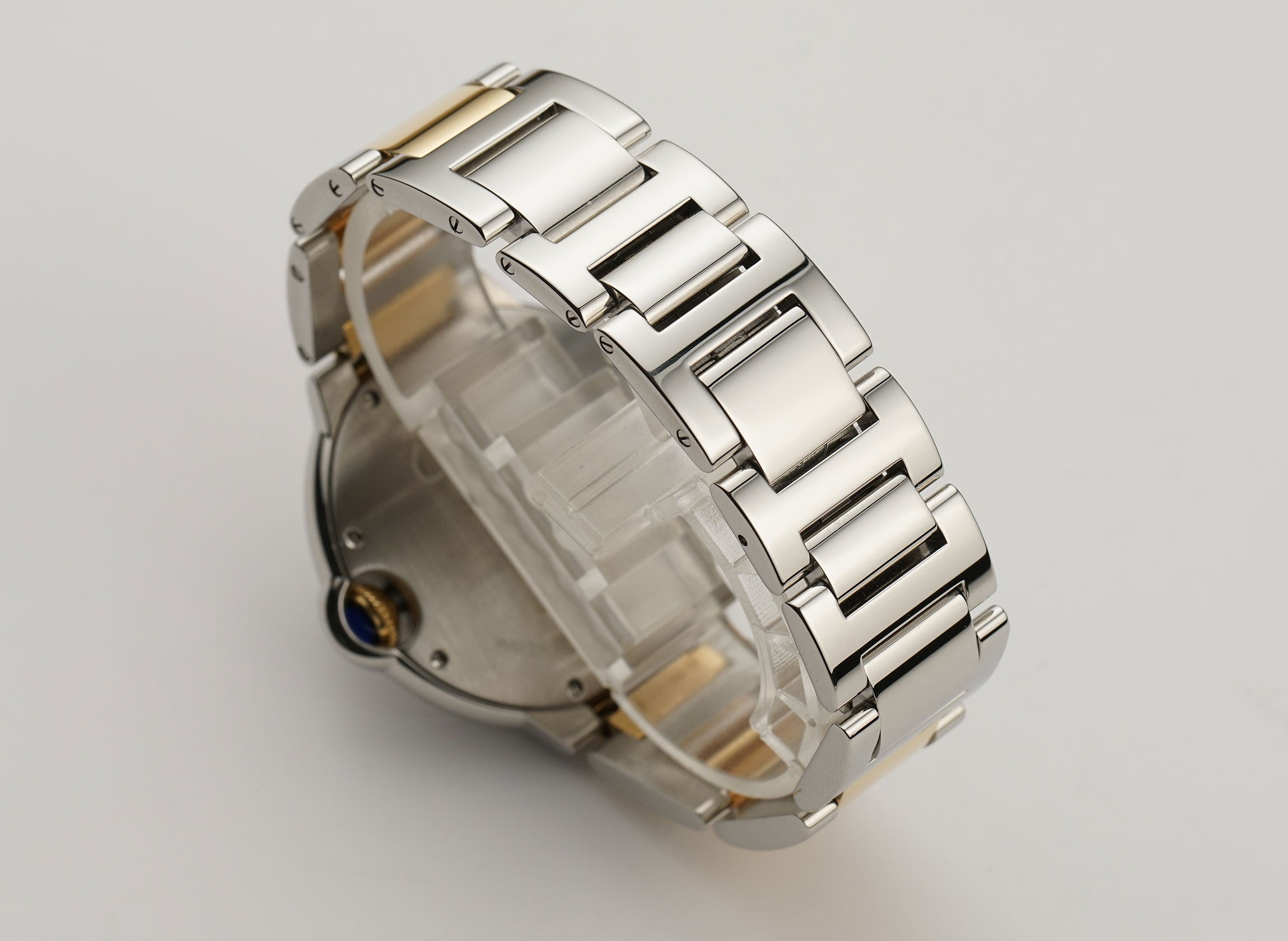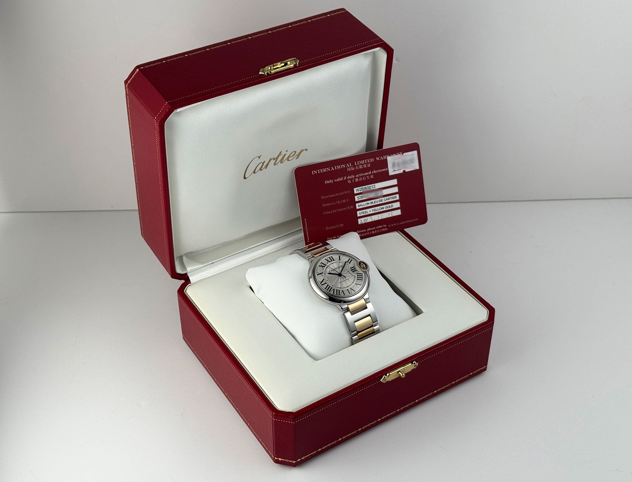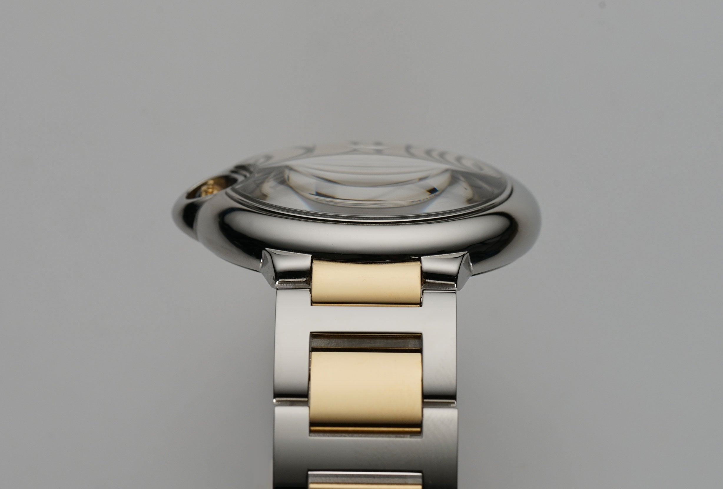 This Cartier Ballon Bleu two-tone 3284 is in excellent condition for a previously worn watch. The case does have areas of mirror-like finish which are prone to hairlines (marks visible when with high resolution cameras or if angled at certain lighting). Pictures are part of the description so please refer to the pictures in determining the condition, pictures are of the exact watch being offered.