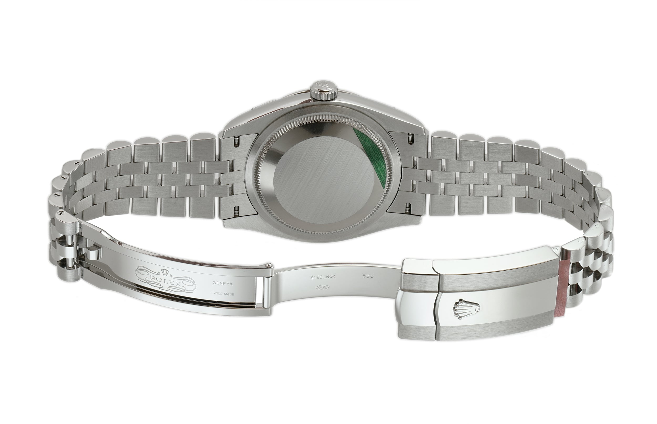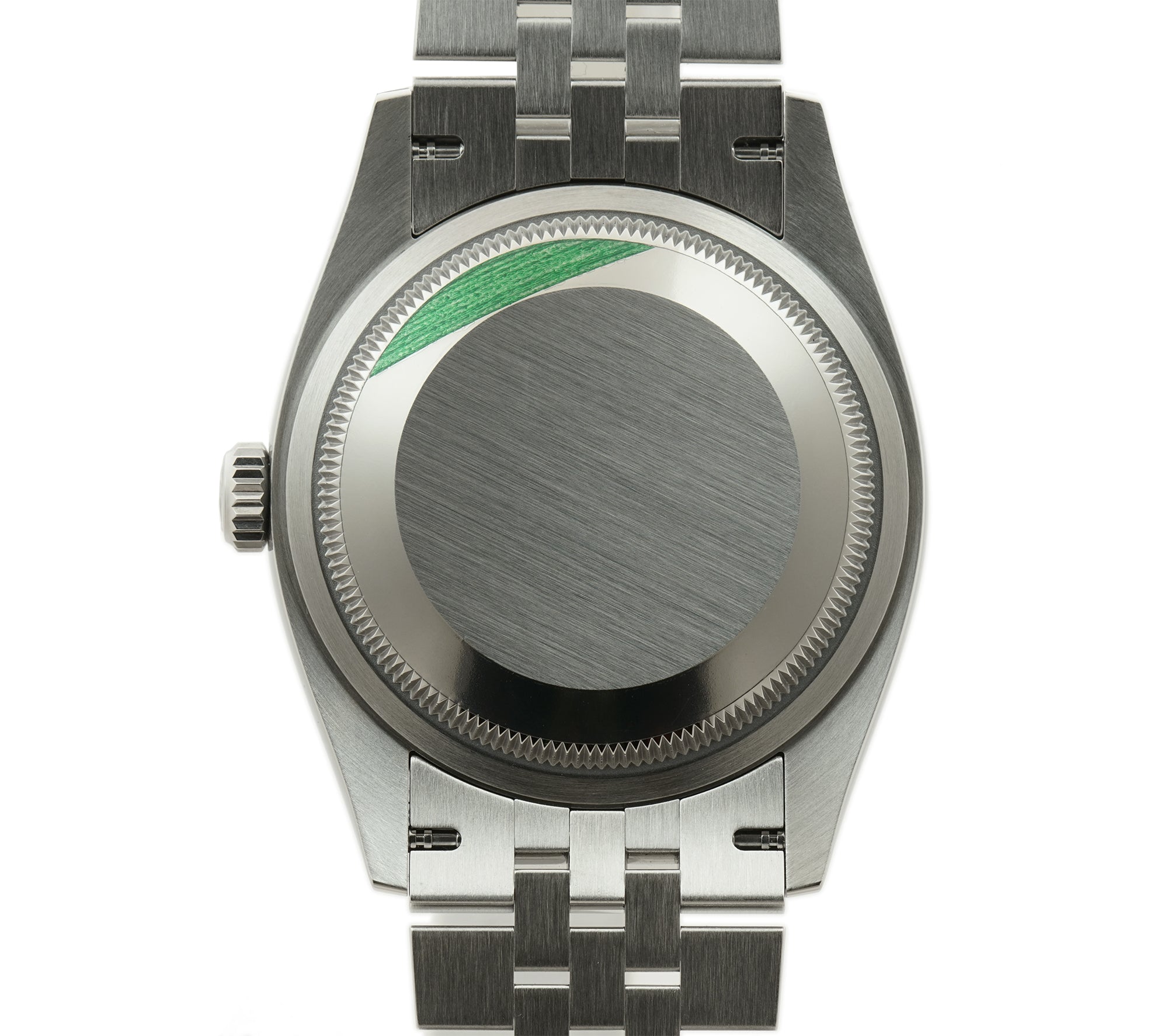 Case is made of stainless steel most of which is high-polish finished with the exception of the back of the lugs and center of the case back. Mounted atop the case is a high-polish finished 18k white gold fluted bezel. Crown and case back are both screw-down. As for the jubilee bracelet, it is stainless steel as well but with high-polish finished center links and brush-finished outer links.