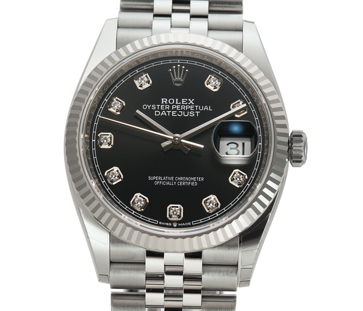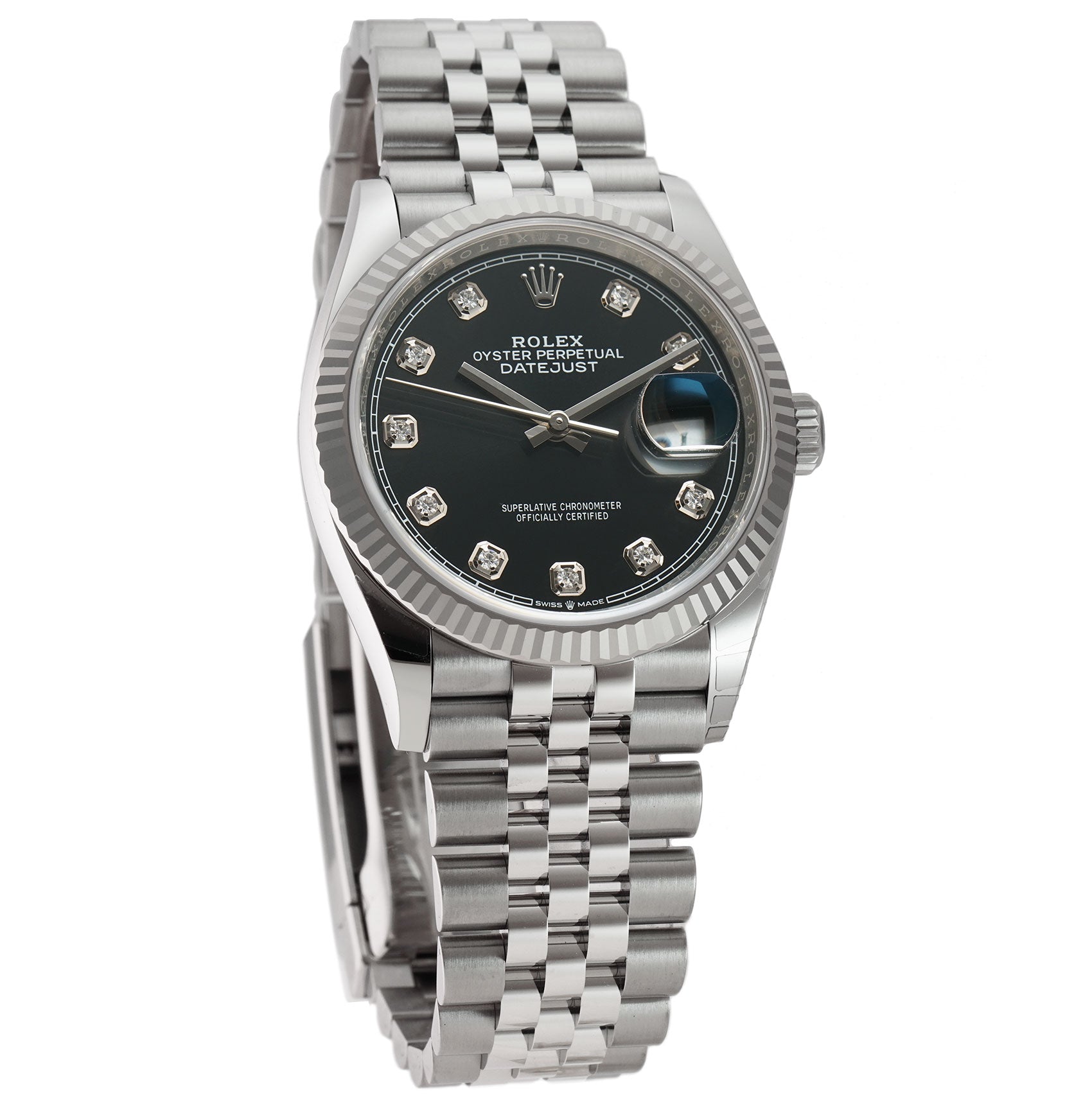 36mm Steel Black Diamond Dial 18k Fluted Bezel Jubilee Bracelet