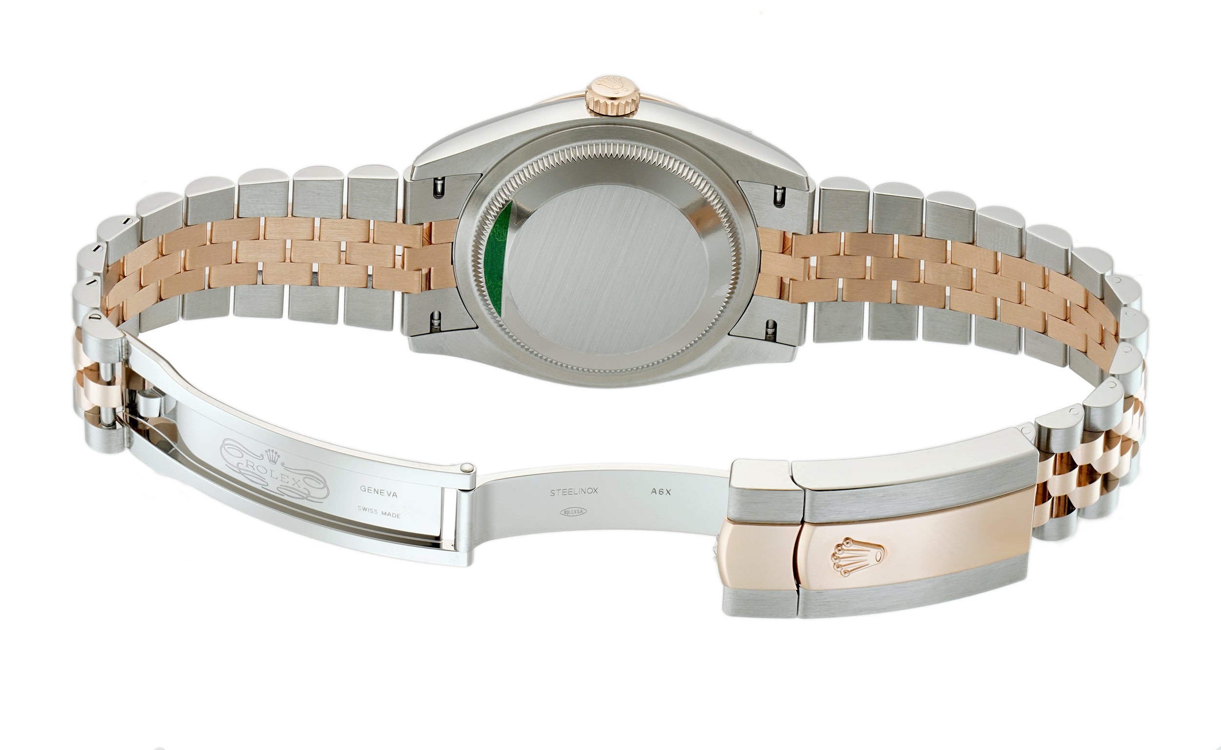 Case is made of high-polish finished stainless steel with the exception of the case back which is combination of satin-finished and high-polish stainless steel. Mounted atop is a fluted 18k everose gold bezel. The jubilee bracelet is of 18k everose gold high-polish finished center links and stainless steel satin-finished outer links.