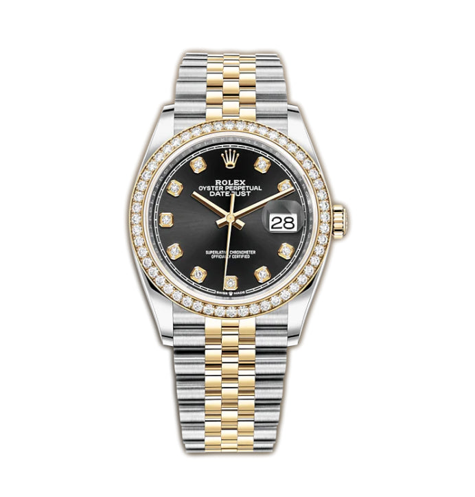 The dial is a black set with 10 original Rolex factory diamonds, and features a date window at the three-o'clock position. The outer edge of the dial features an index minute track, and the hands are gold-toned. Mounted to the watch is a steel and 18k yellow gold jubilee bracelet closed by folding clasp.